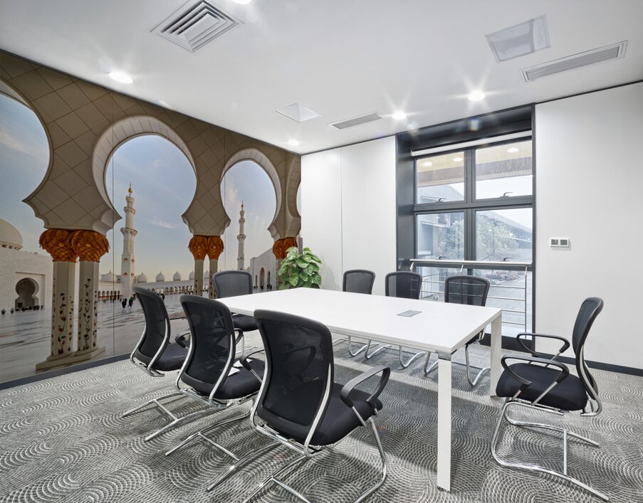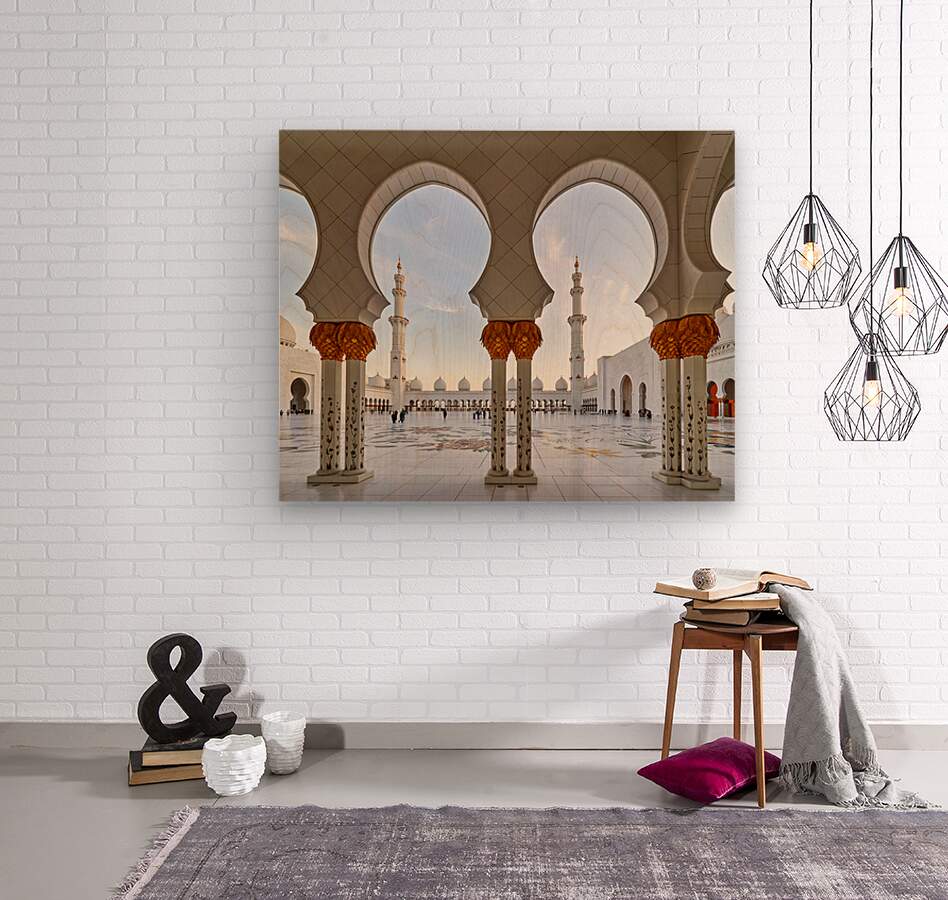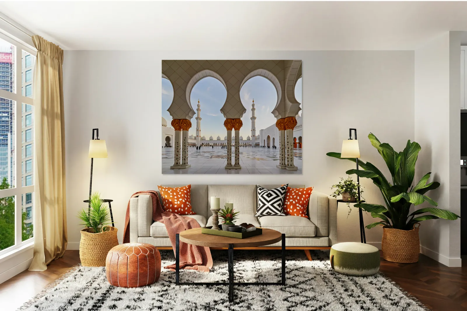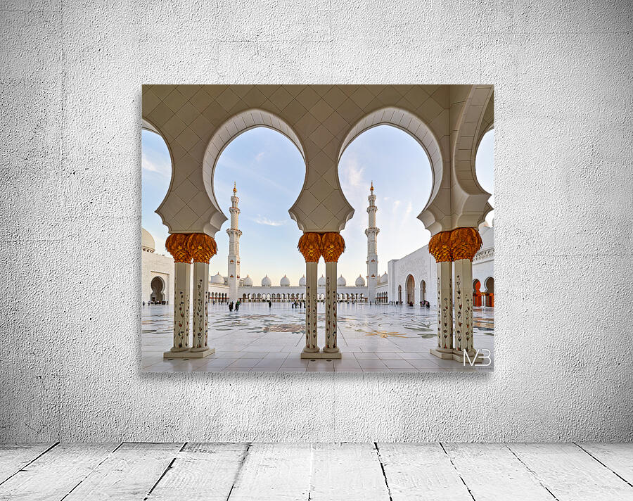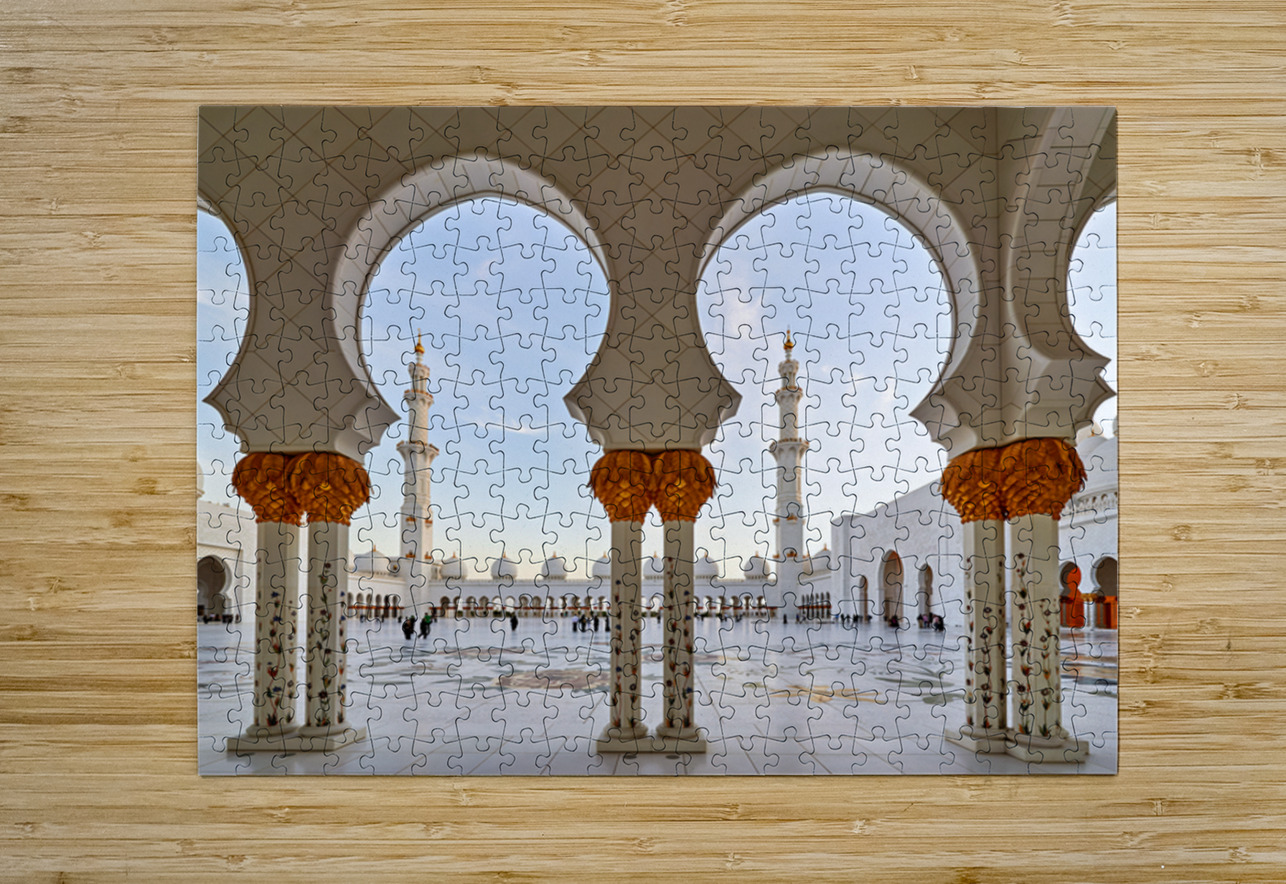 People walk through the courtyard of Sheikh Zayed Grand Mosque in Abu Dhabi during sunset. The unique architecture stands tall around them.