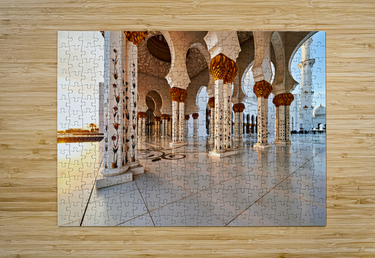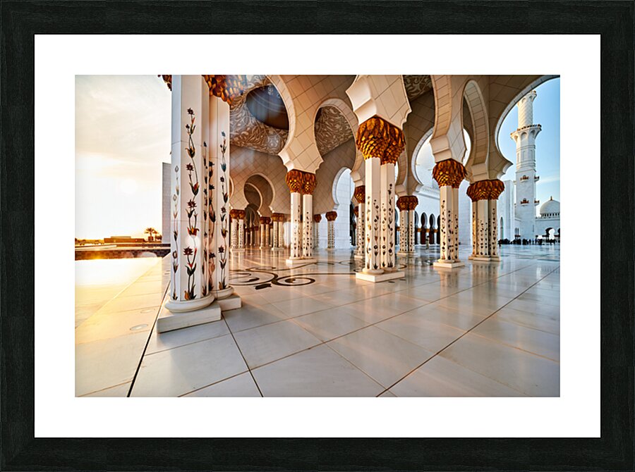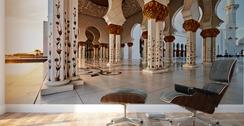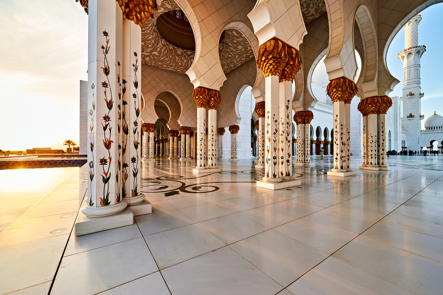 Visitors explore the Sheikh Zayed Grand Mosque in Abu Dhabi at sunset. The grand pillars and architecture create a unique setting for everyone.