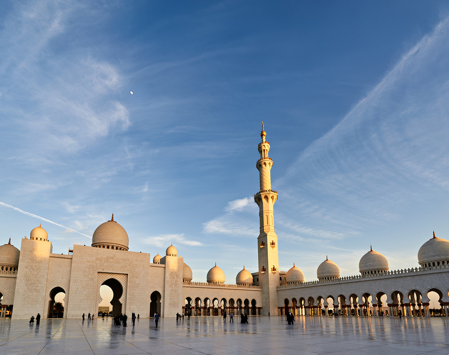 People walk around the Sheikh Zayed Grand Mosque in Abu Dhabi during the evening. The sky shows signs of sunset behind the structure.