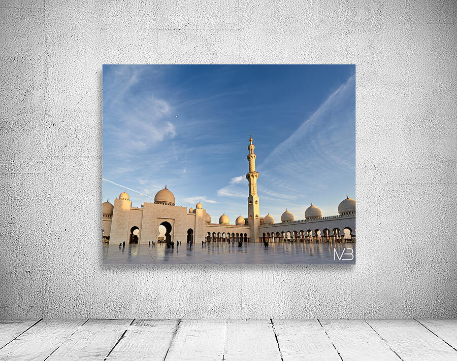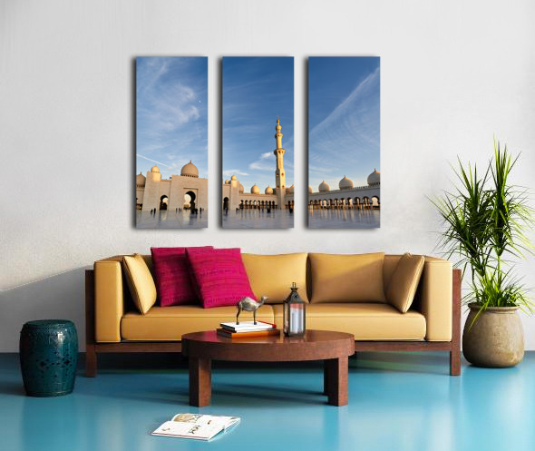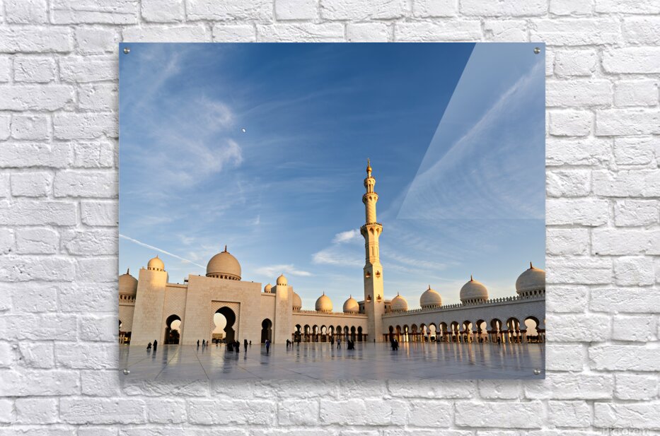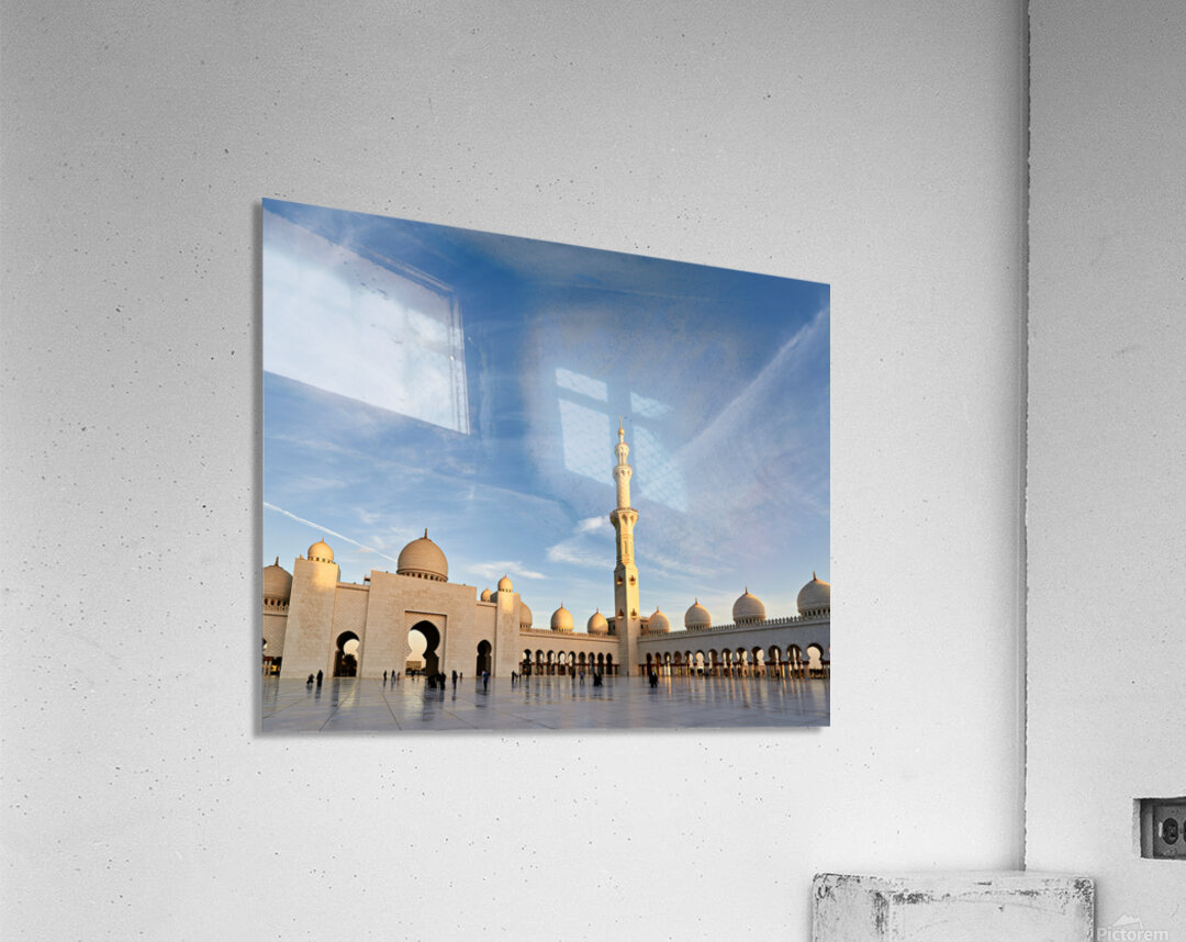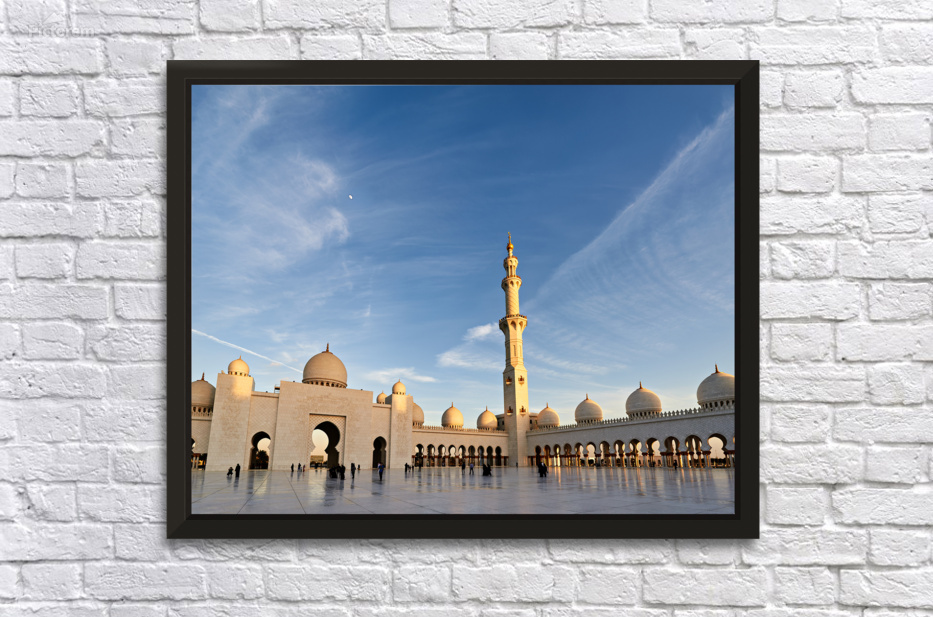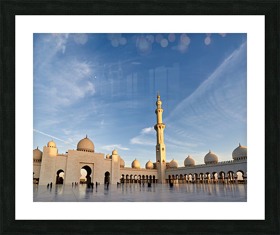 "Visitors explore Sheikh Zayed Grand Mosque in Abu Dhabi" in a framed print.