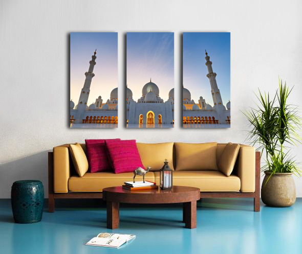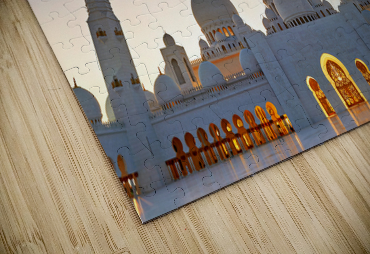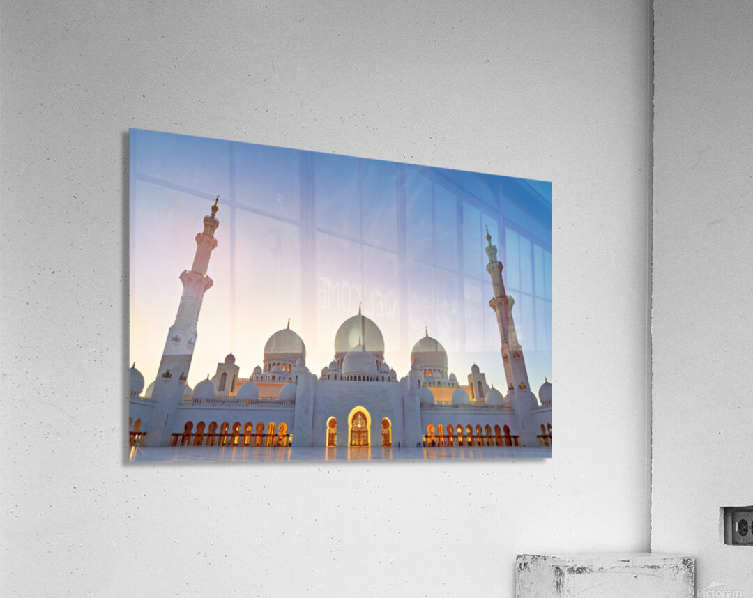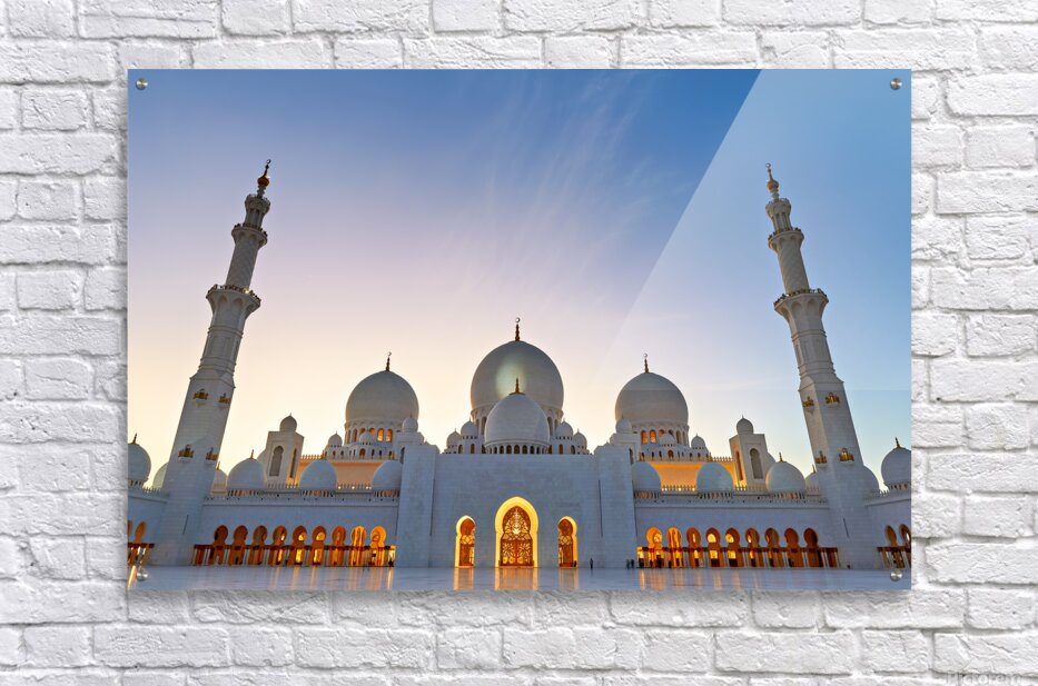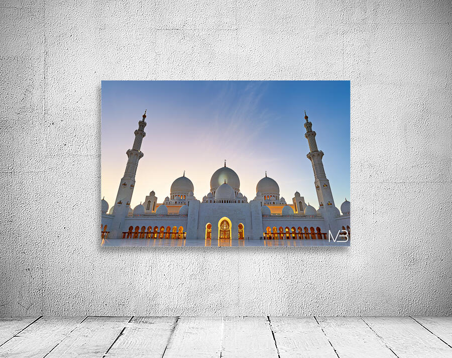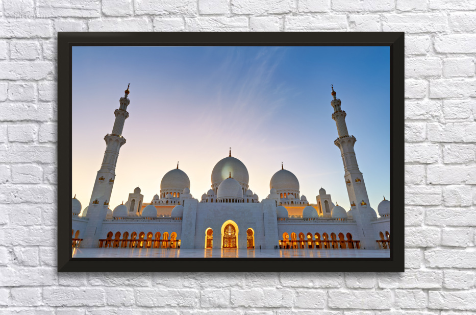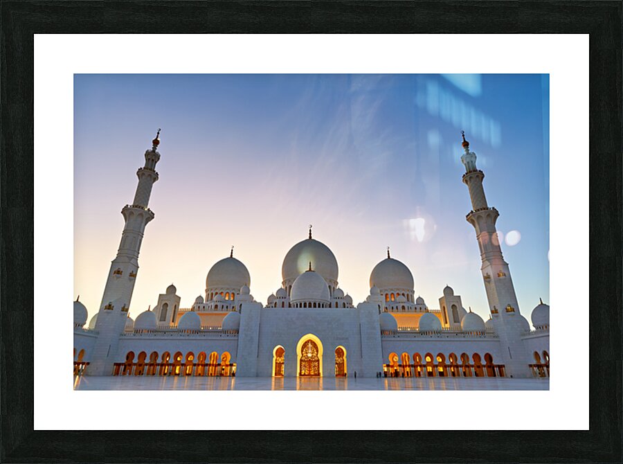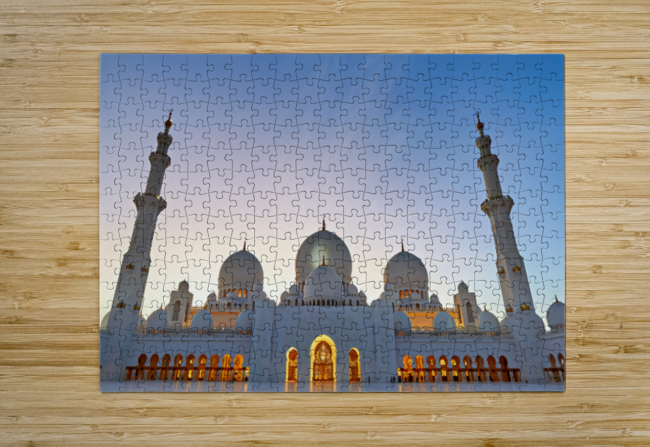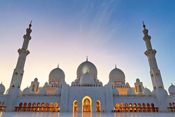 Sheikh Zayed Grand Mosque stands tall as evening sets in showcasing its architecture against the twilight sky in Abu Dhabi.