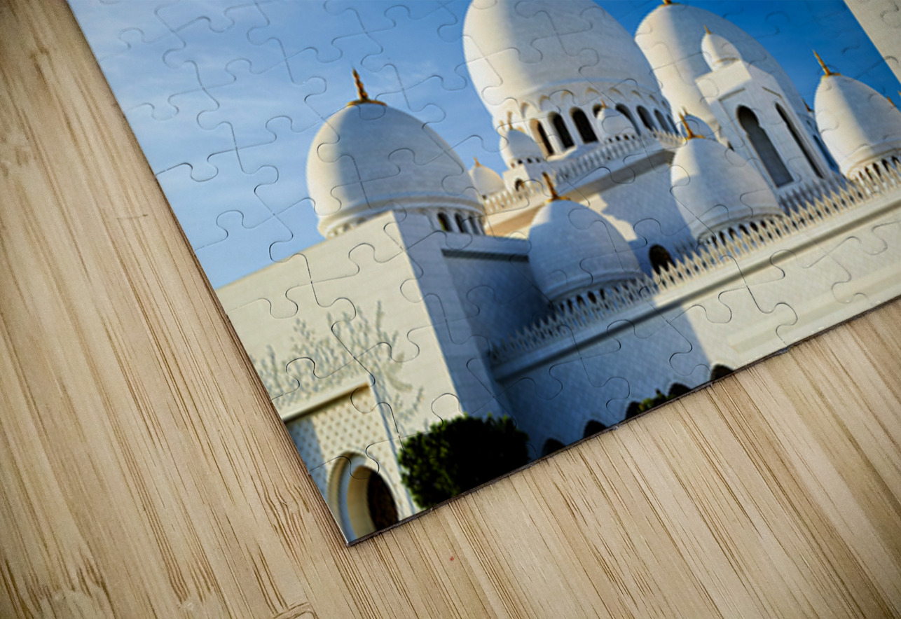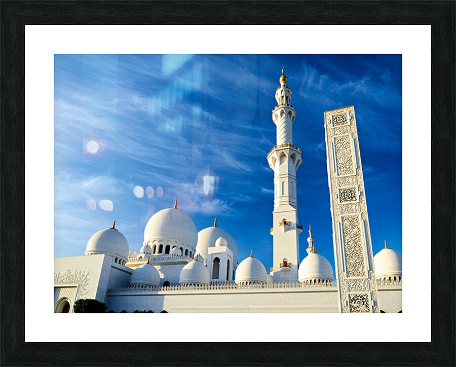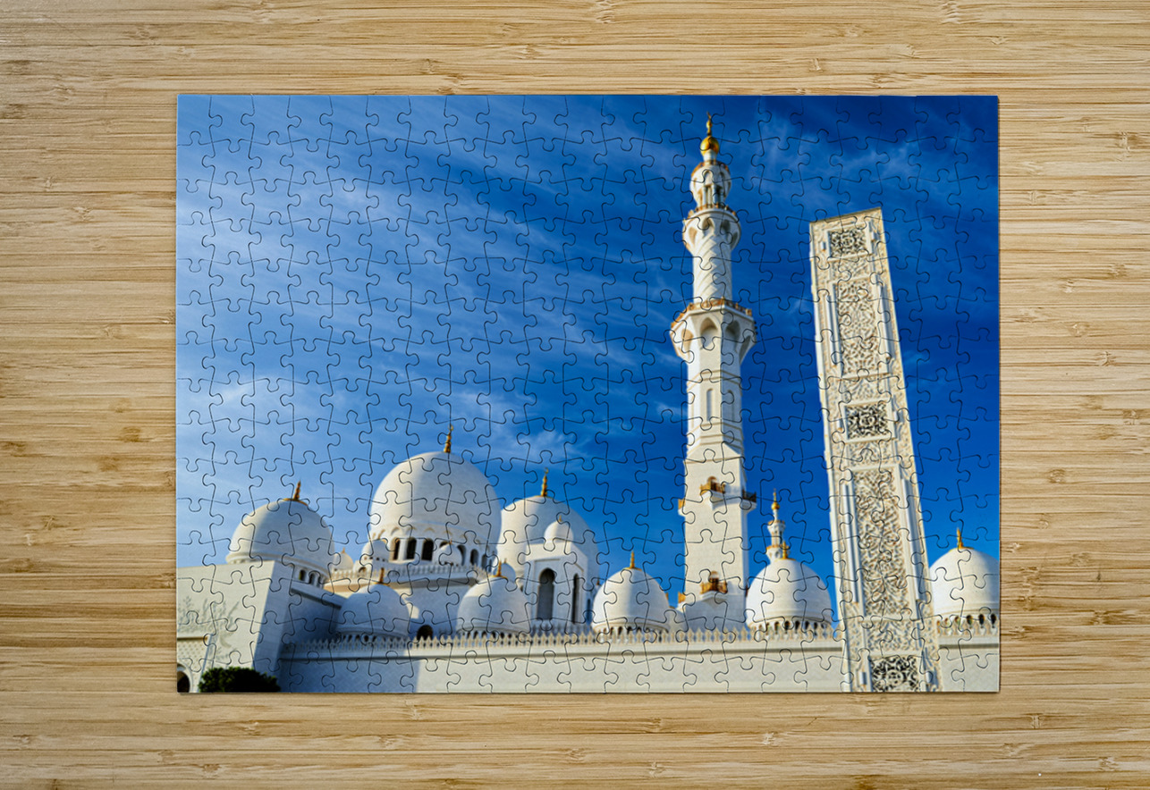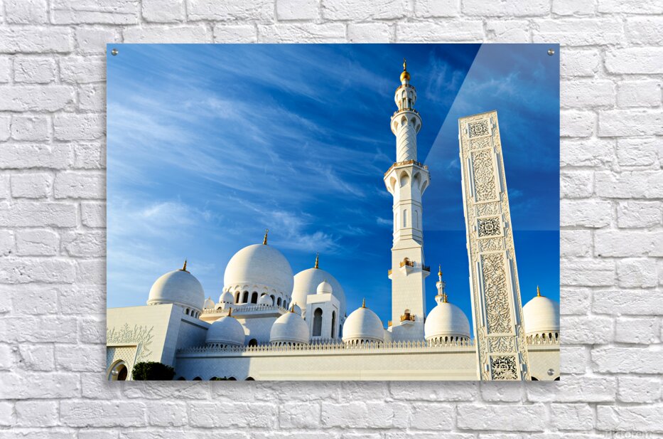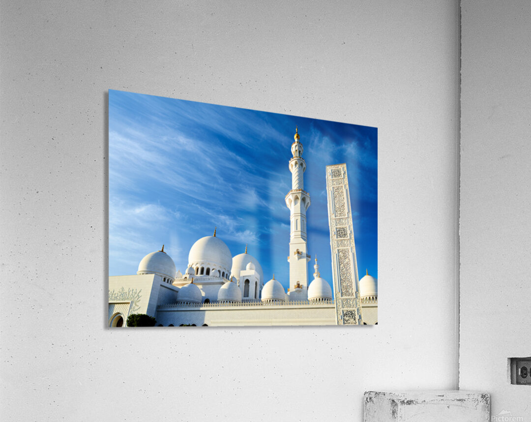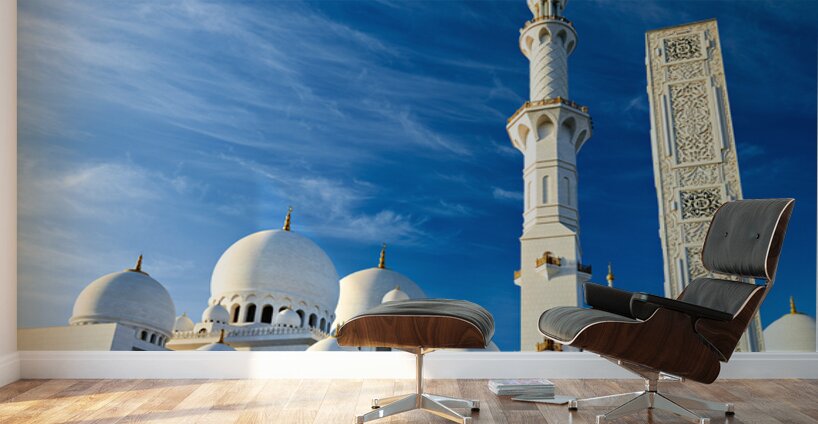 Visitors explore the large mosque in Abu Dhabi. The building features several domes and a tall minaret under a blue sky.