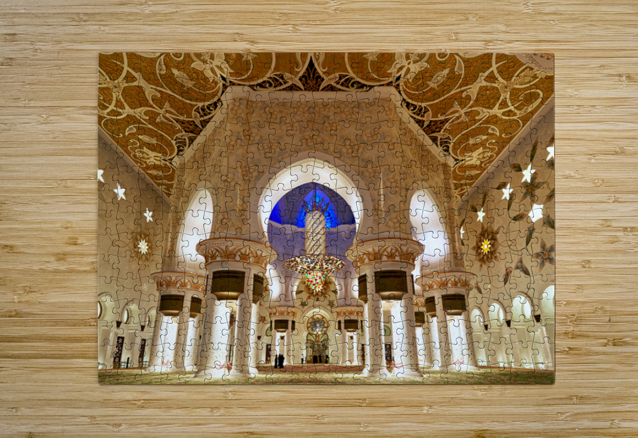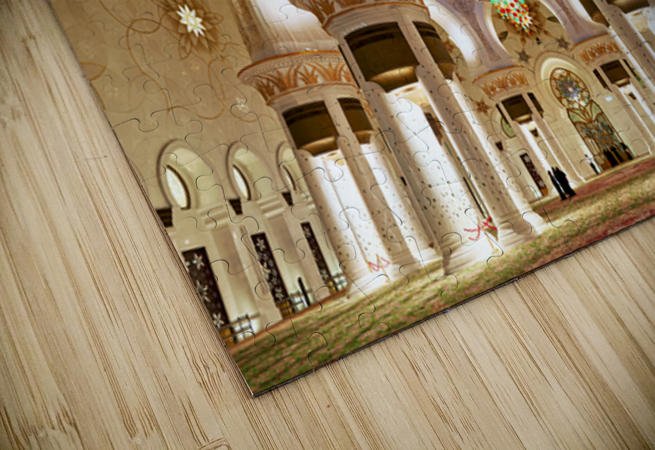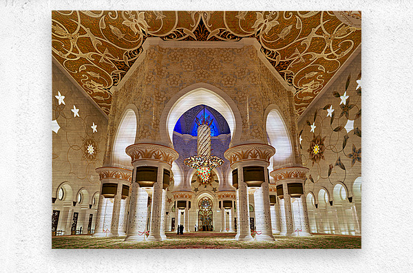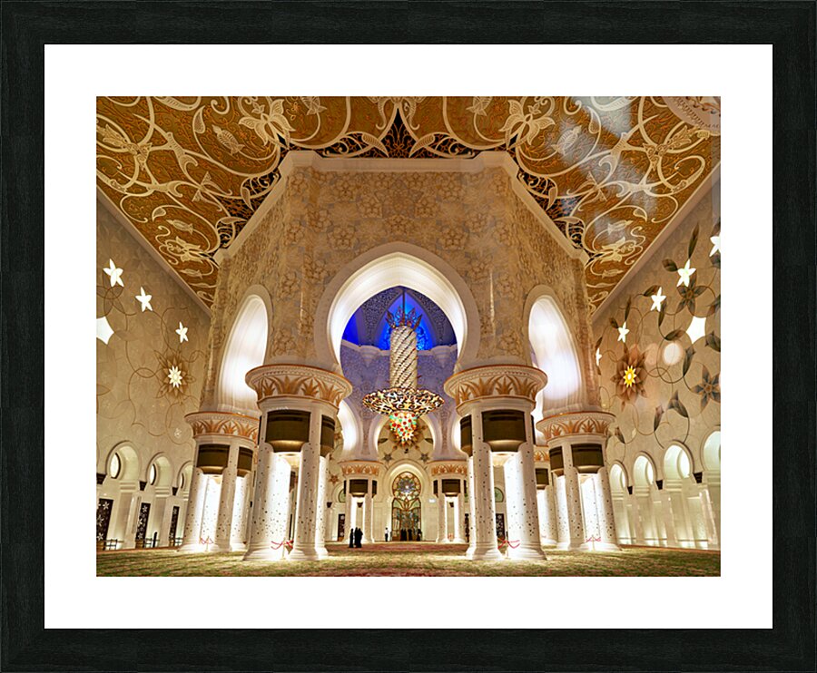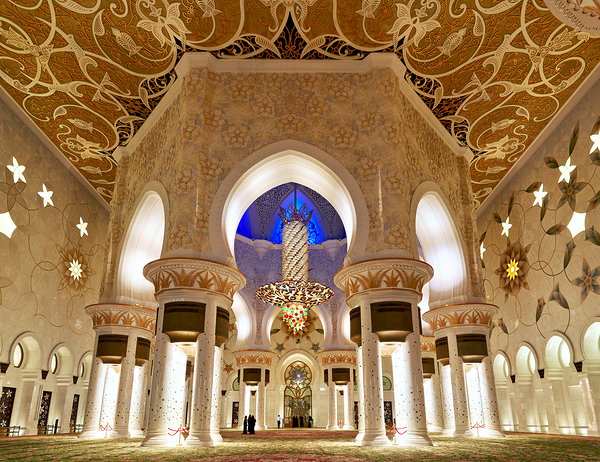 People walk through the beautifully lit interior of Sheikh Zayed Grand Mosque in Abu Dhabi while admiring the intricate designs and architecture.