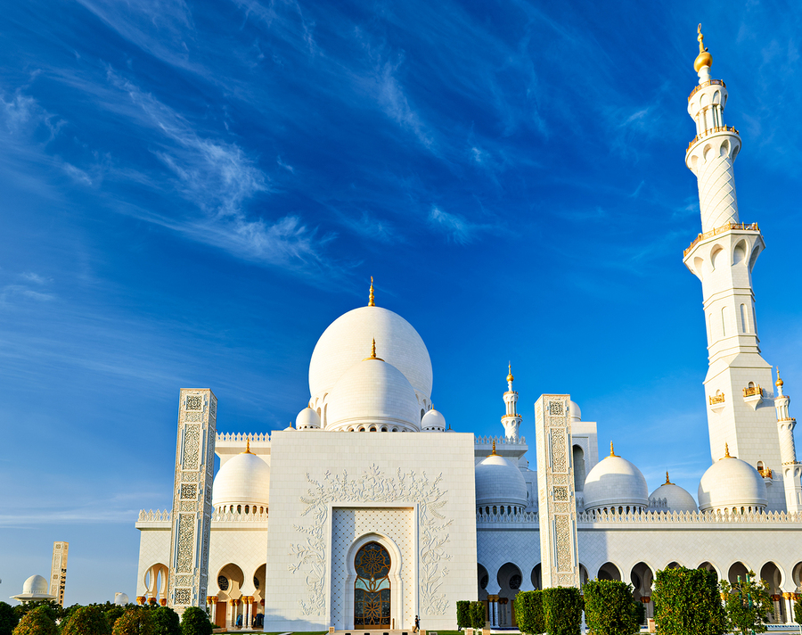 A mosque in Abu Dhabi features large domes and a tall minaret against a clear blue sky. People visit the site to admire its design.