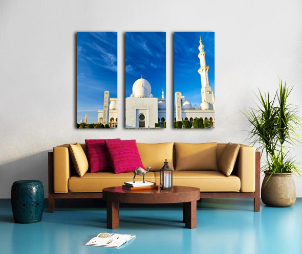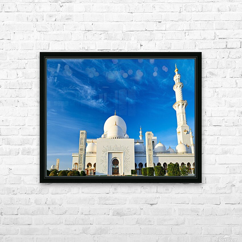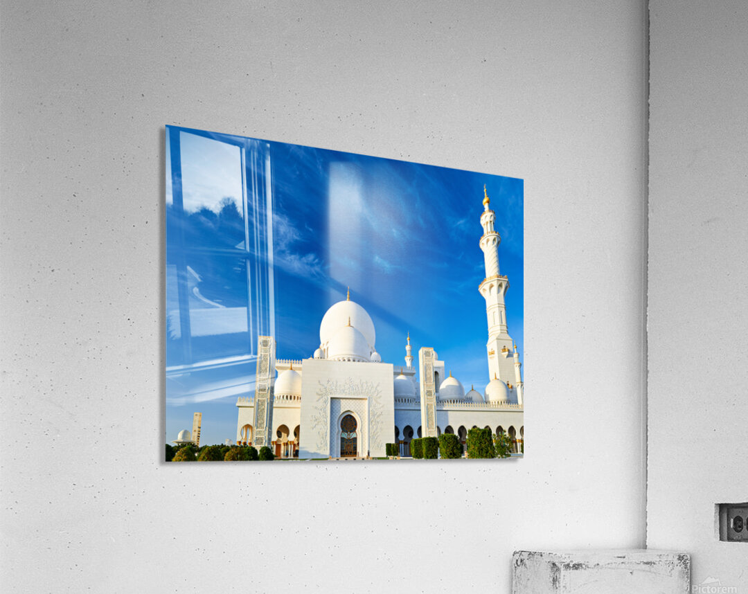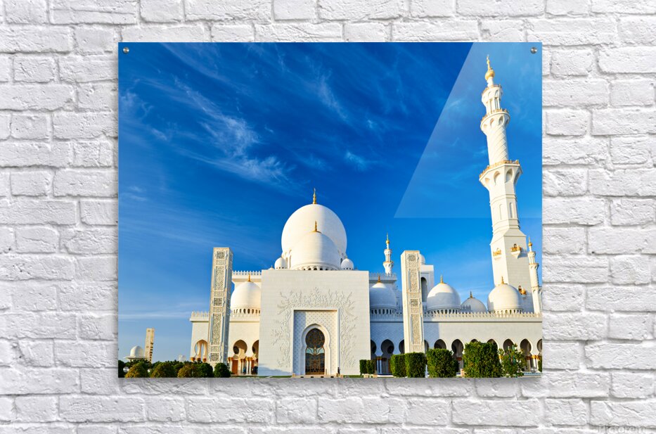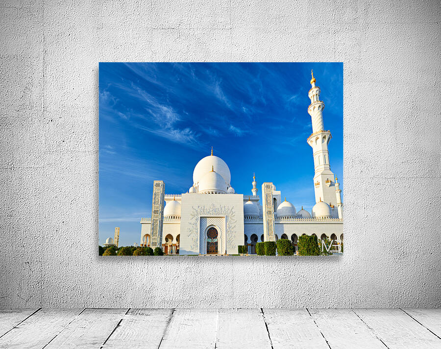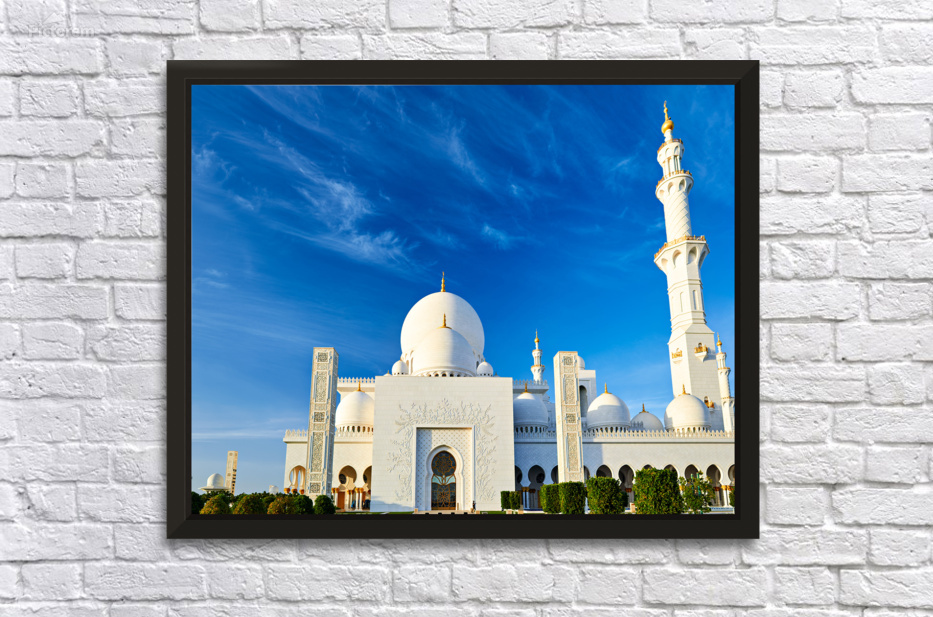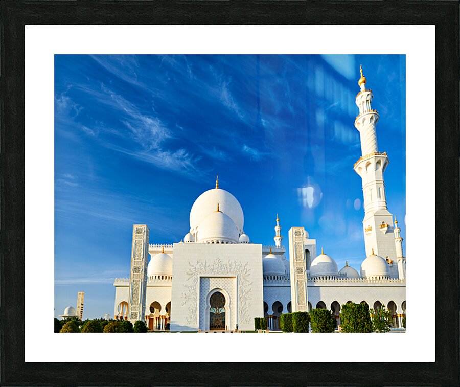 "Abu Dhabi mosque stands tall under blue sky" in a framed print.