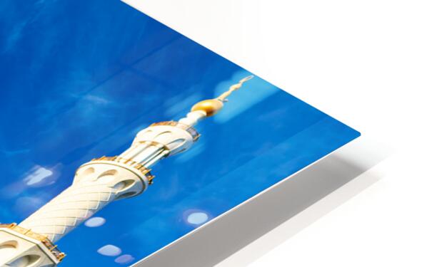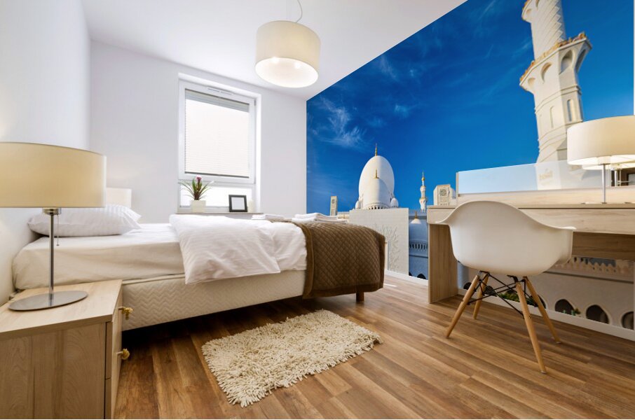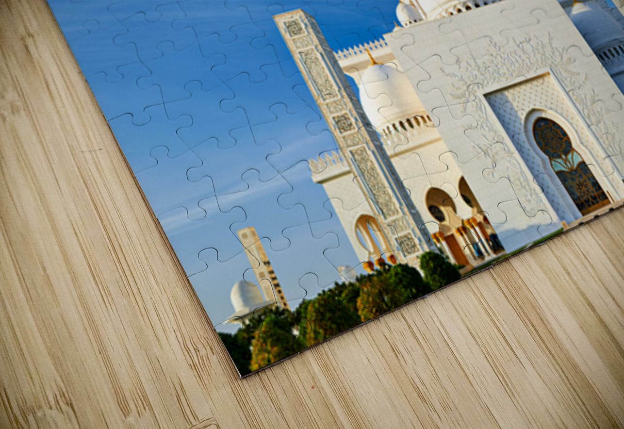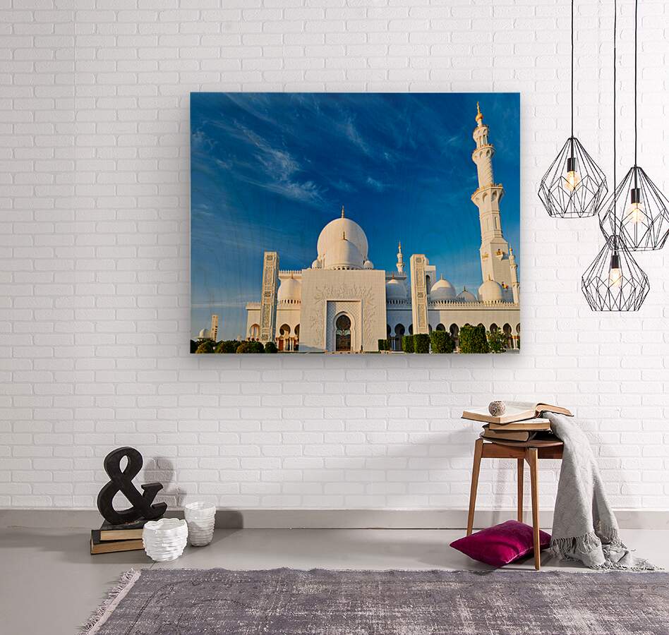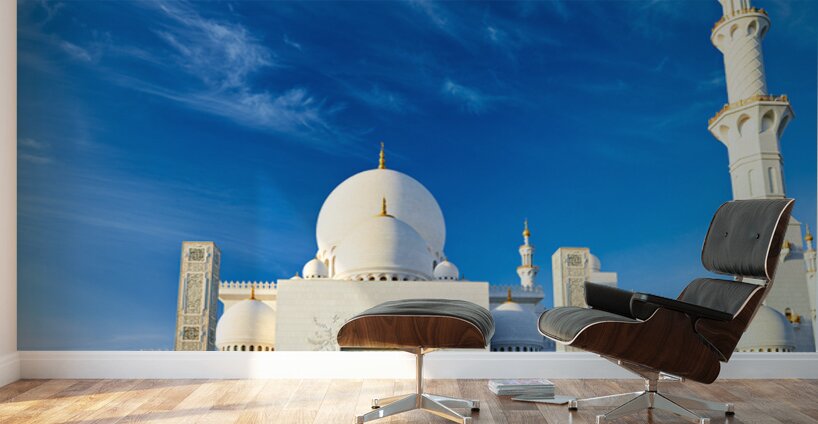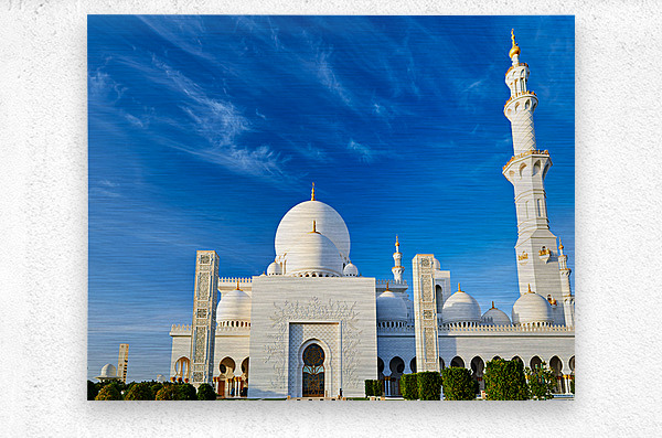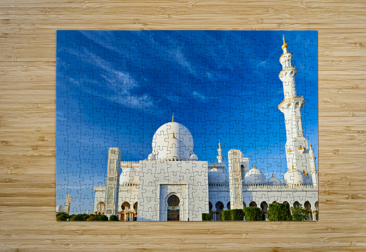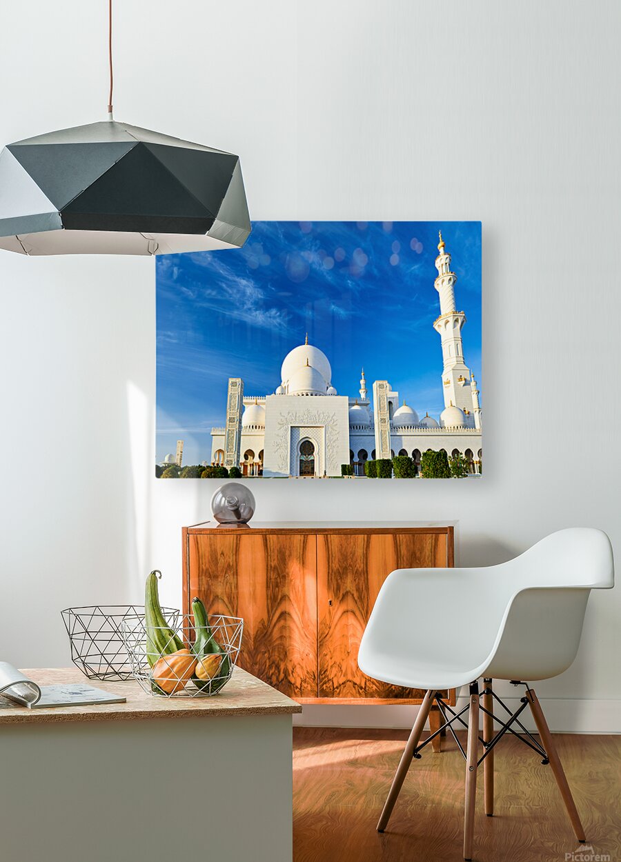 "Abu Dhabi mosque stands tall under blue sky" in a framed print.