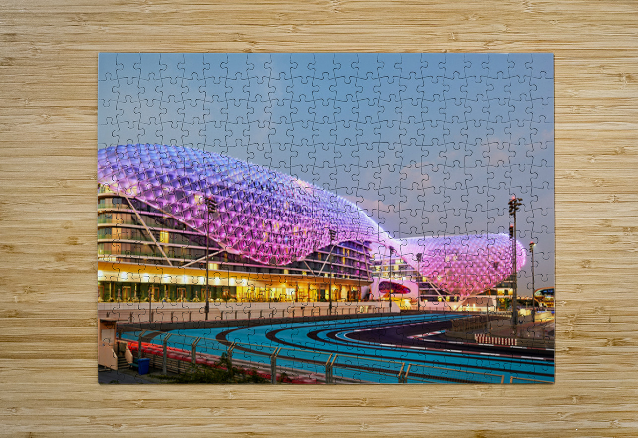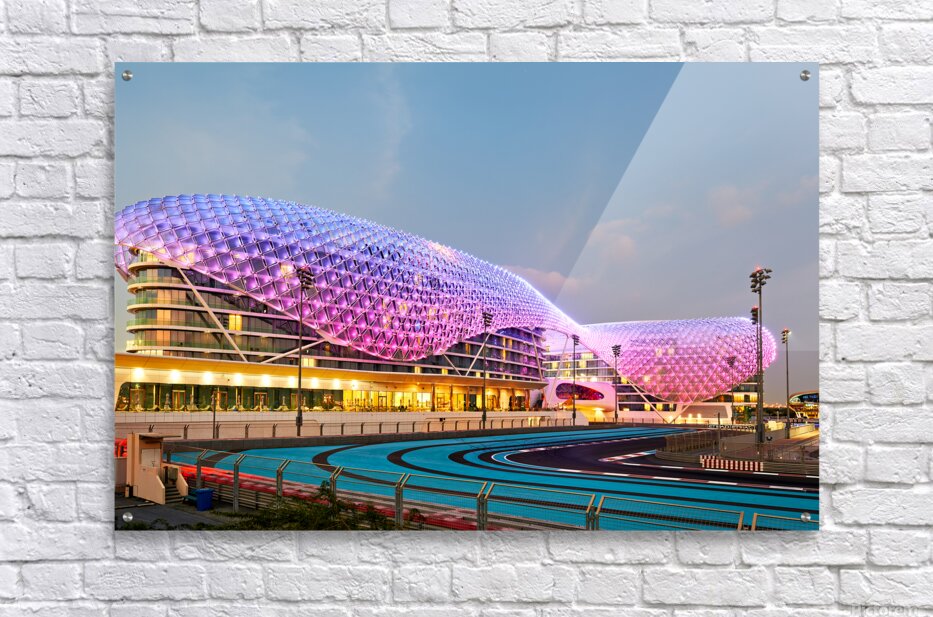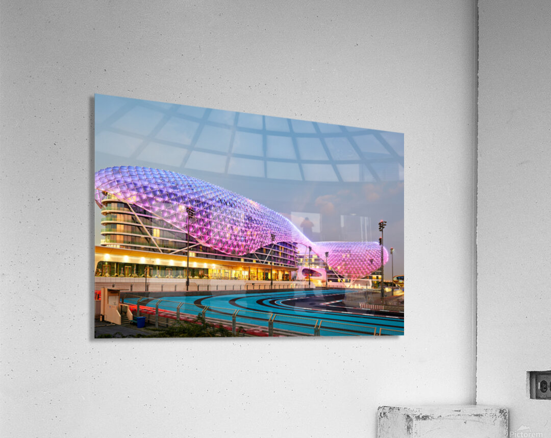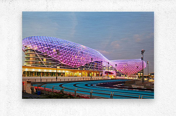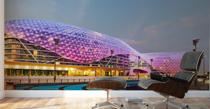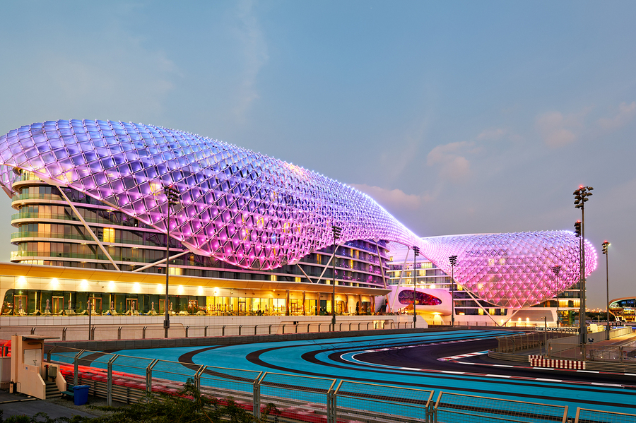 The W Abu Dhabi hotel stands out at Yas Island with bright lights as night approaches. Visitors enjoy the modern design and surroundings.