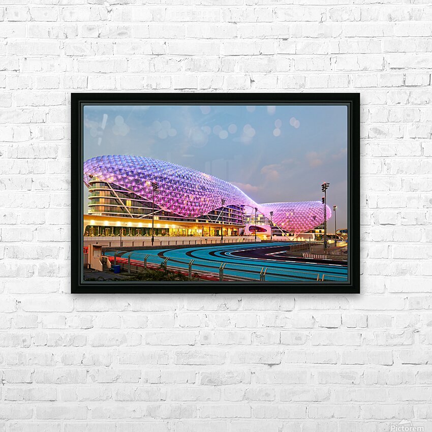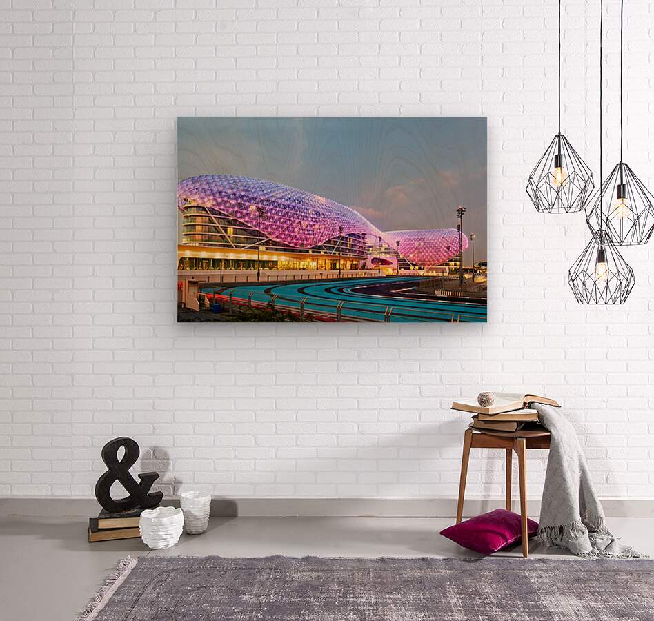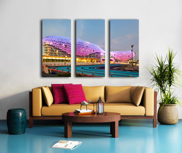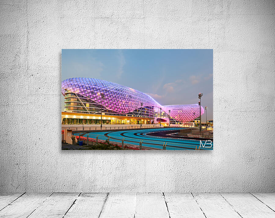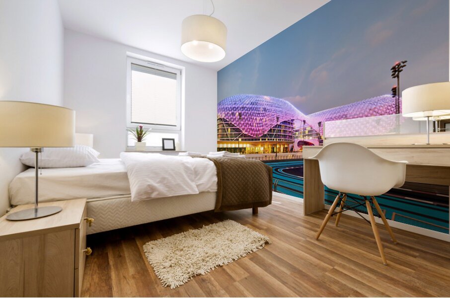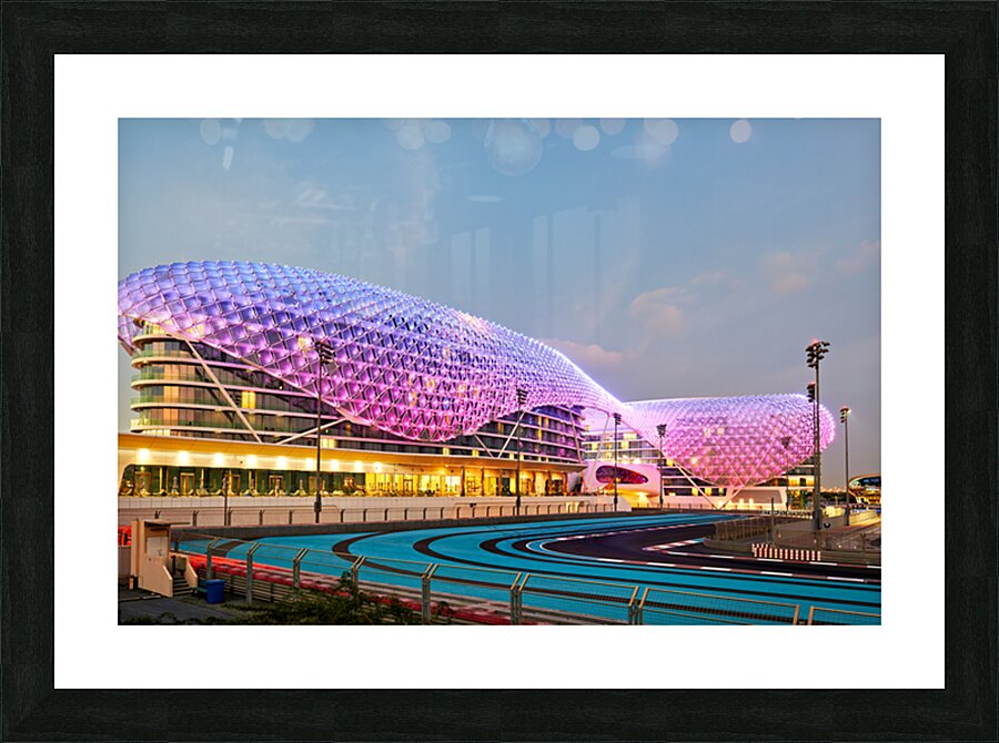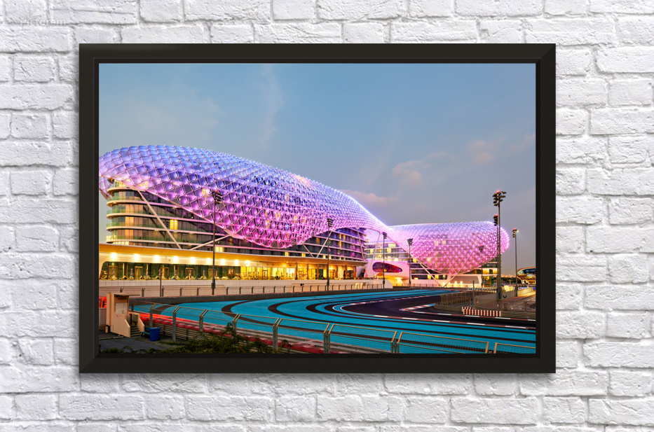The W Abu Dhabi hotel stands out at Yas Island with bright lights as night approaches. Visitors enjoy the modern design and surroundings.