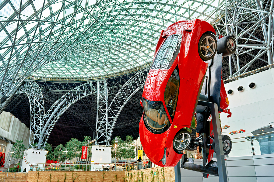 Guests explore Ferrari World in Abu Dhabi enjoying rides and attractions featuring Ferrari-themed experiences and exhibits indoors.