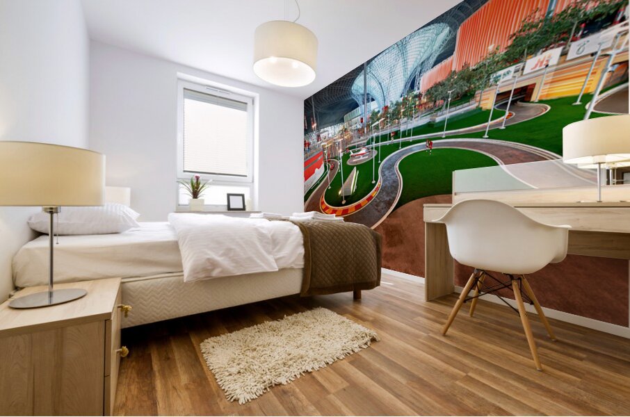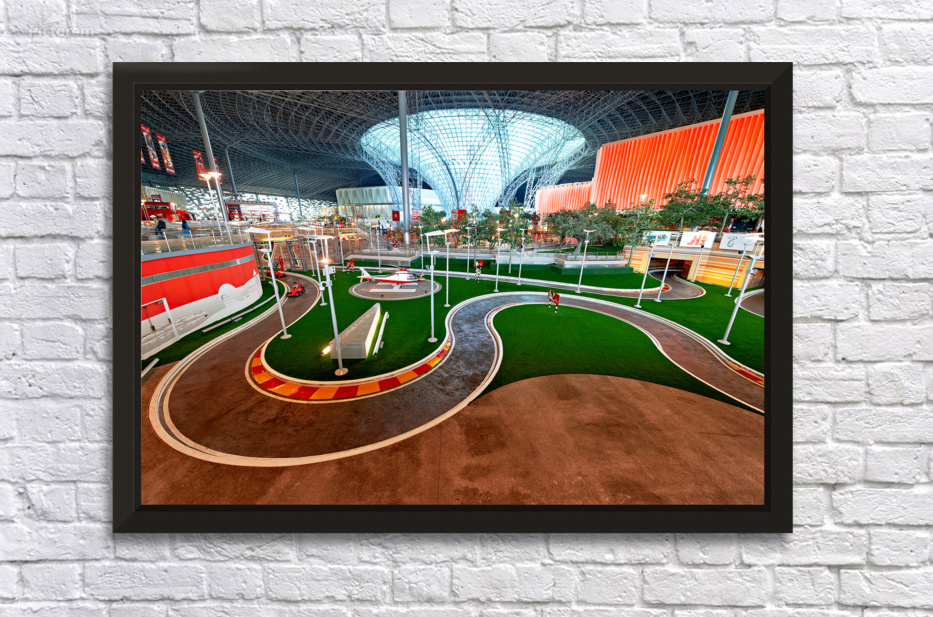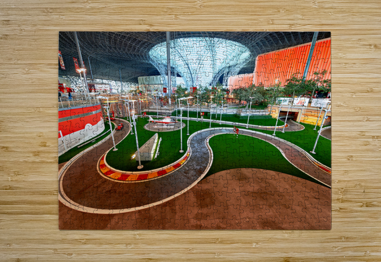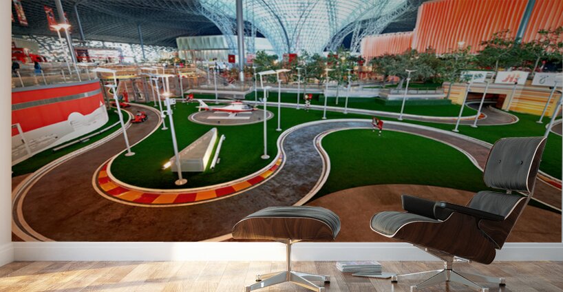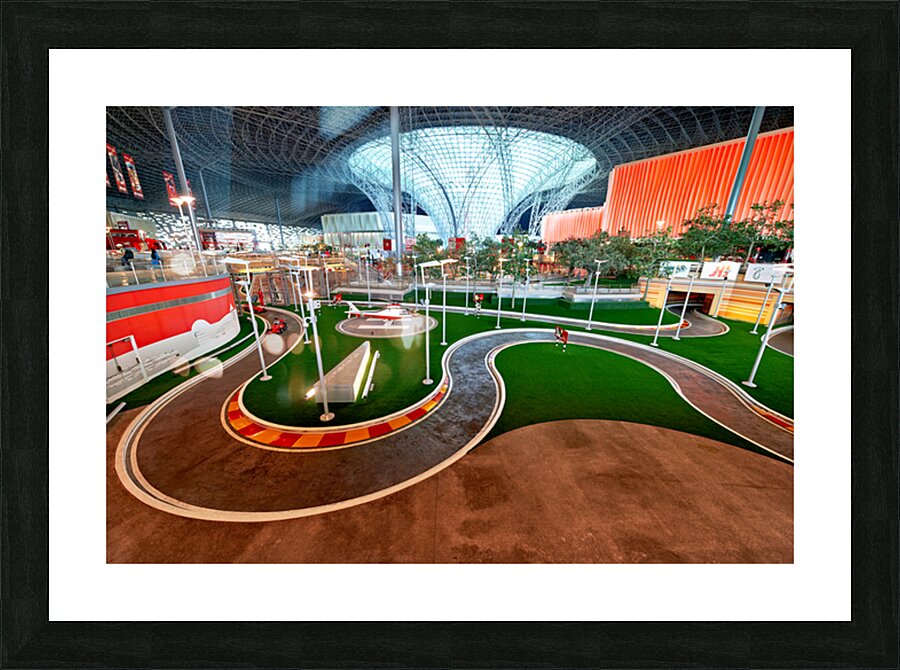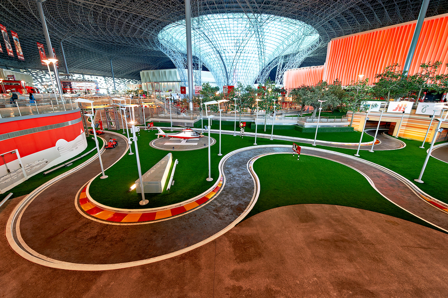 People enjoy the indoor racing track at Ferrari World in Abu Dhabi. The park has trees and colorful buildings that create a fun atmosphere.