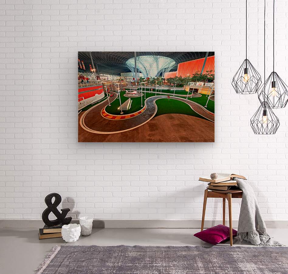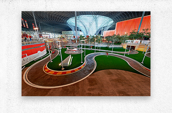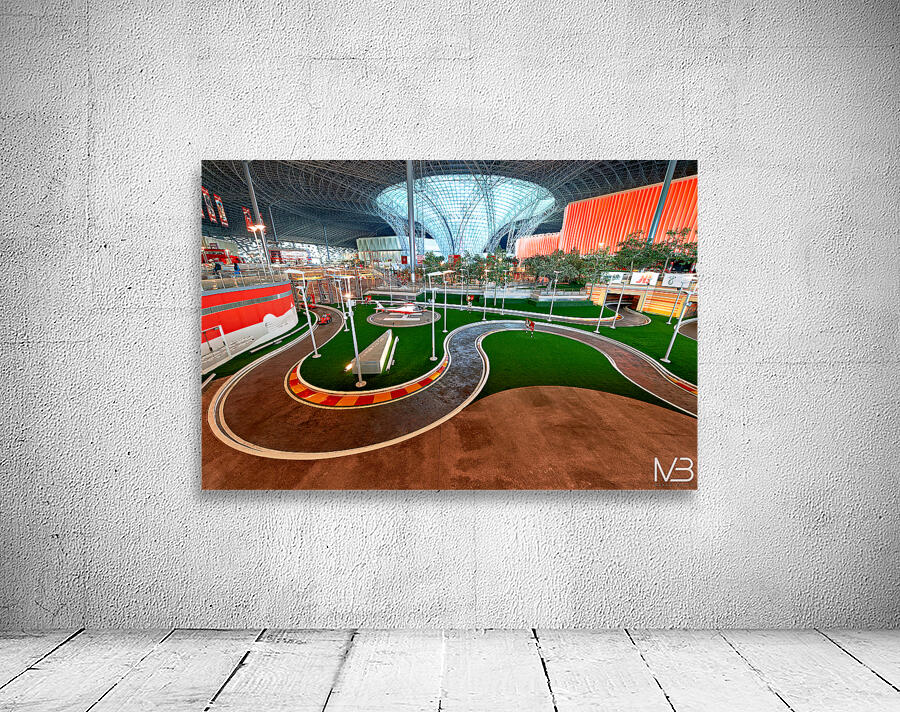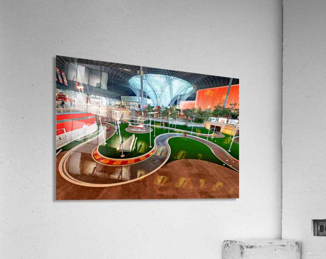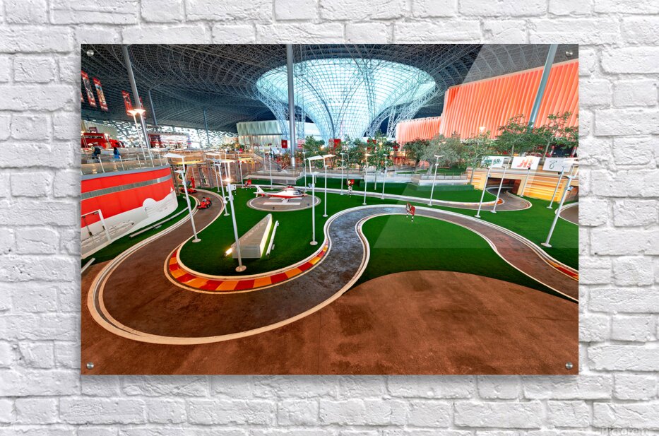 People enjoy the indoor racing track at Ferrari World in Abu Dhabi. The park has trees and colorful buildings that create a fun atmosphere.