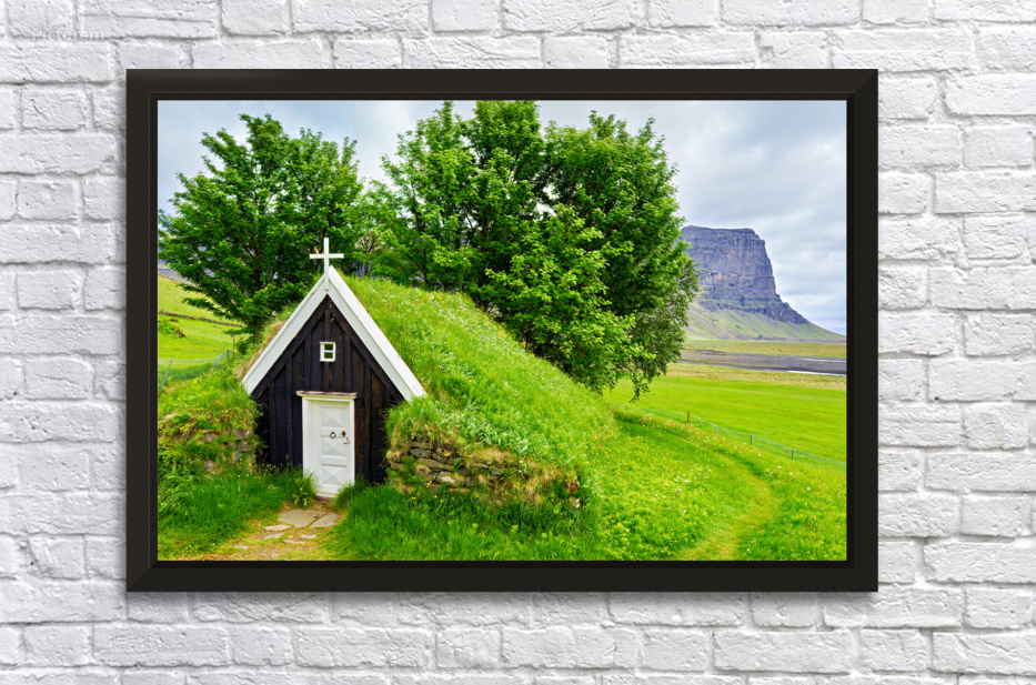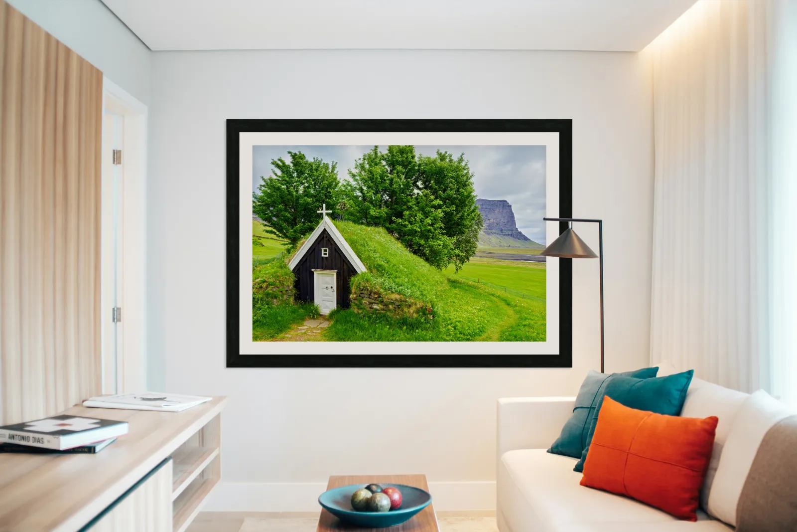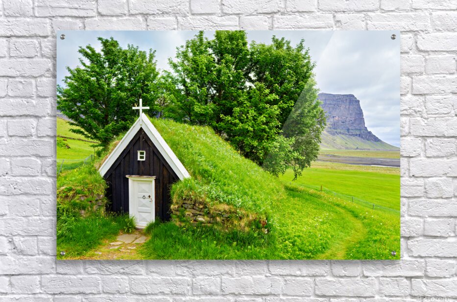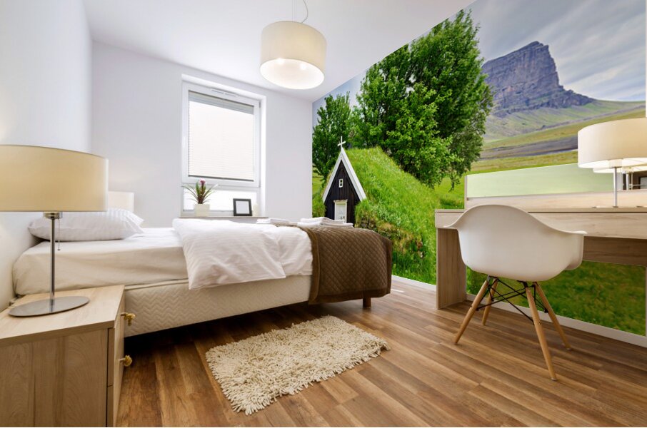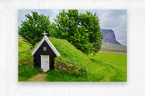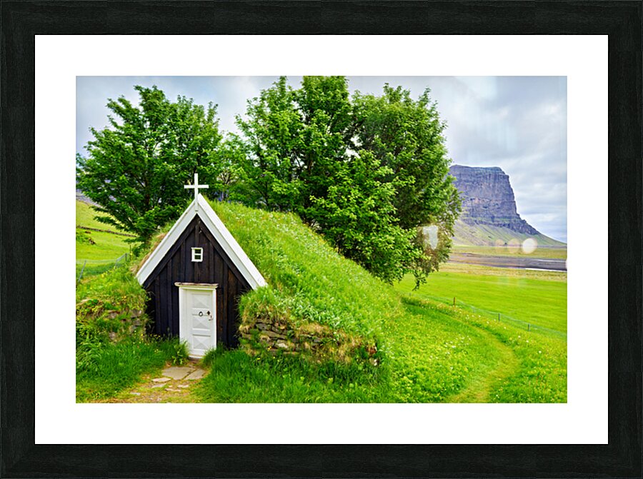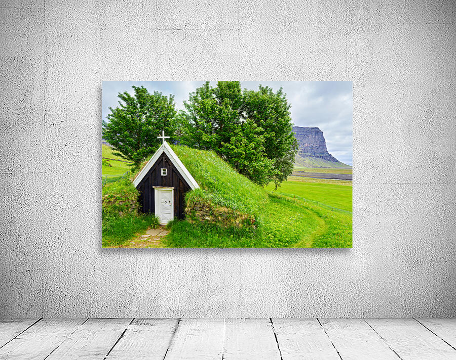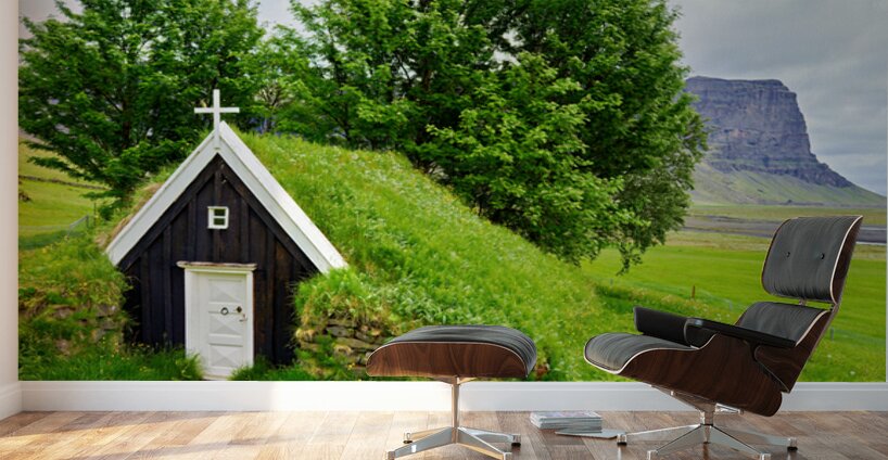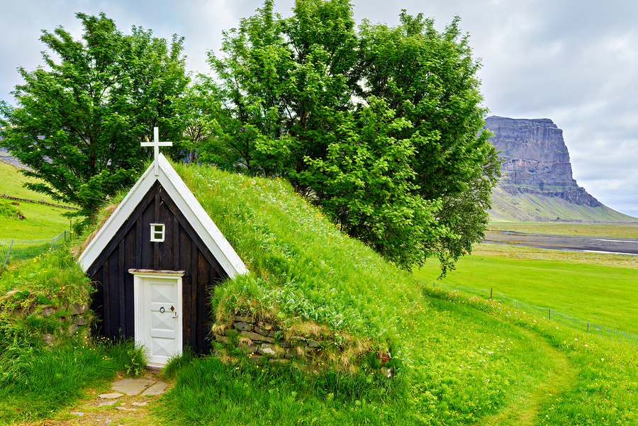 Nupsstadur turf church stands in Iceland surrounded by trees and mountains. Green grass covers its roof showing traditional building style.