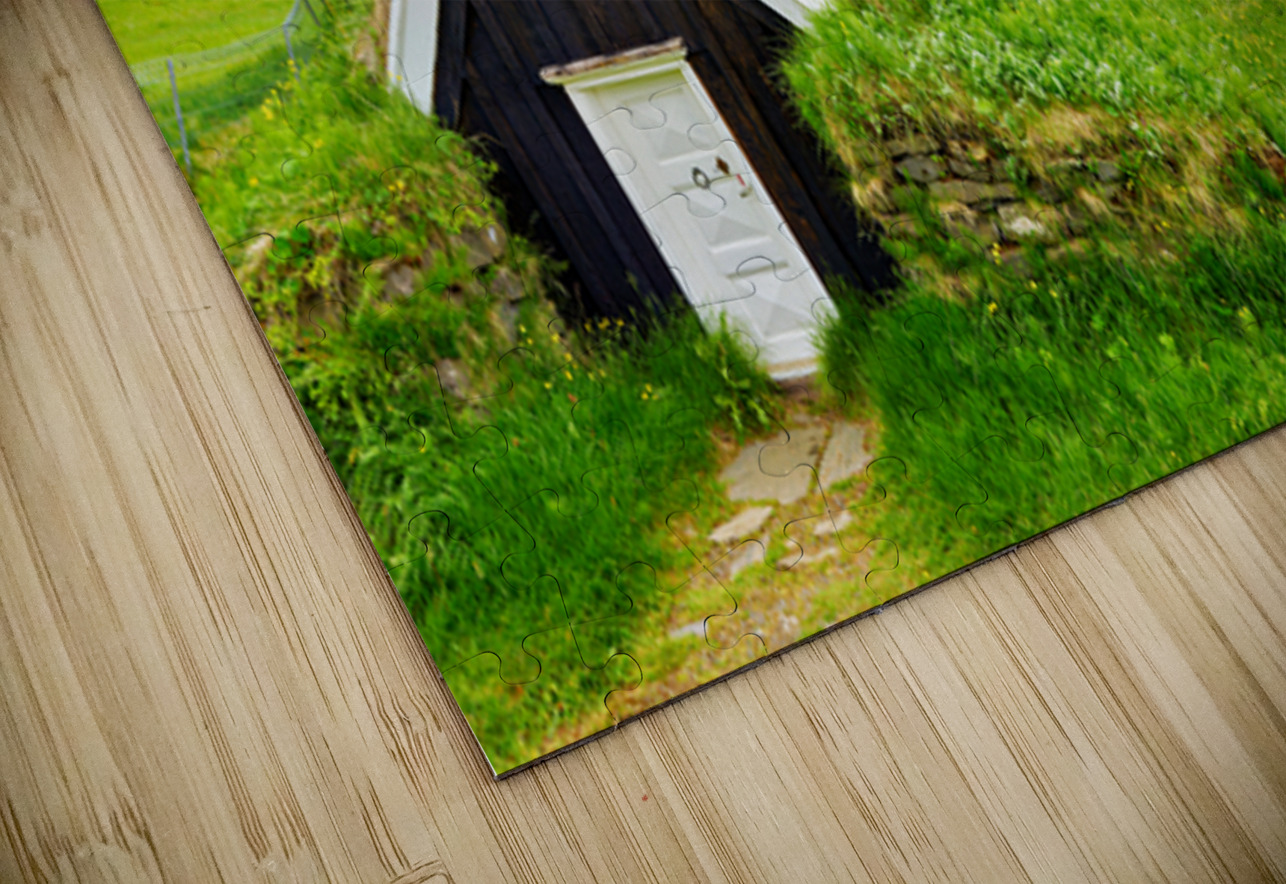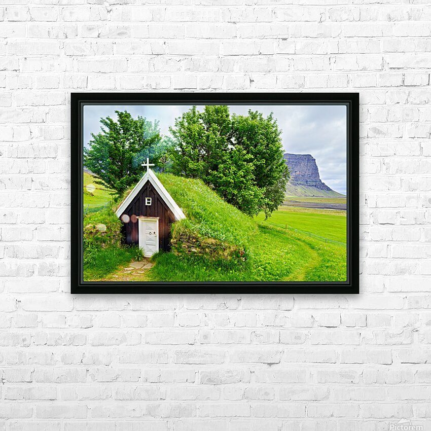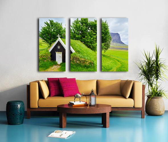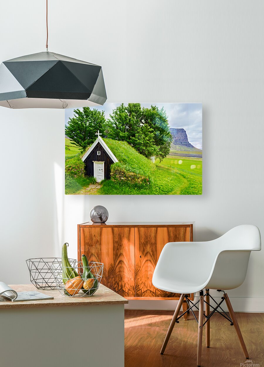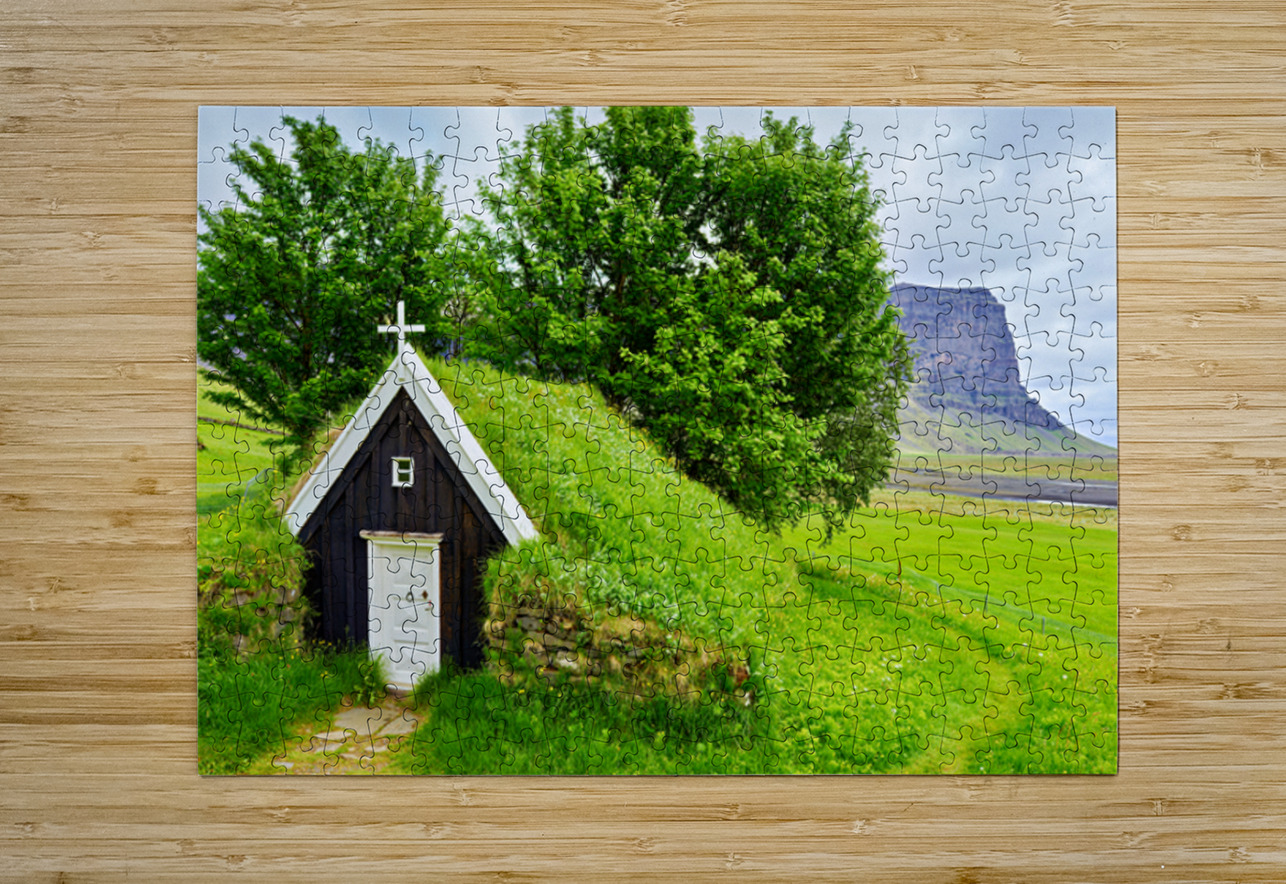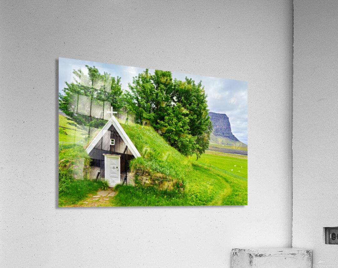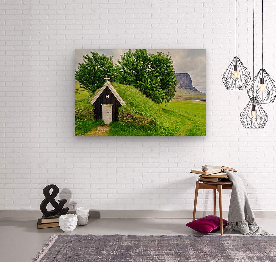 Nupsstadur turf church stands in Iceland surrounded by trees and mountains. Green grass covers its roof showing traditional building style.