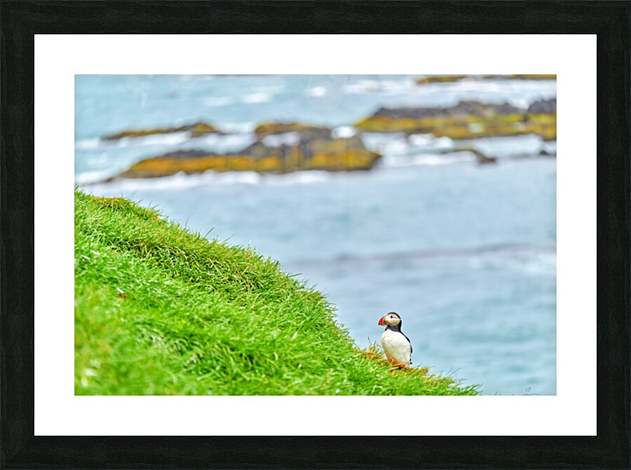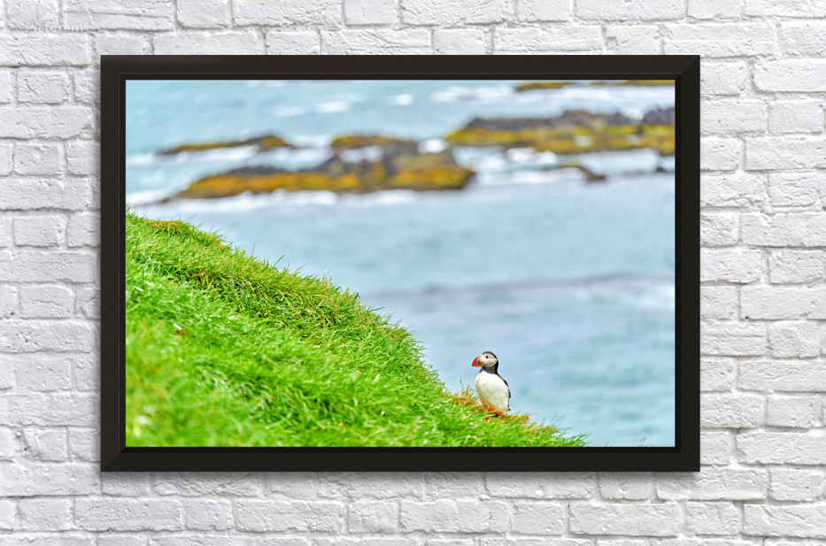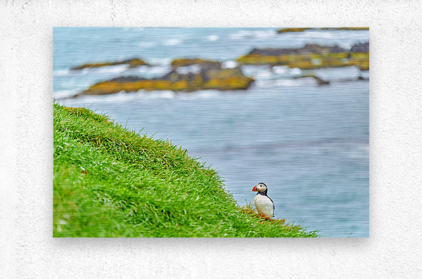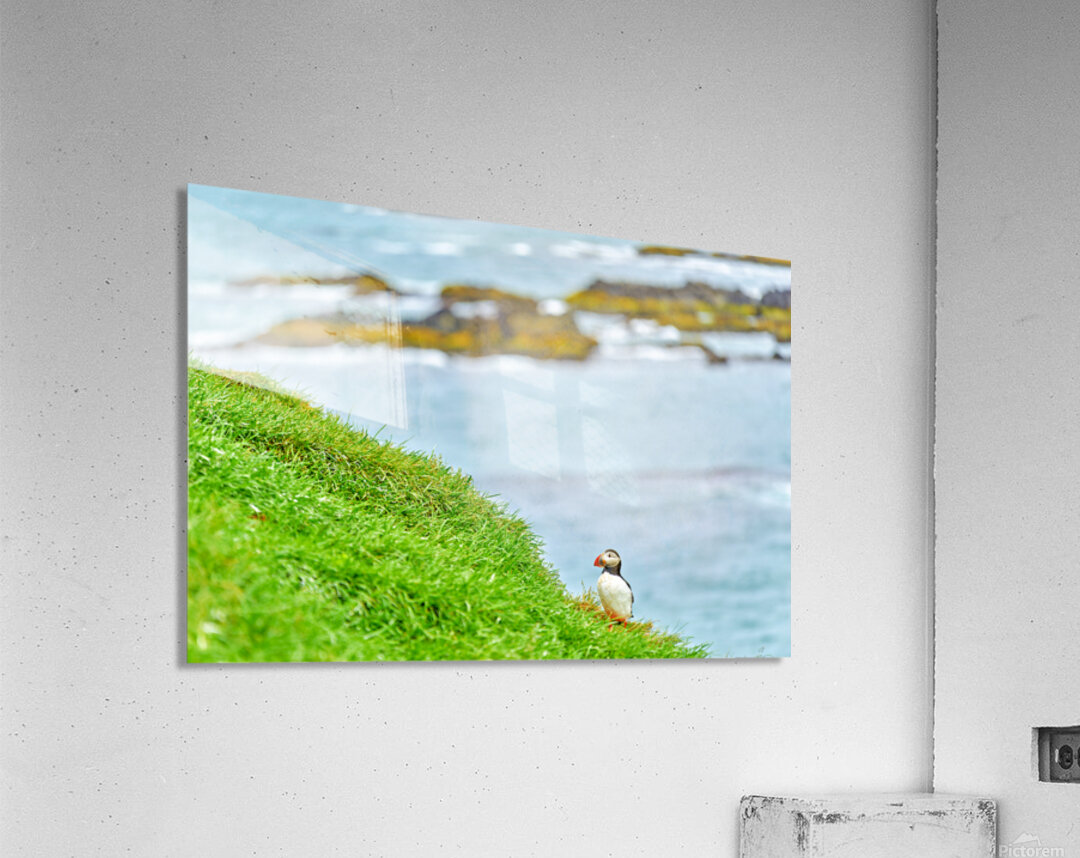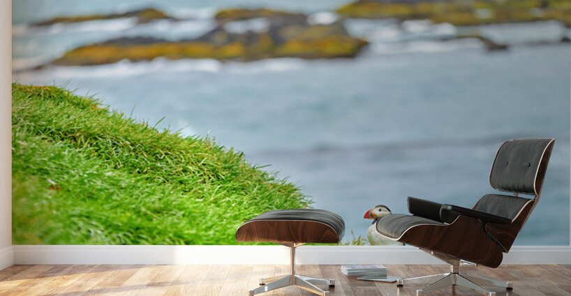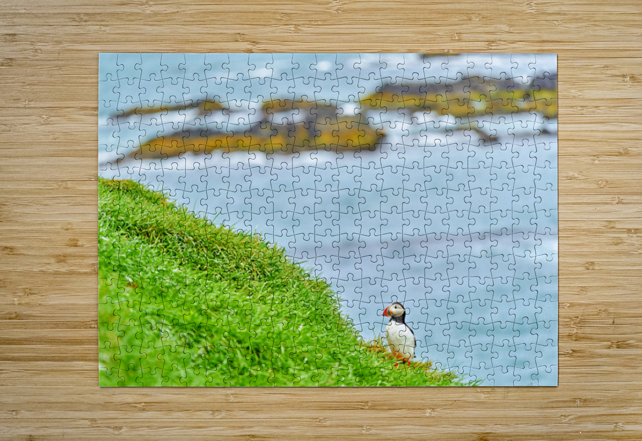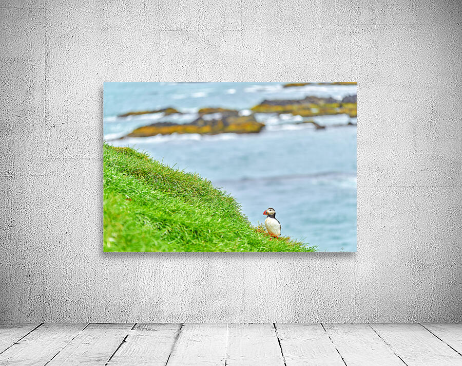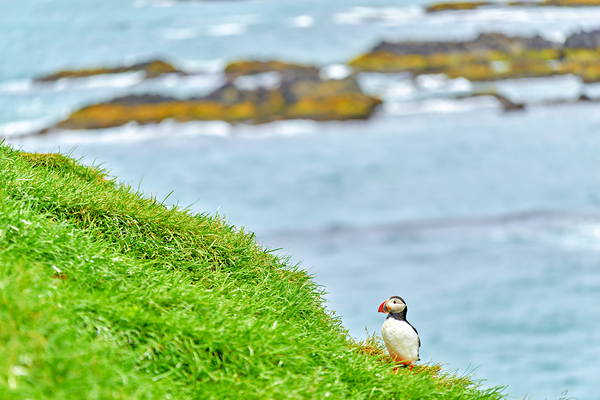 A puffin is resting on green grass near the shoreline of Borgarfjordur Eystri in Iceland. Waves can be seen in the background.