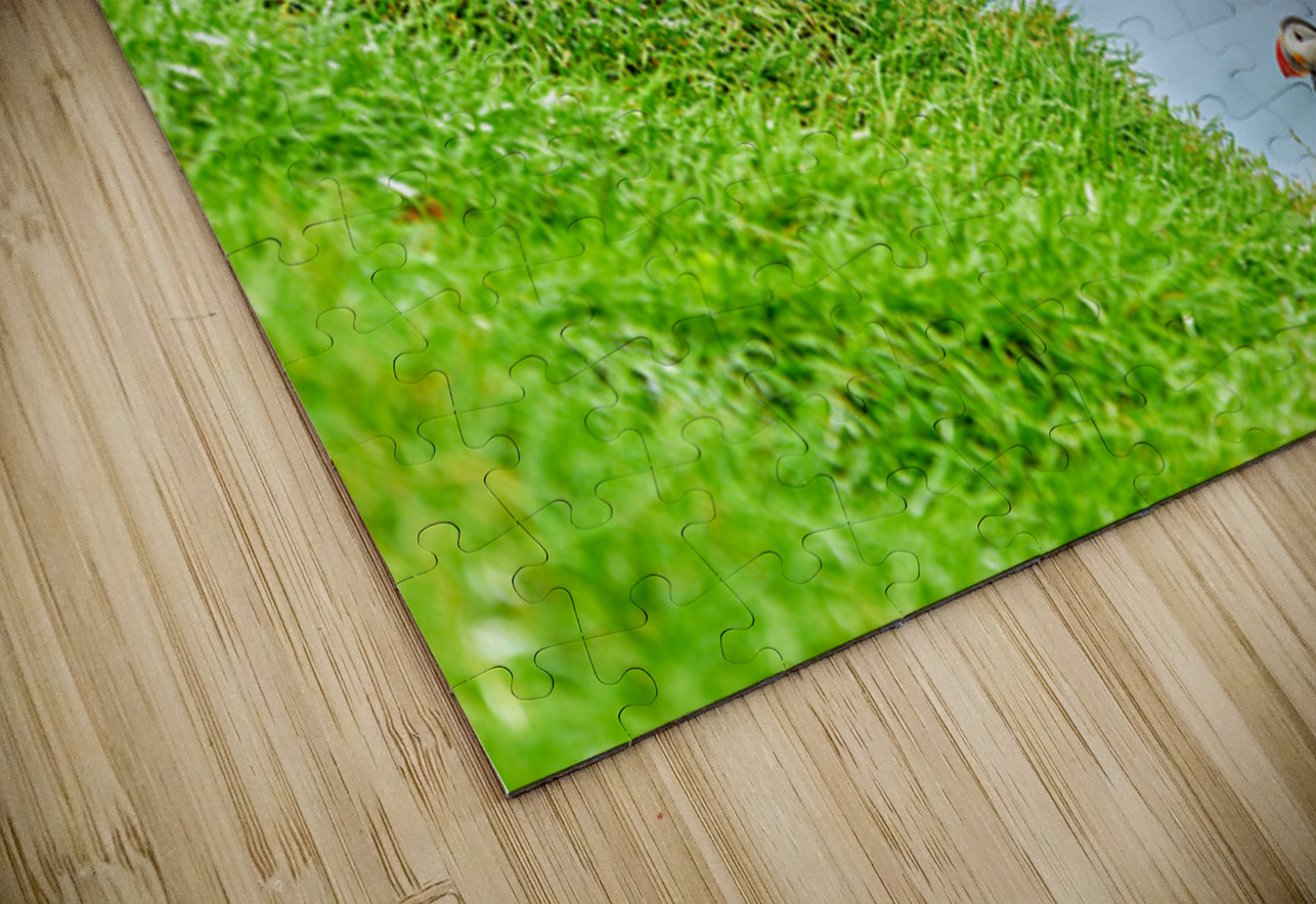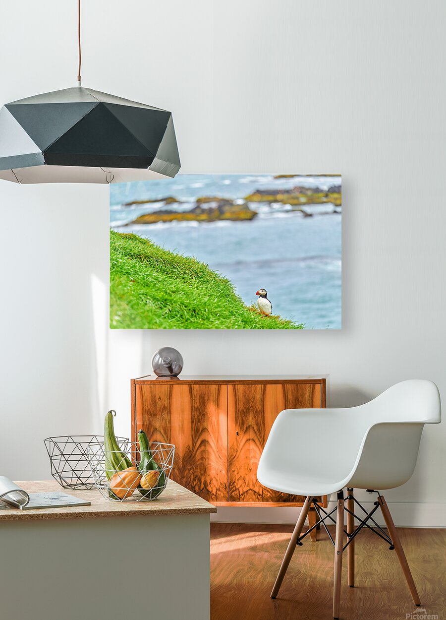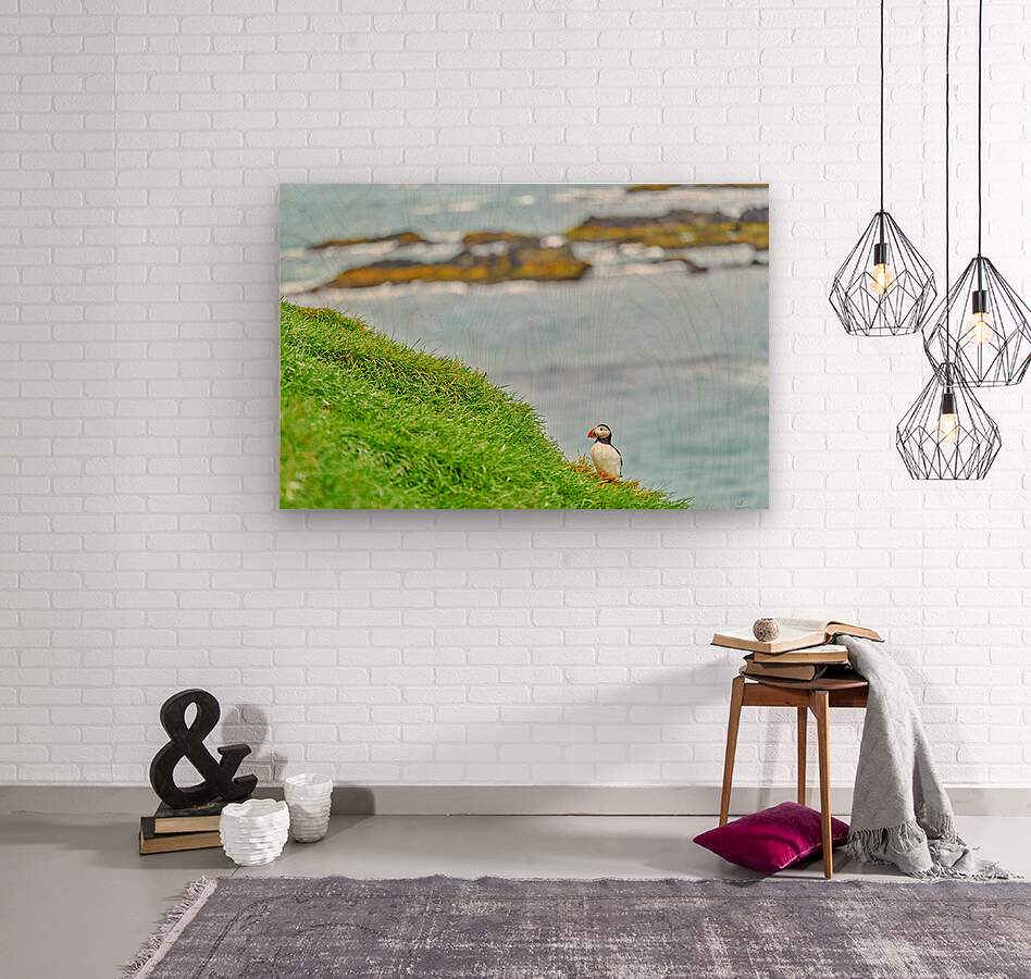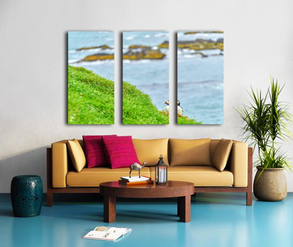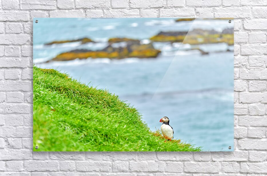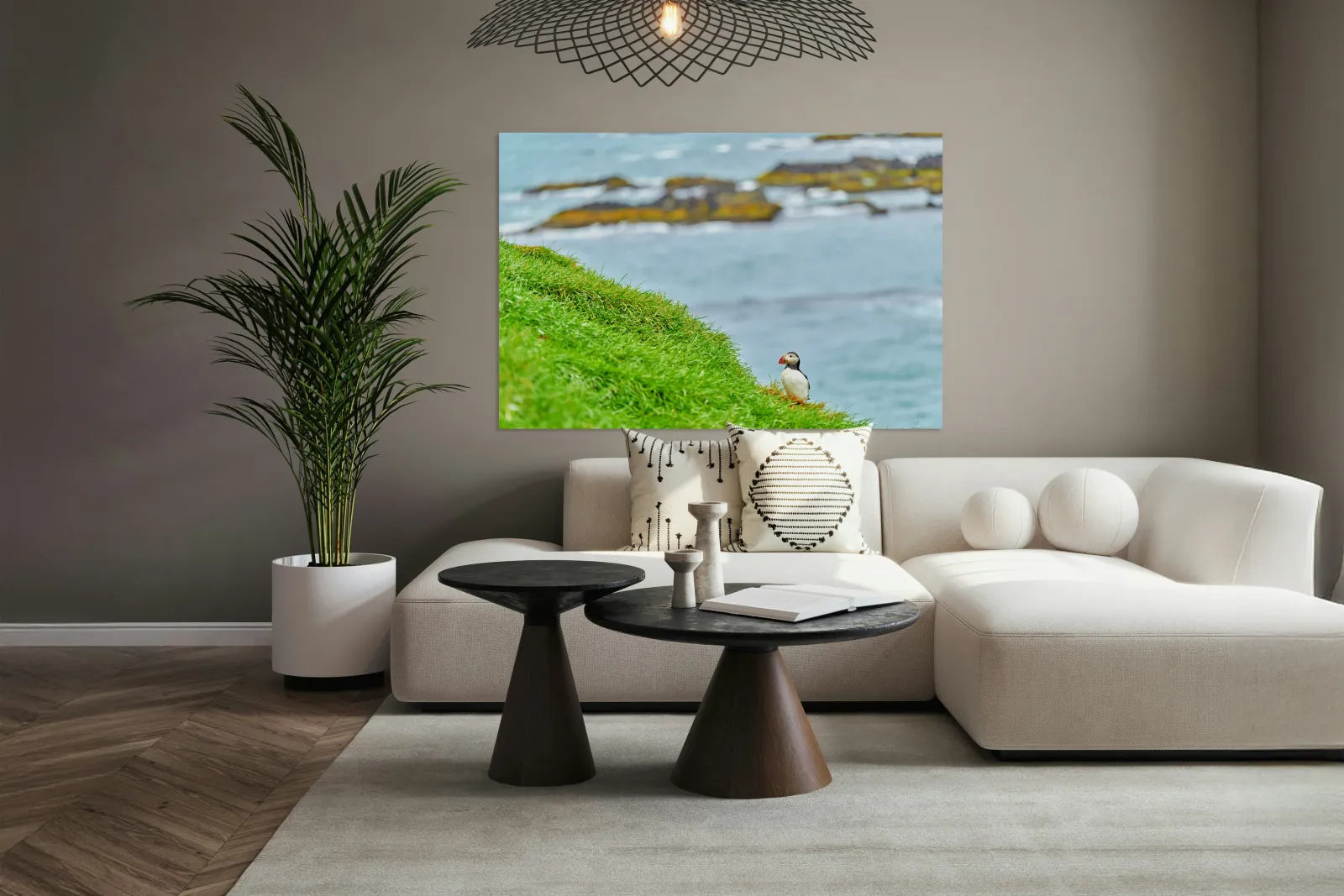 A puffin is resting on green grass near the shoreline of Borgarfjordur Eystri in Iceland. Waves can be seen in the background.