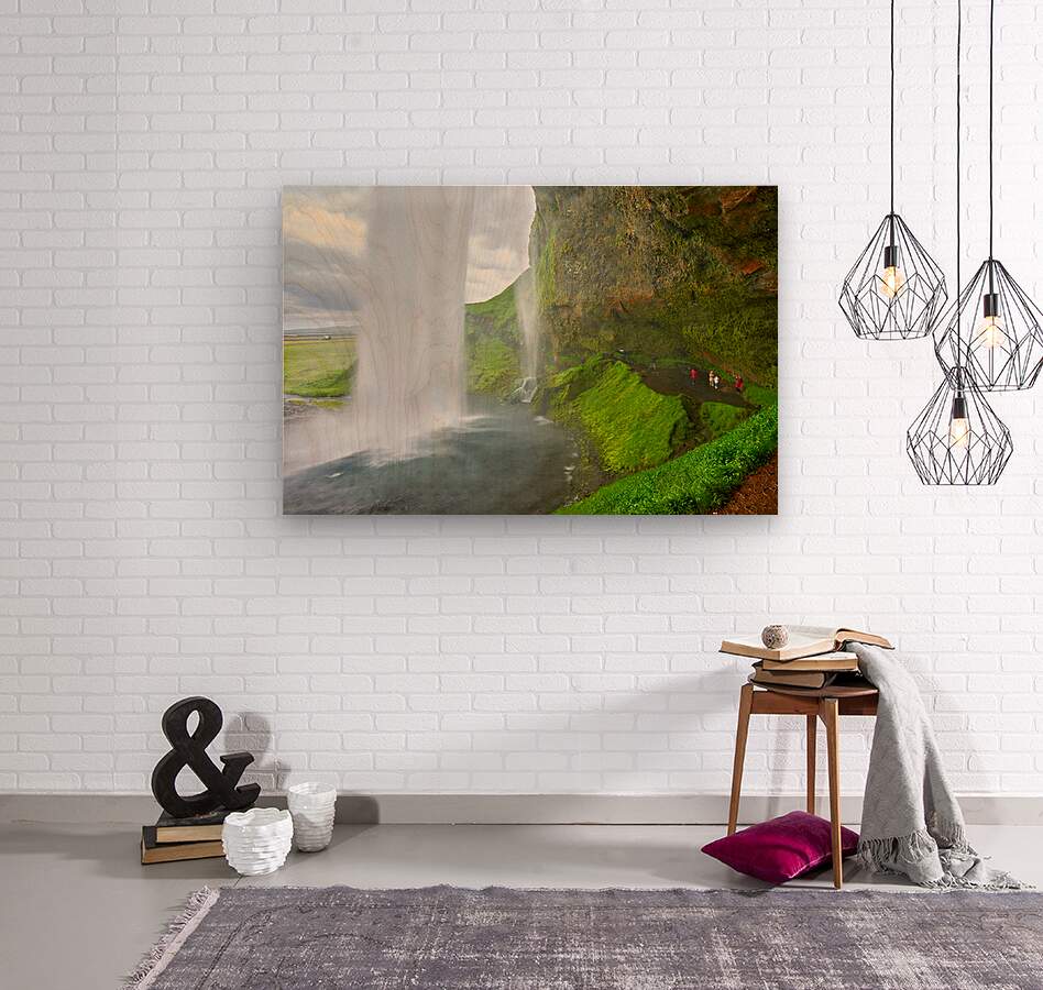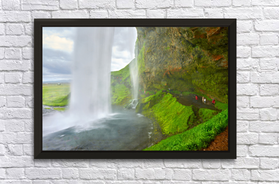 Water flows down Seljalandsfoss waterfall as visitors walk on a path behind it. Green grass covers the ground near the water in Iceland.