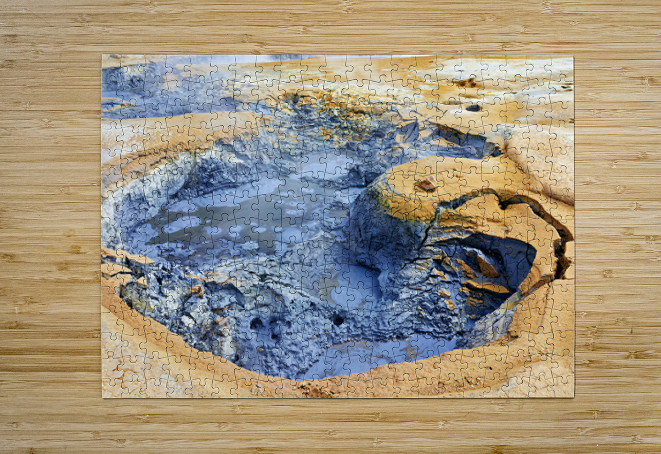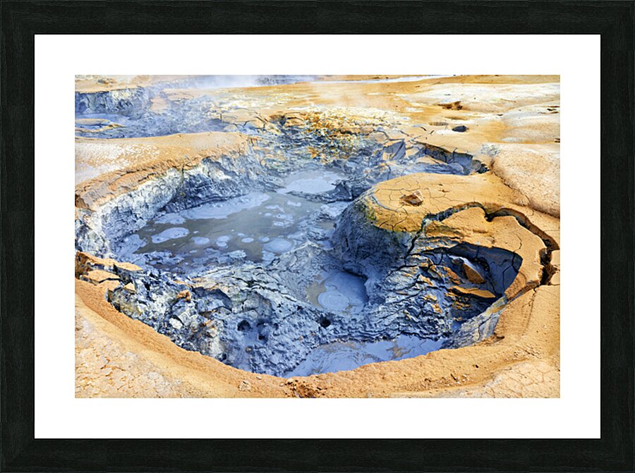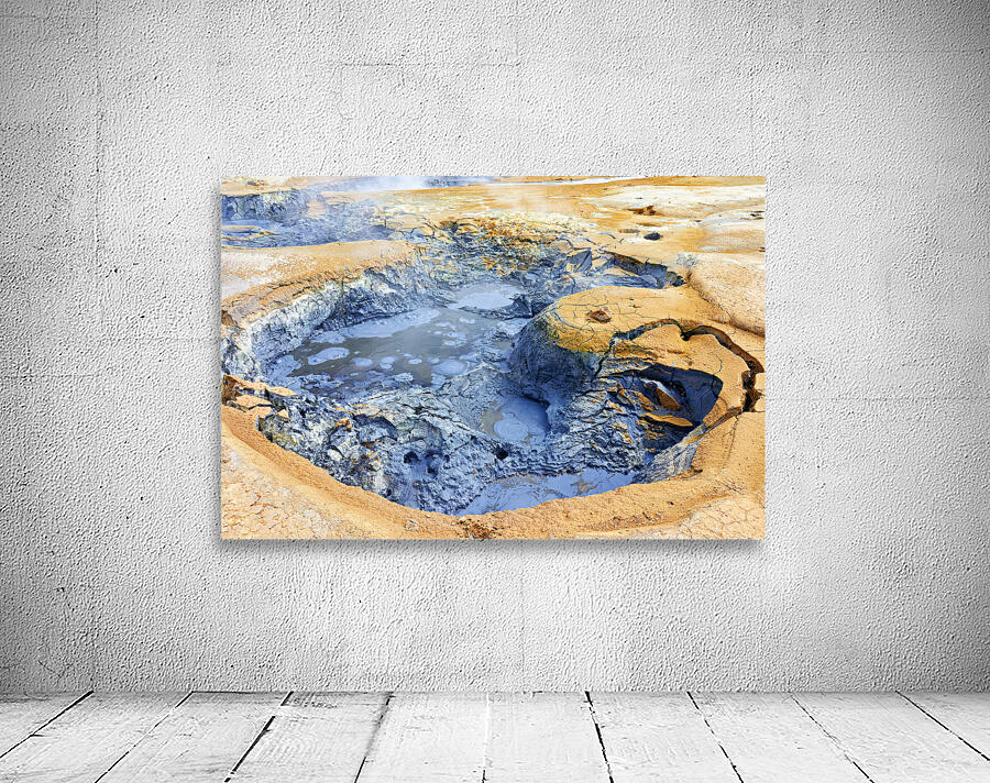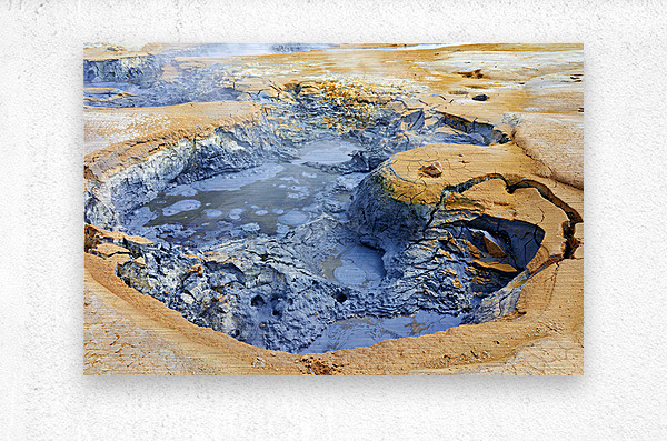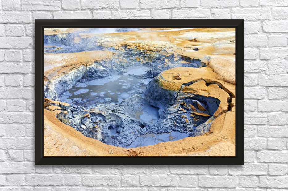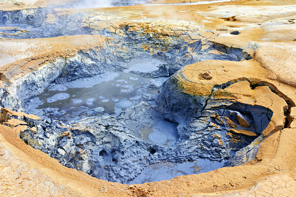 Visitors observe the bubbling mud pools at hverir hot springs in Iceland. Steam rises from the ground as geothermal activity occurs.