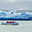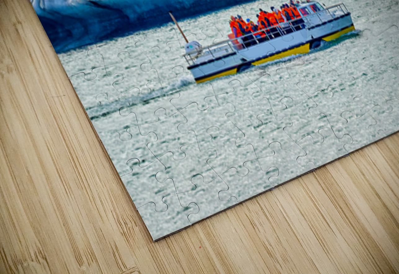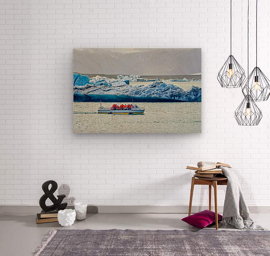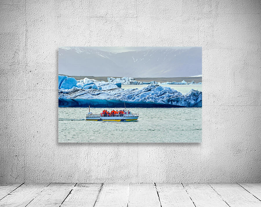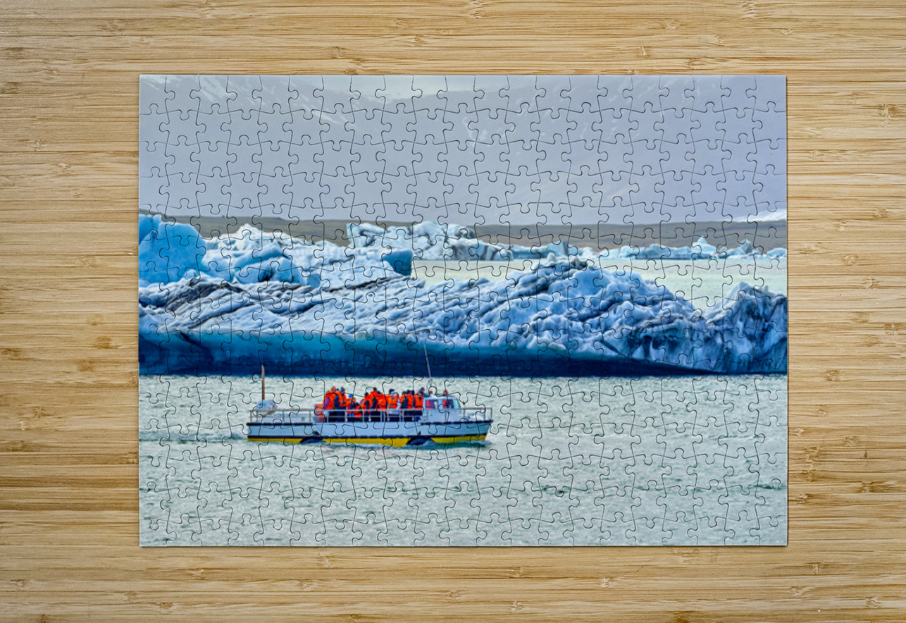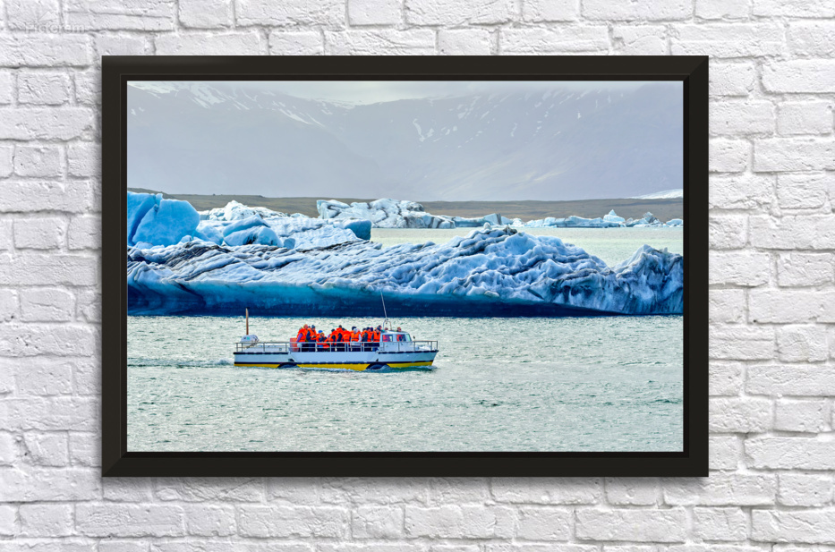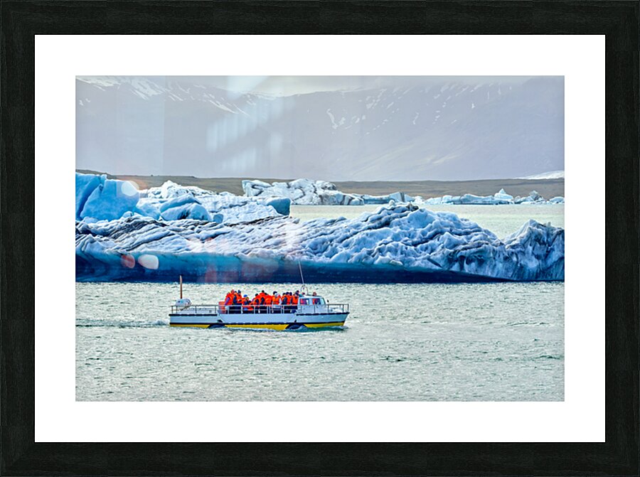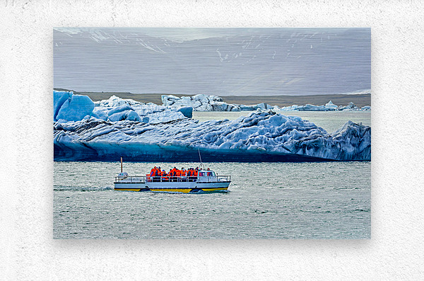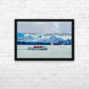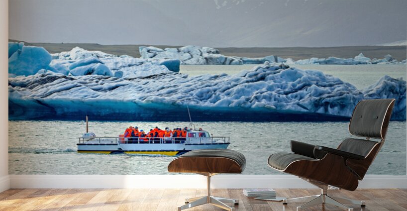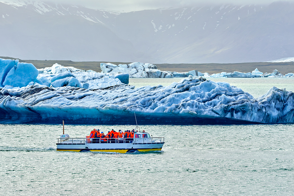 Groups of people travel on a boat in Jokulsarlon glacier lagoon while icebergs float in the water under a cloudy sky.