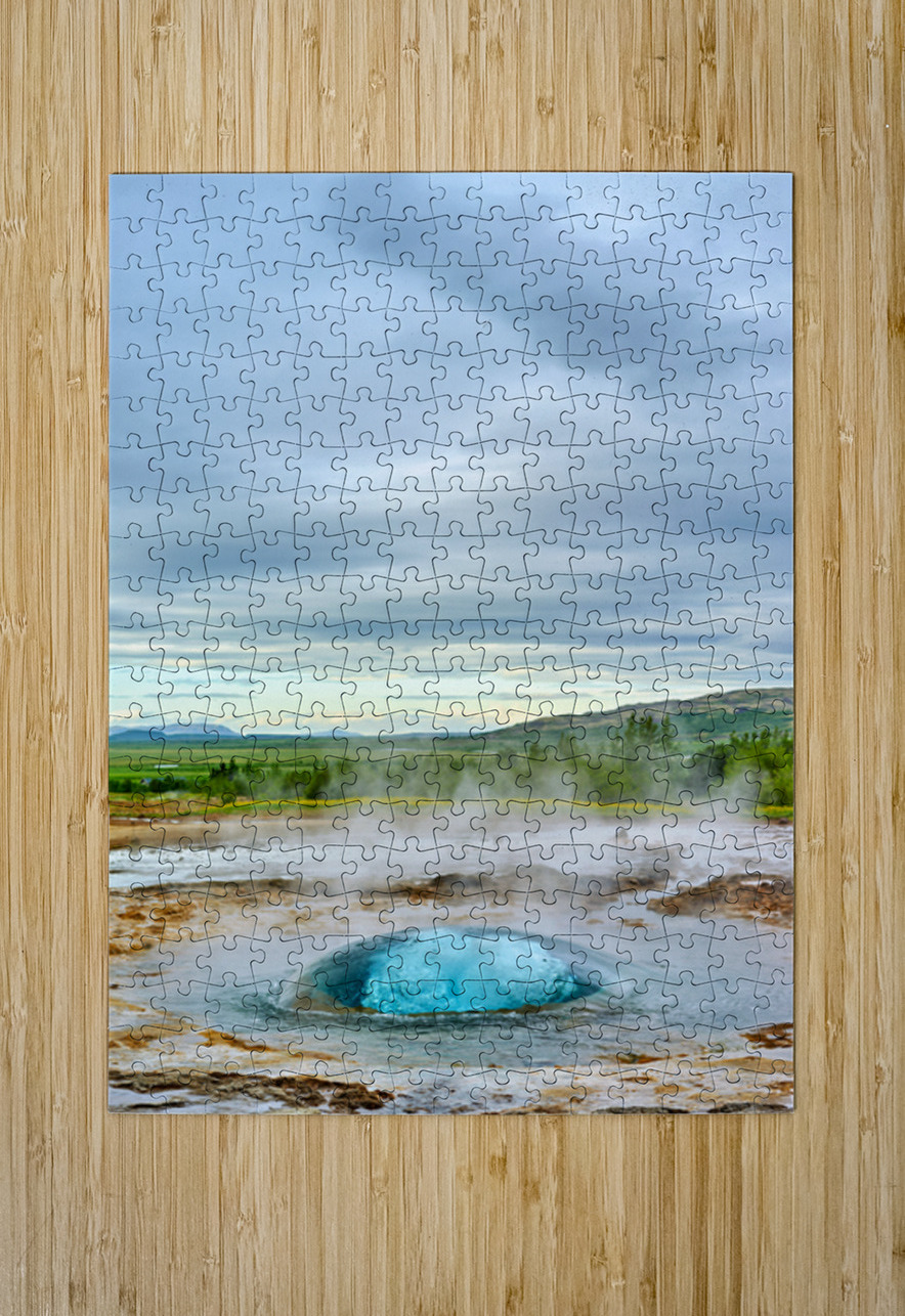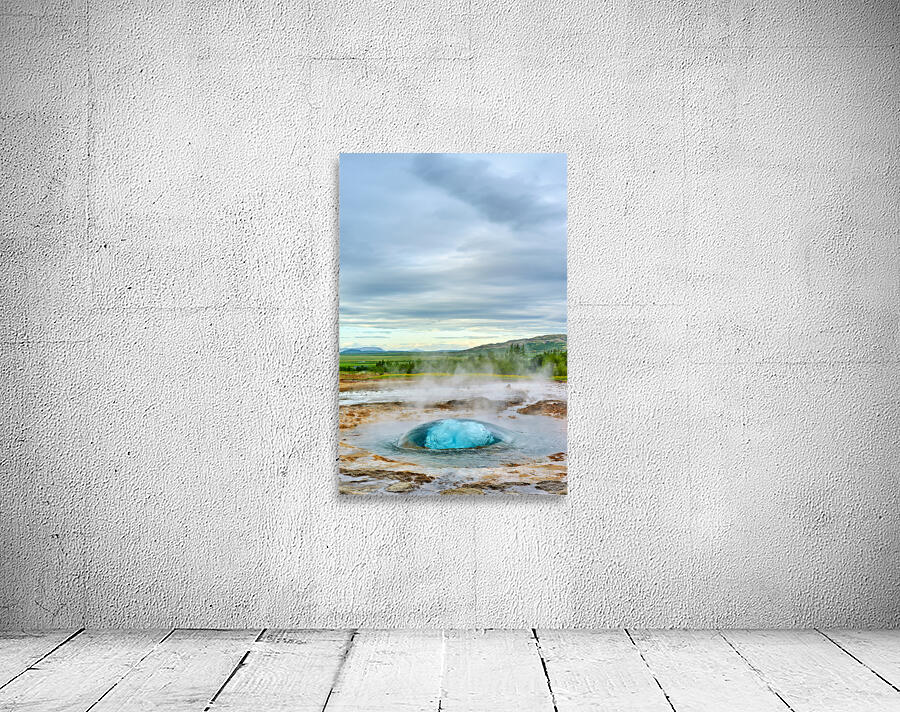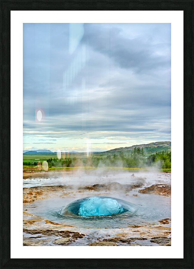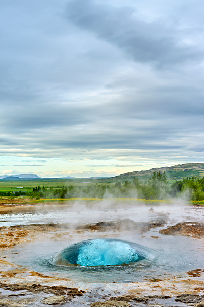 Strokkur geyser erupts sending water high up into the air. Surrounding landscape shows greenery and distant mountains.