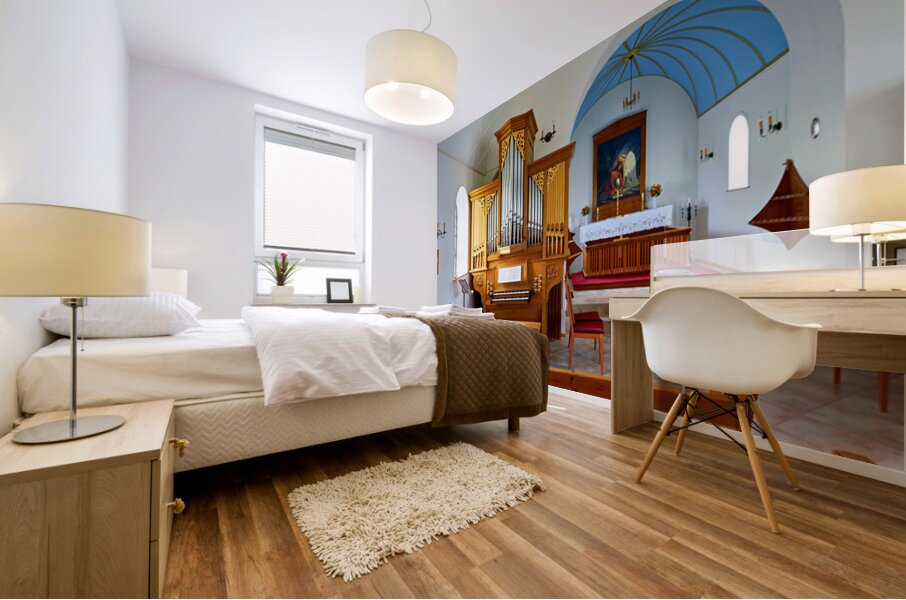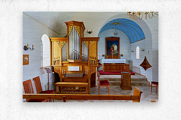 ABOUT THIS ARTWORK: WOODEN CHURCH INTERIOR WITH ORGAN IN VIK I MYRDAL ICELAND