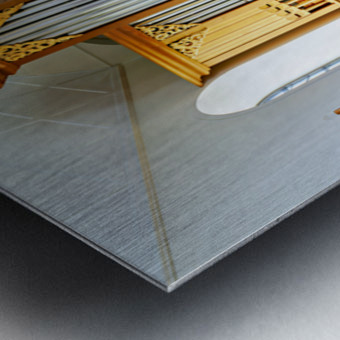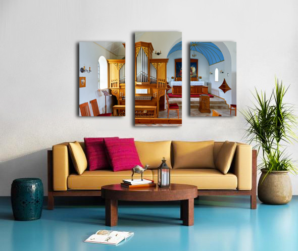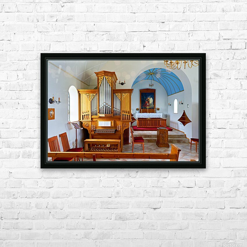 Wooden church interior with organ in Vik i Myrdal Iceland Picture Frame Printing