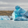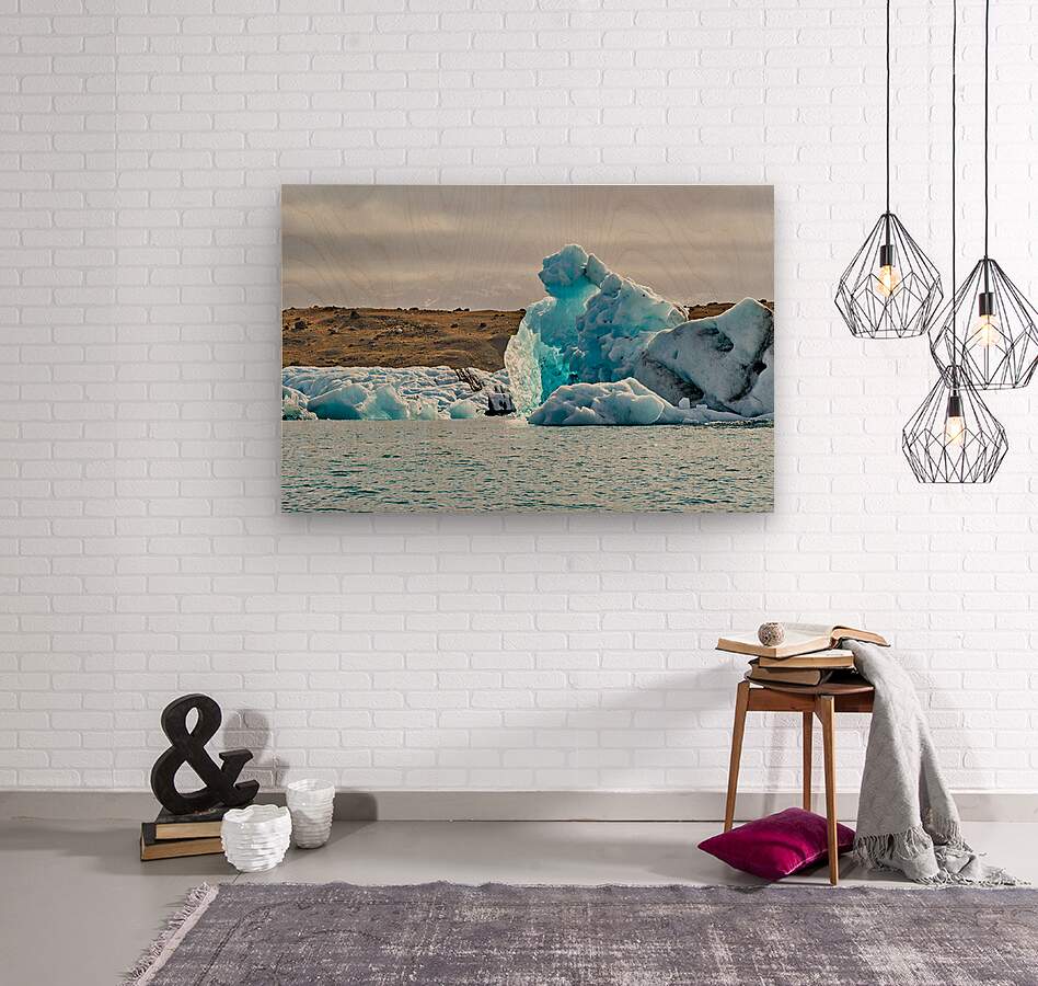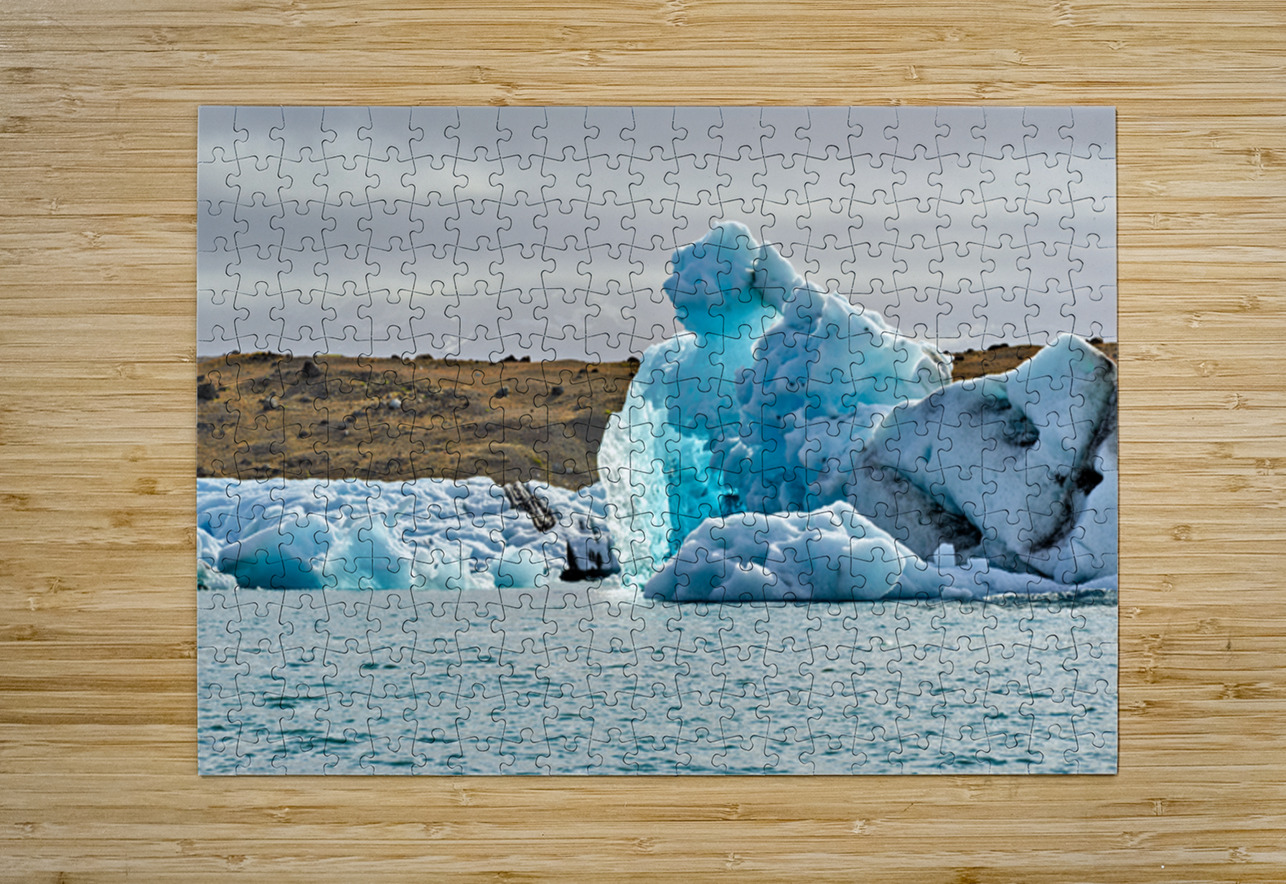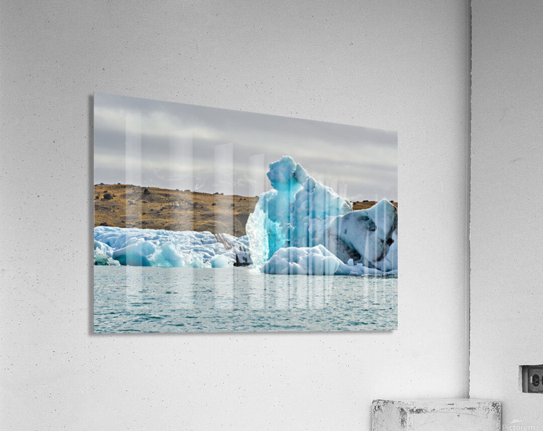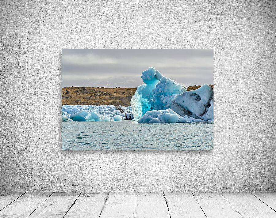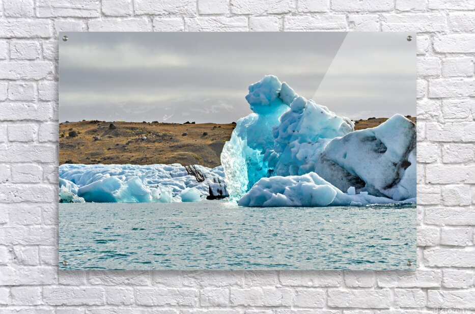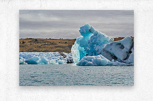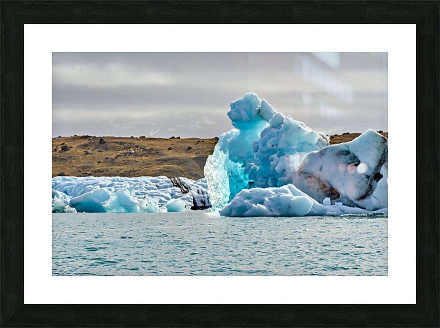 Water reflects icebergs floating in Jokulsarlon glacier lagoon in Iceland. The landscape shows cracked ice and distant hills under a cloudy sky.