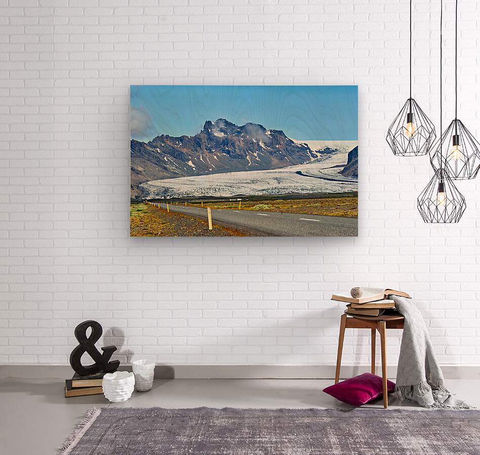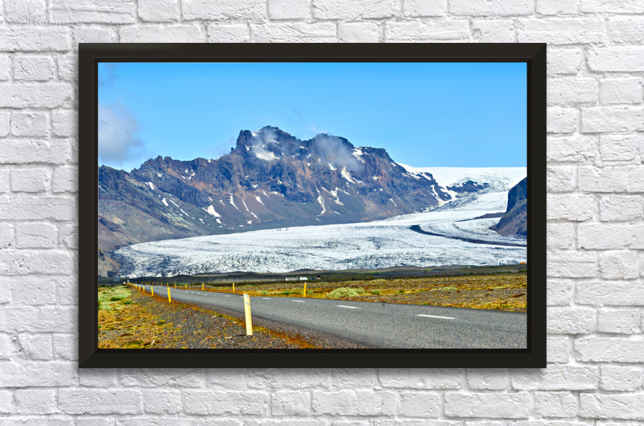 A glacier in Skaftafell Iceland stretches across the landscape. A road runs alongside under a clear sky. Mountains rise in the background.