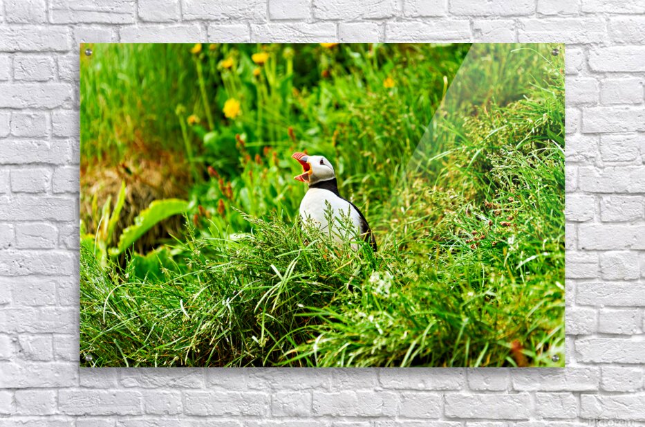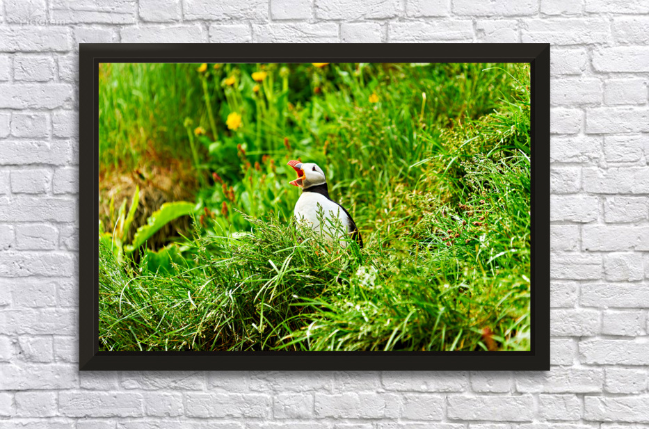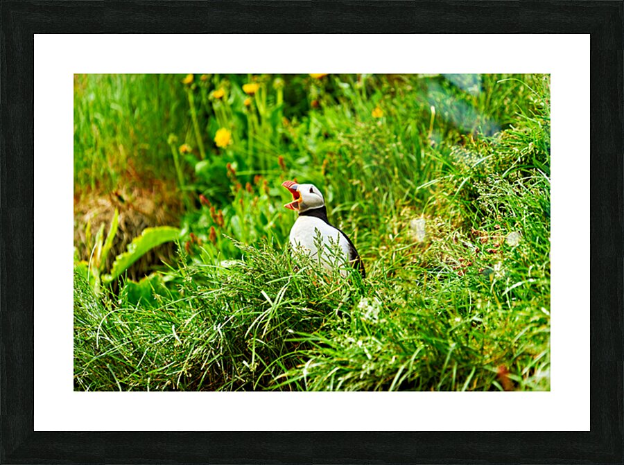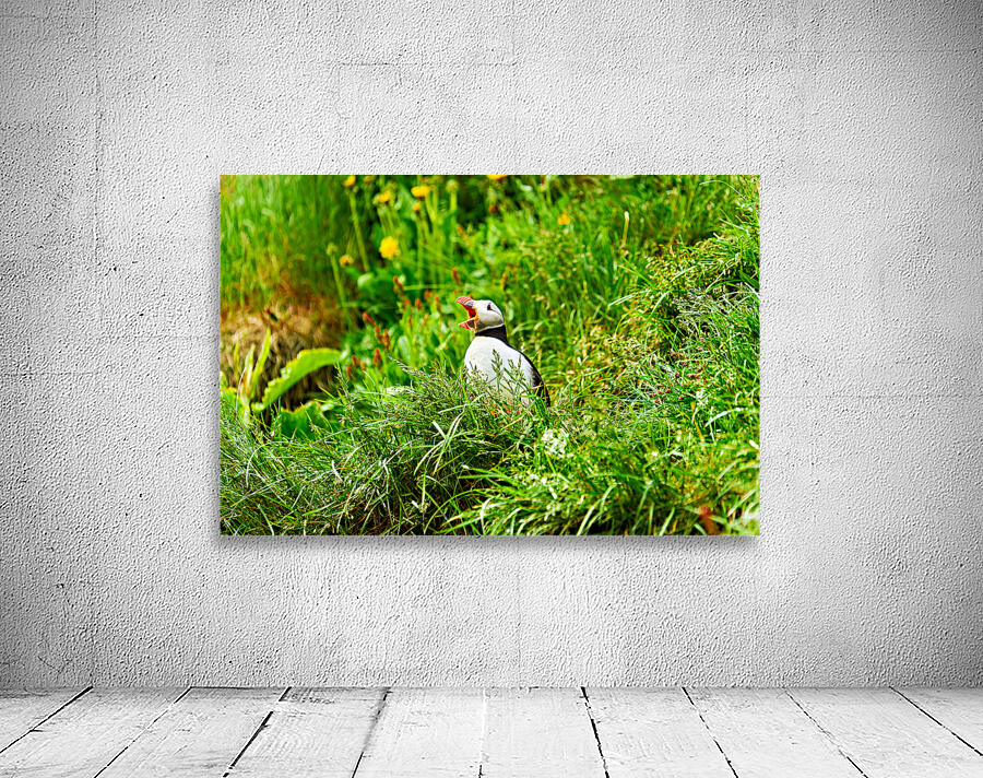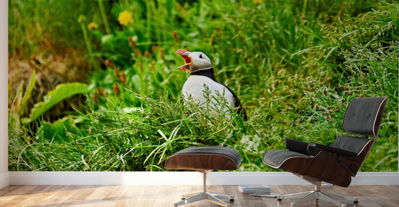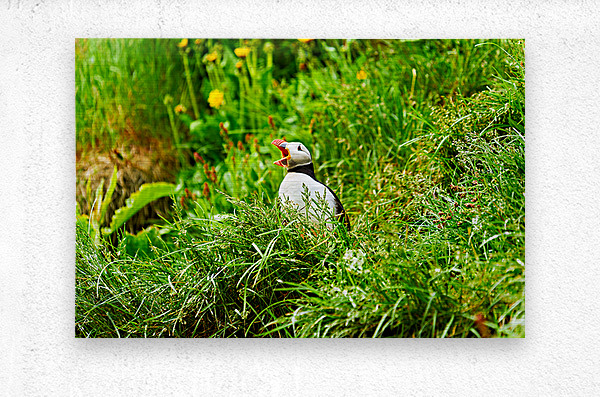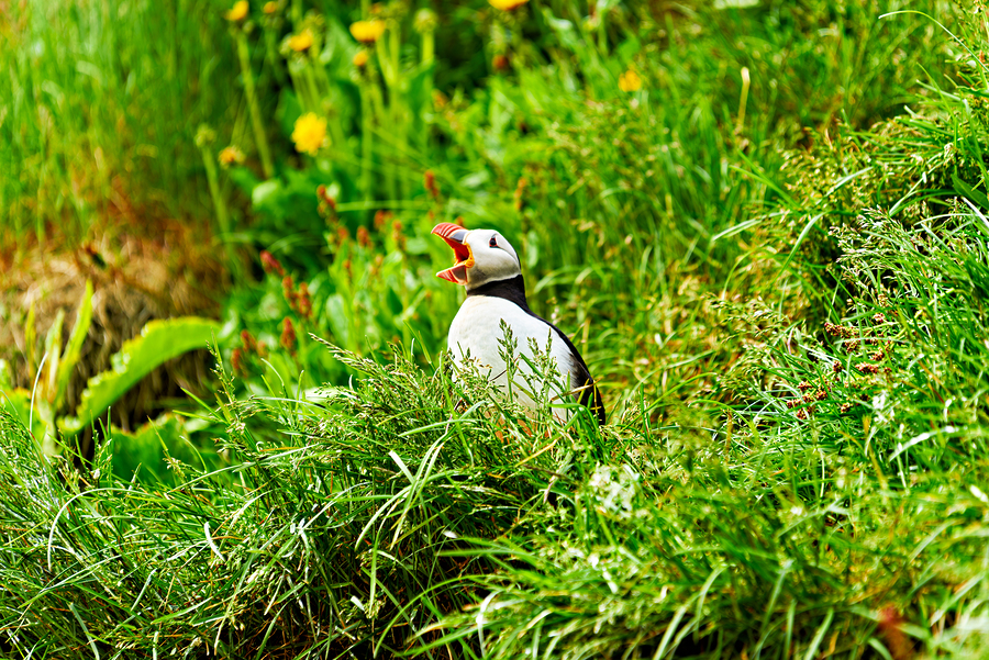 A puffin stands among green grass and flowers in Borgarfjordur Eystri. It calls loudly showing its bright beak.