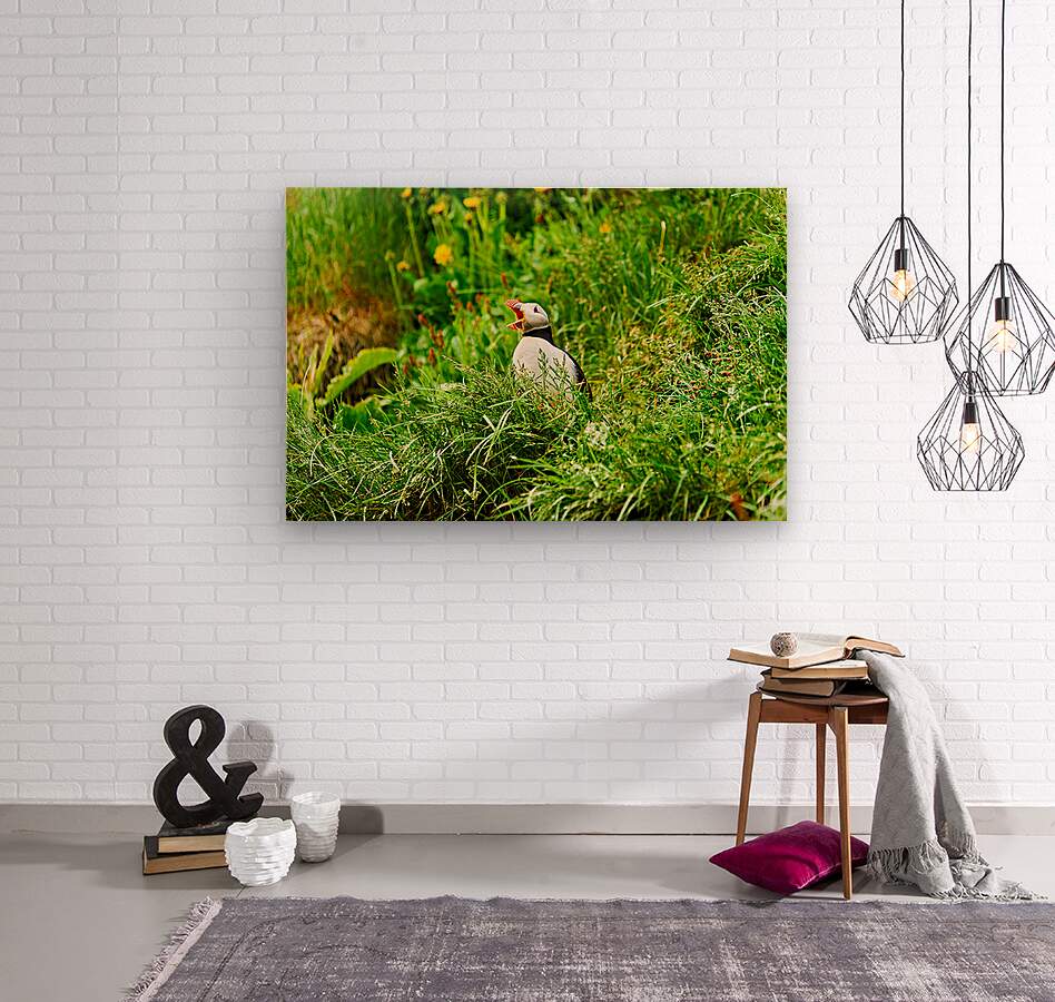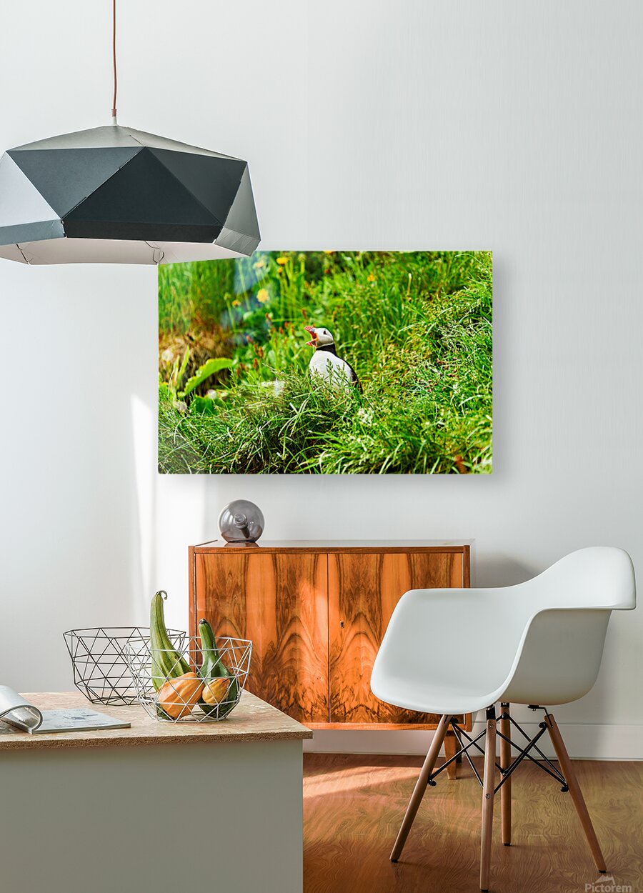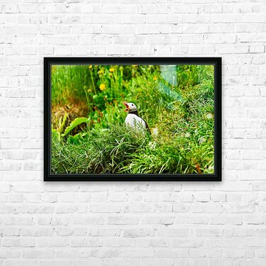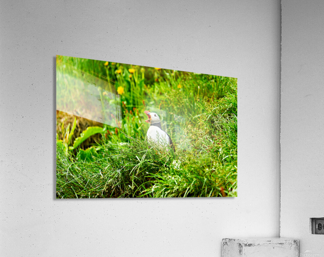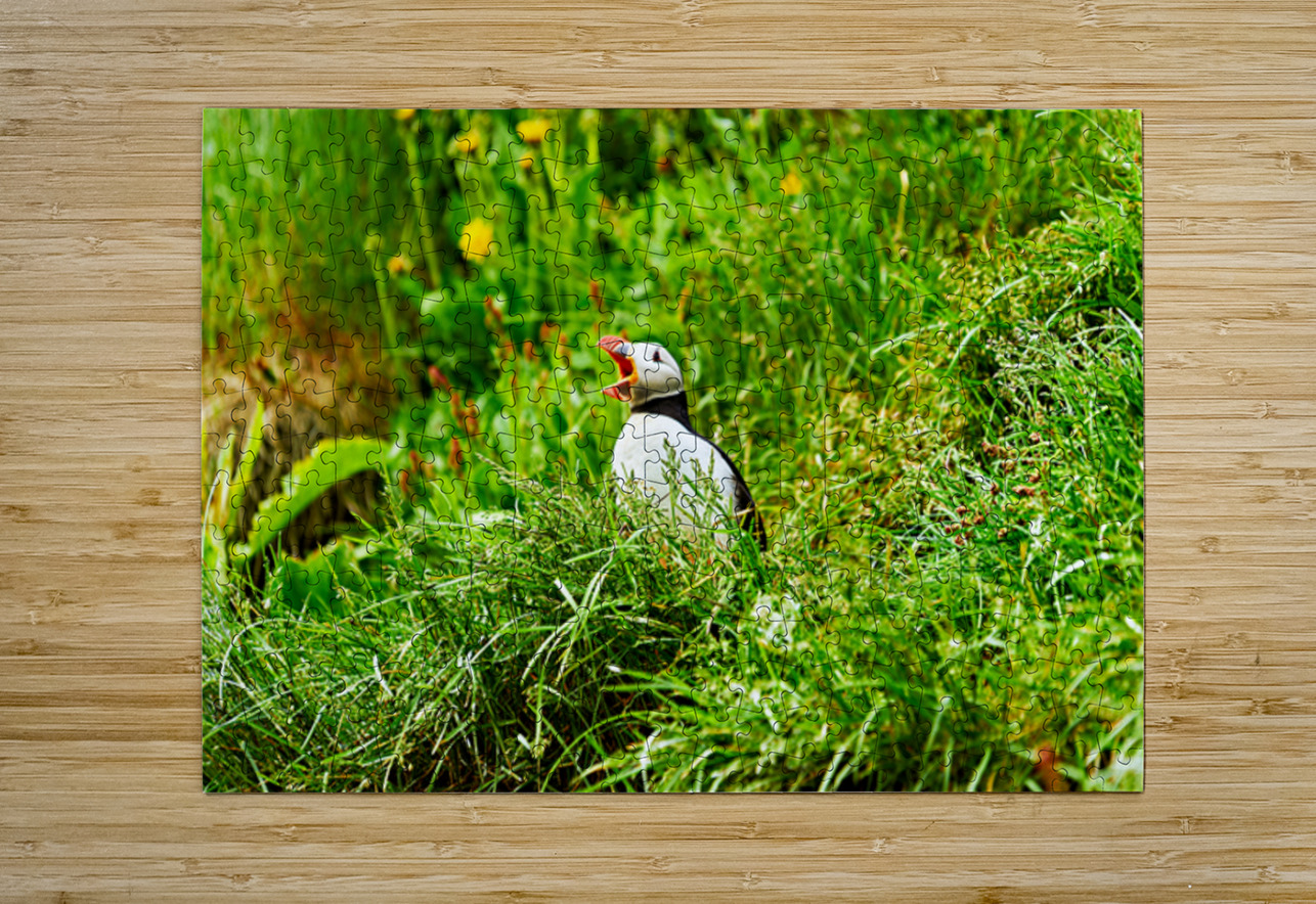 A puffin stands among green grass and flowers in Borgarfjordur Eystri. It calls loudly showing its bright beak.