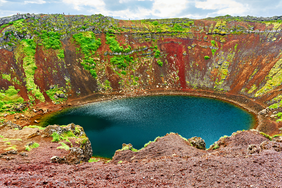 Visitors are seen walking around the edge of Kerid Crater in Iceland. The water in the crater appears blue and is surrounded by rocky slopes.