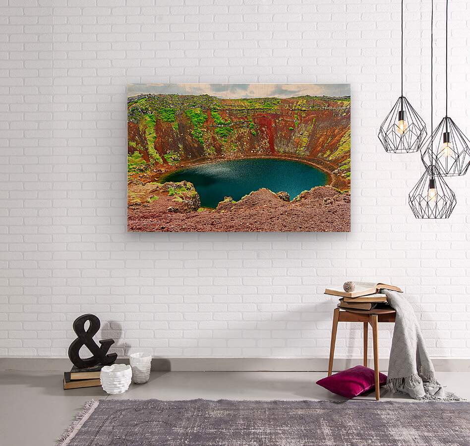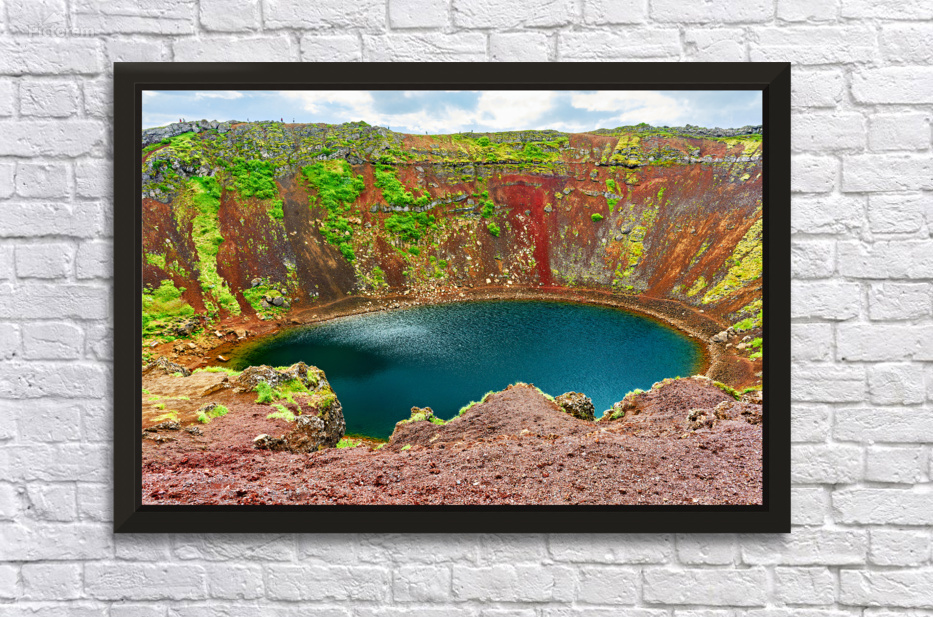 Visitors are seen walking around the edge of Kerid Crater in Iceland. The water in the crater appears blue and is surrounded by rocky slopes.