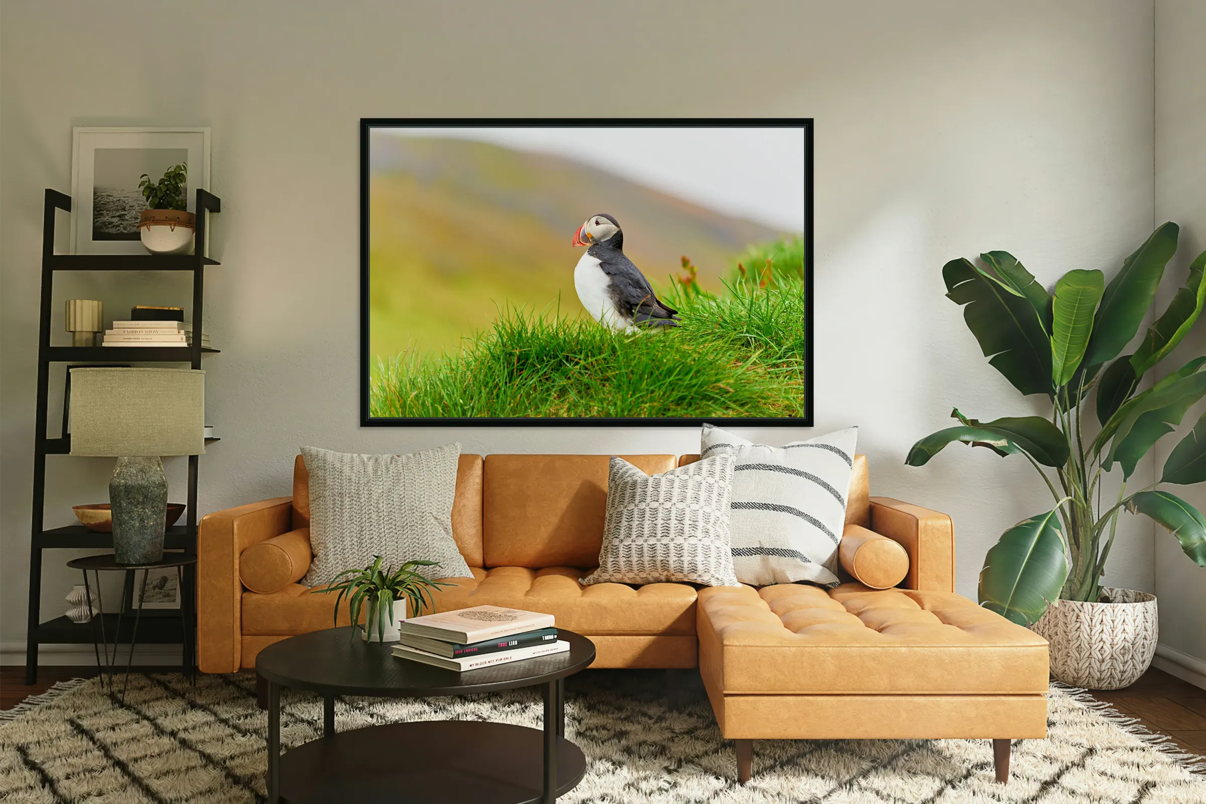 Puffin standing on grass in Borgarfjordur Eystri Iceland Frame print