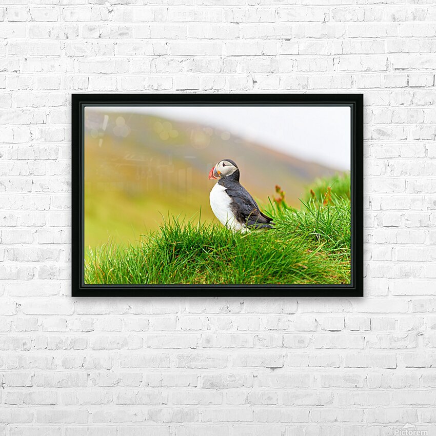 Puffin standing on grass in Borgarfjordur Eystri Iceland Picture Frame Printing