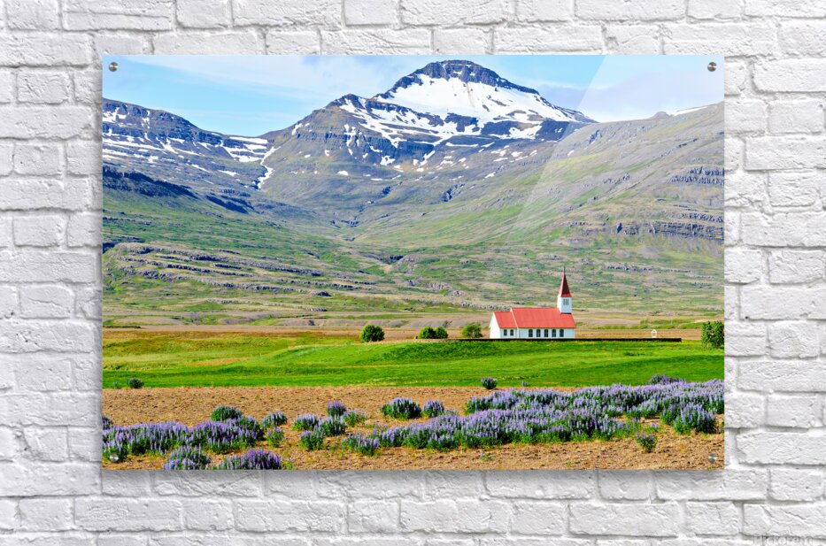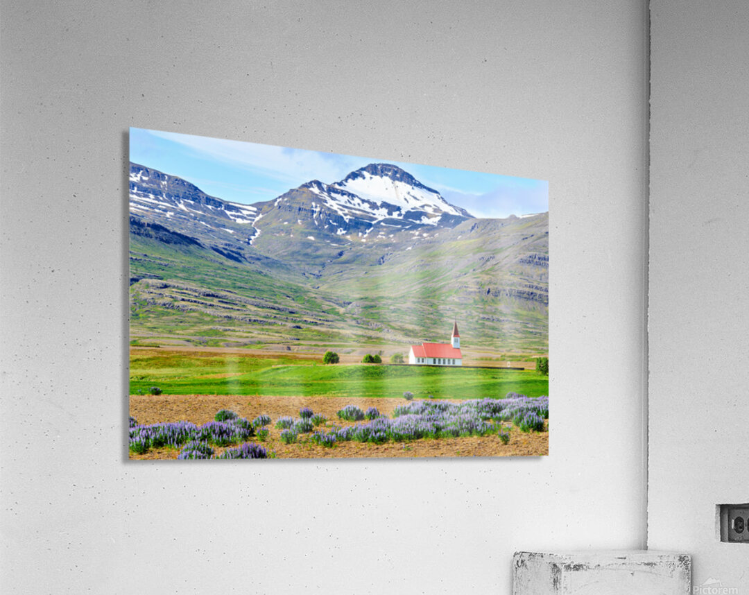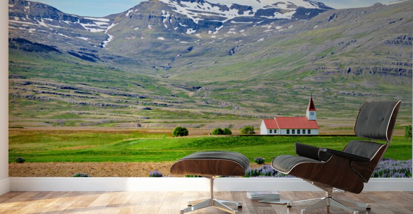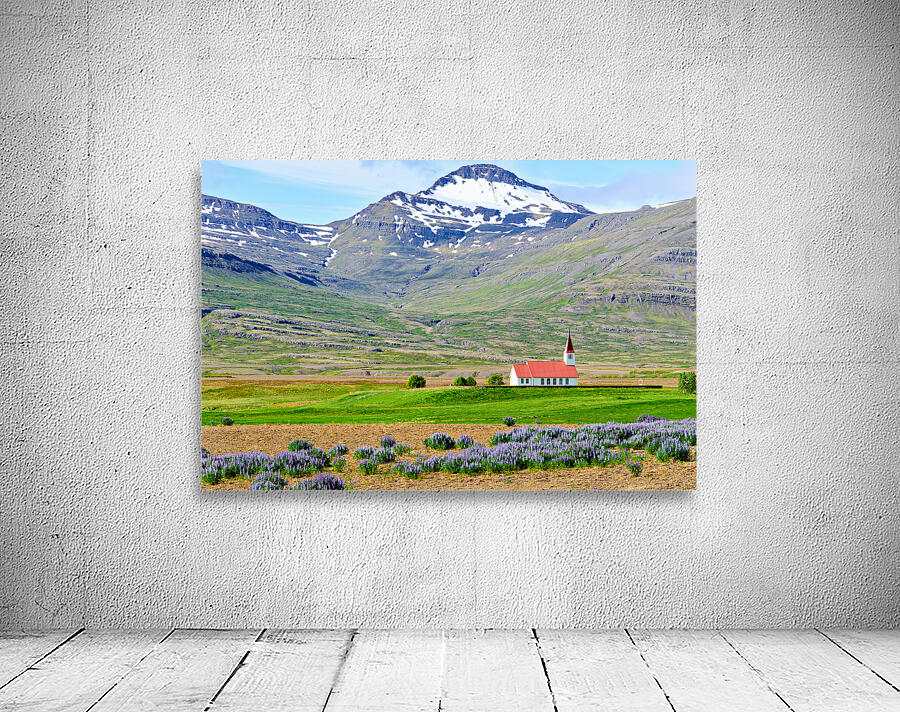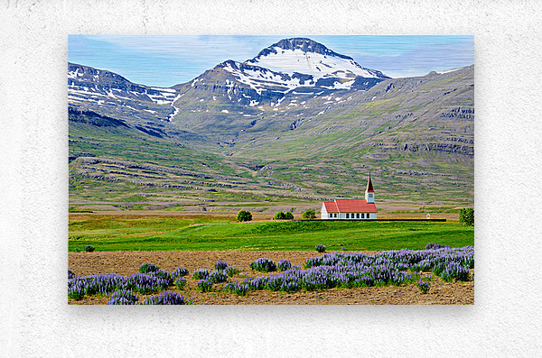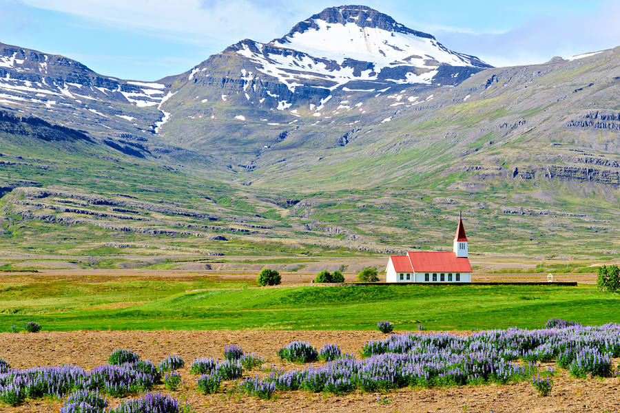 Heydalir Church sits in the landscape surrounded by fields and mountains. Snow covers the peaks in the background under a clear sky.