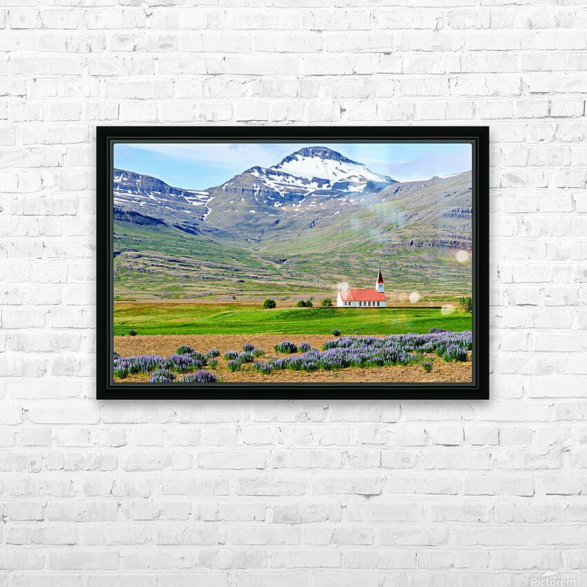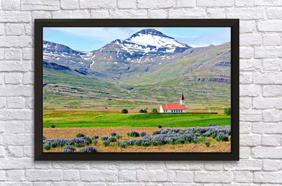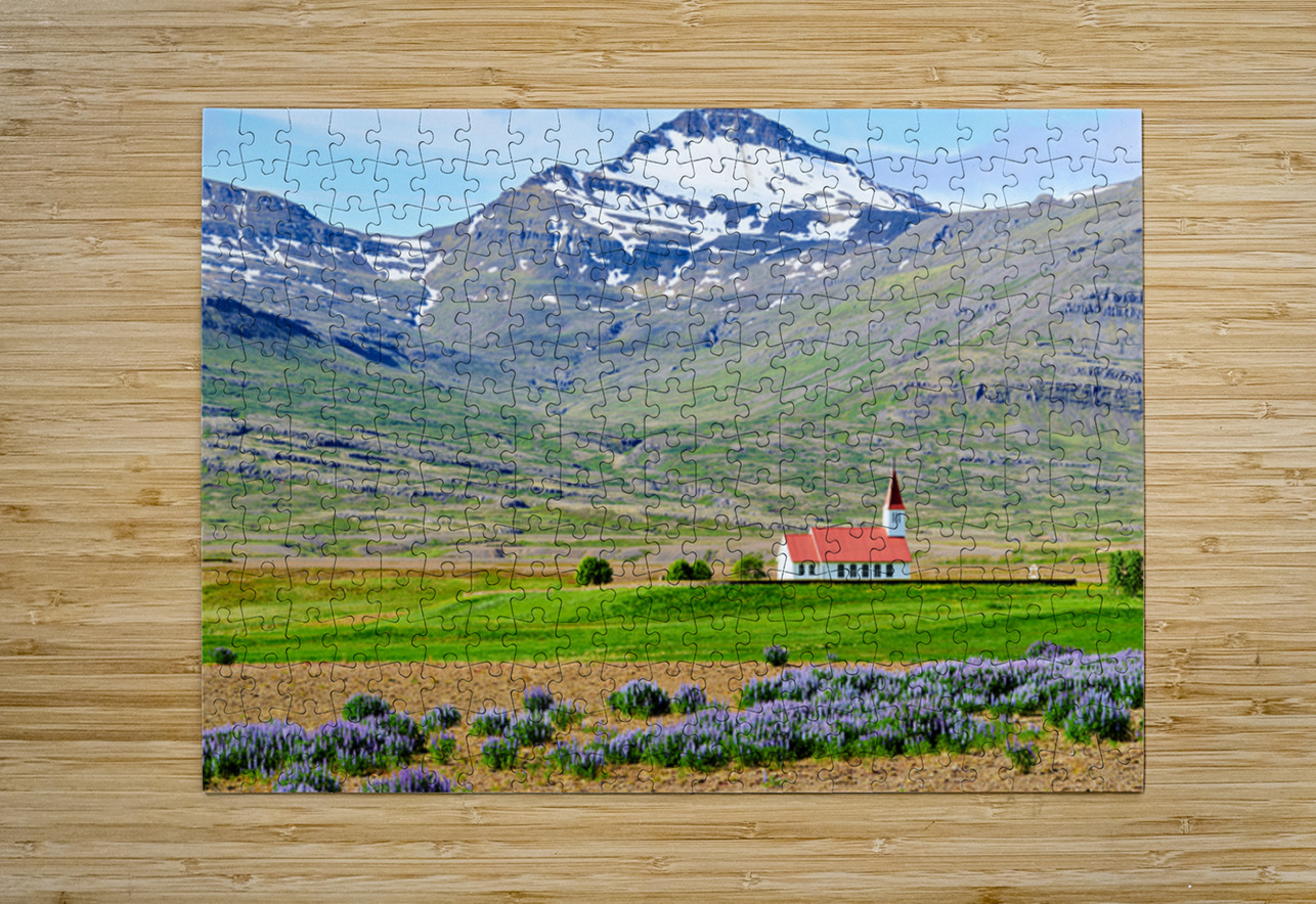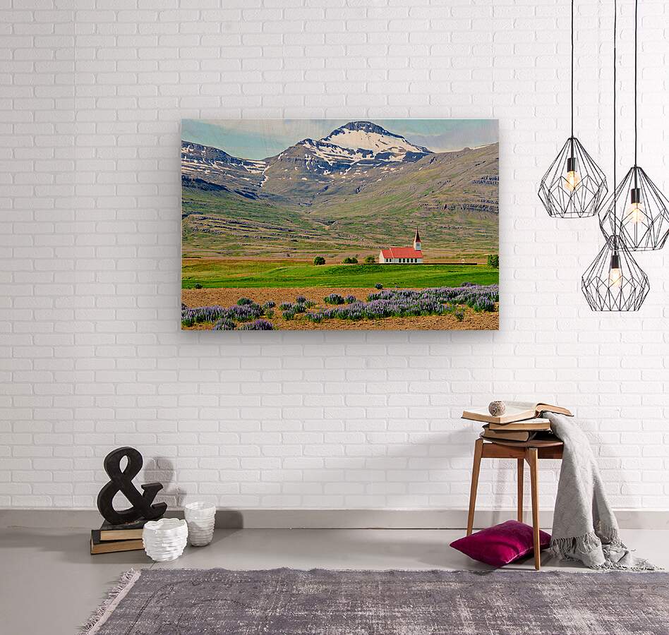Heydalir Church sits in the landscape surrounded by fields and mountains. Snow covers the peaks in the background under a clear sky.