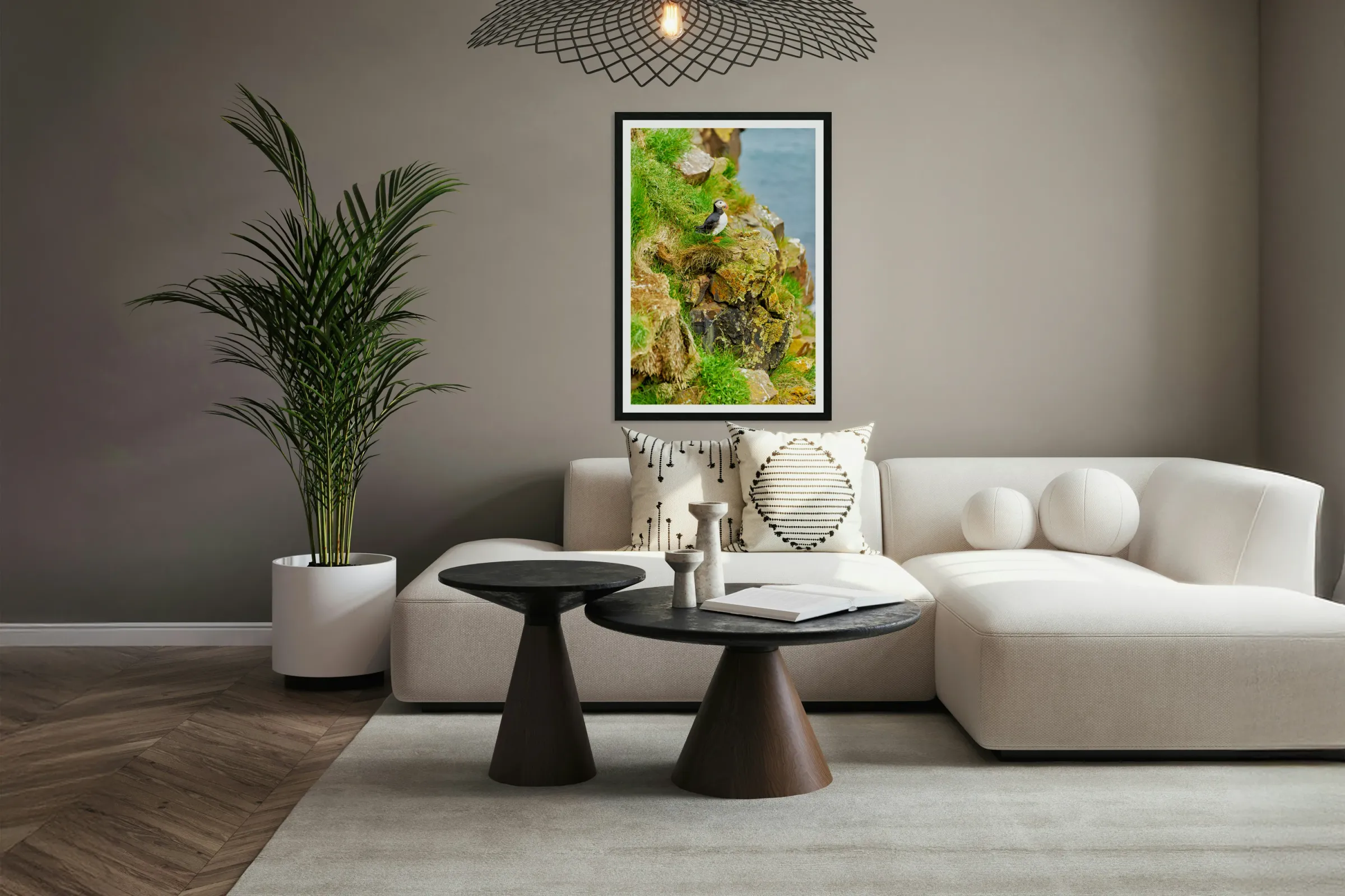 Puffin stands on rocks by the sea in Borgarfjordur Eystri Frame print