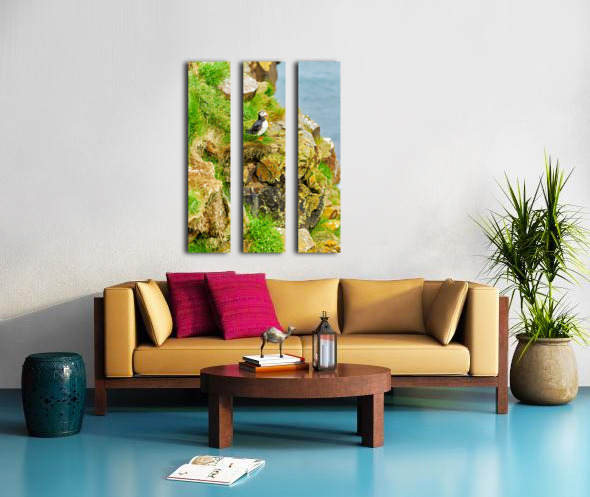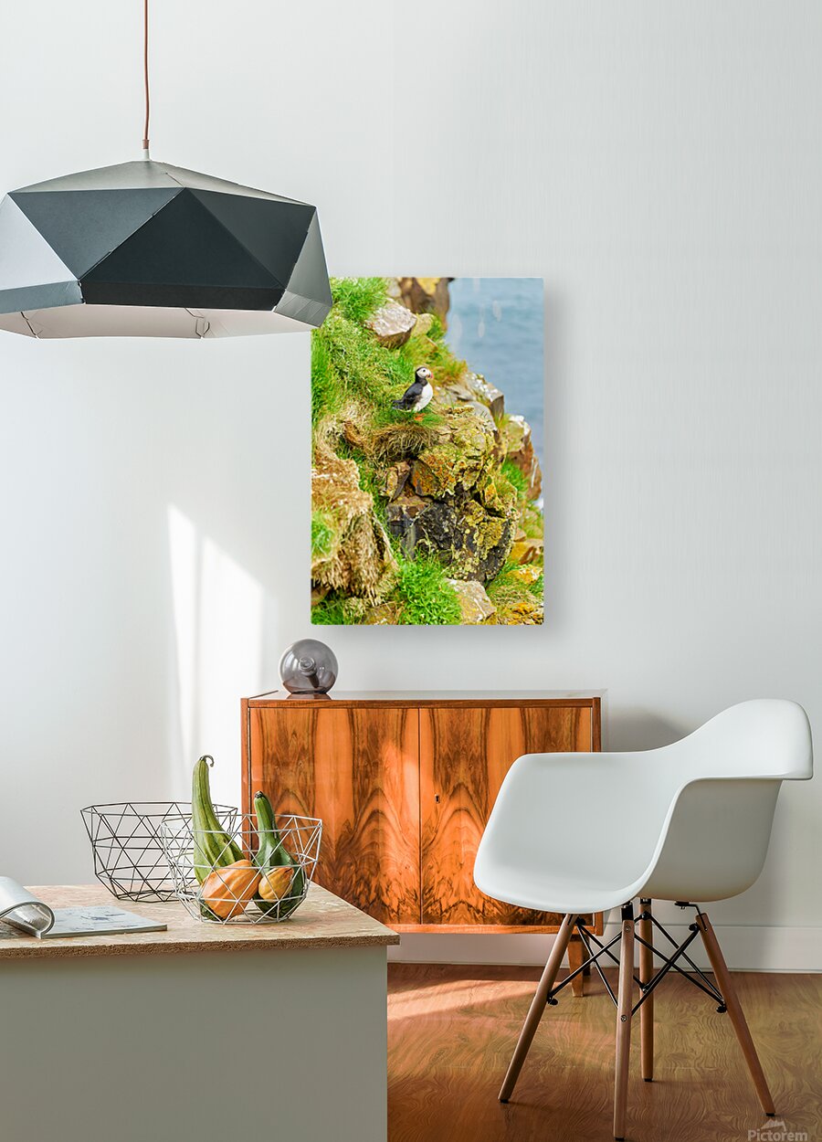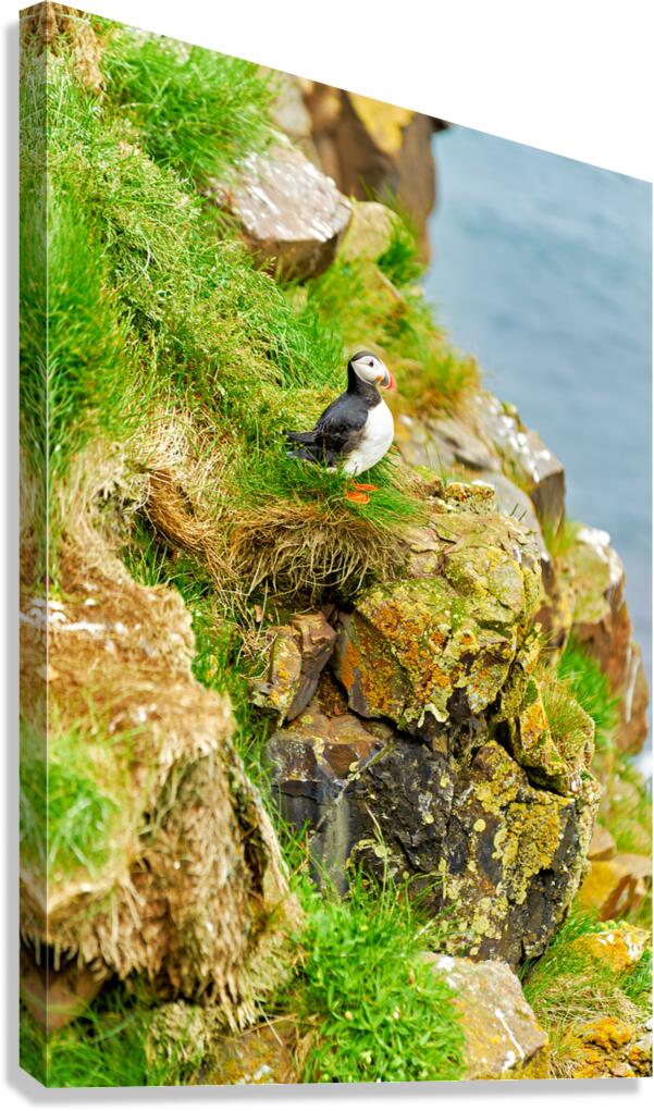 ABOUT THIS ARTWORK: PUFFIN STANDS ON ROCKS BY THE SEA IN BORGARFJORDUR EYSTRI