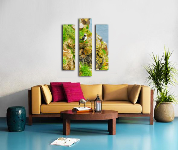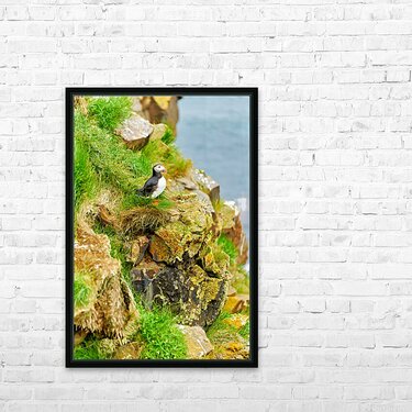 Get this artwork "Puffin stands on rocks by the sea in Borgarfjordur Eystri" in a framed print.
