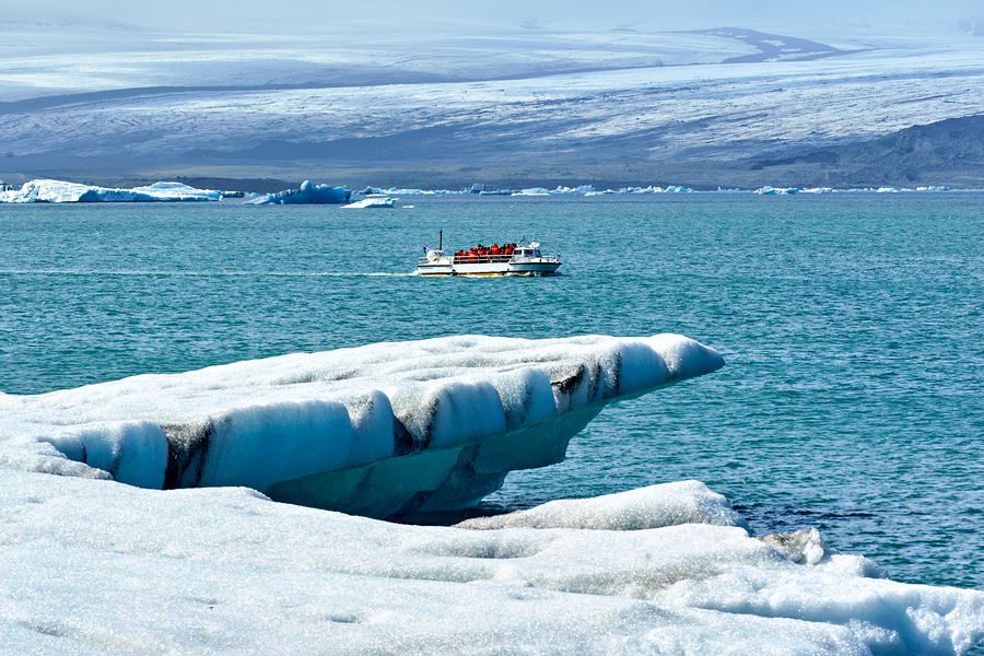 A boat tour is taking place in Jokulsarlon Glacier Lagoon. Icebergs float in the water while visitors enjoy the view.