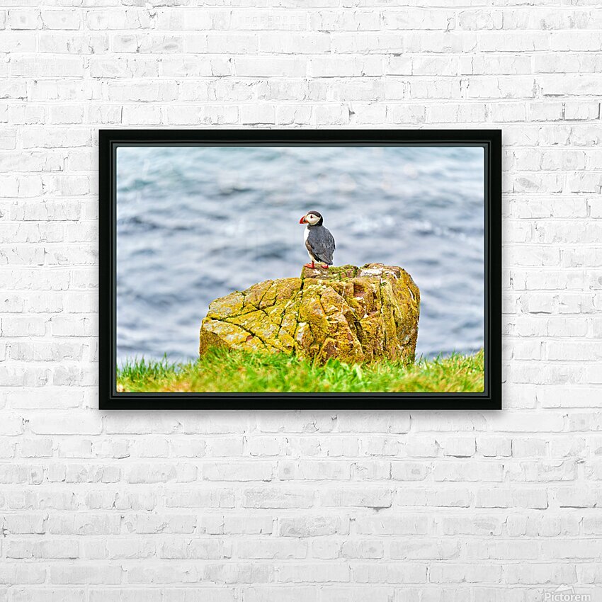 Puffin on rock at Borgarfjordur Eystri in Iceland by the ocean Picture Frame Printing