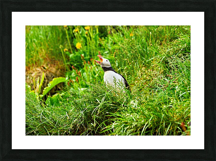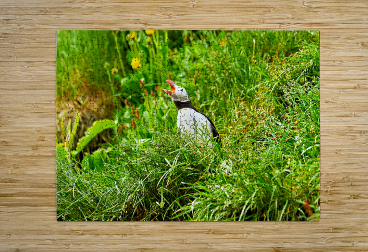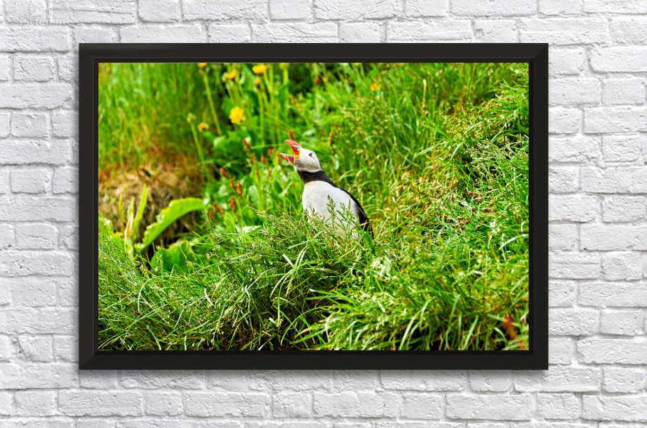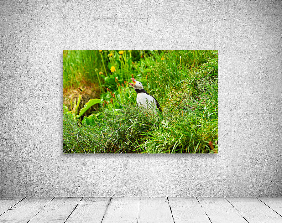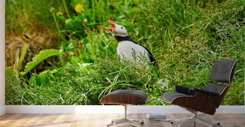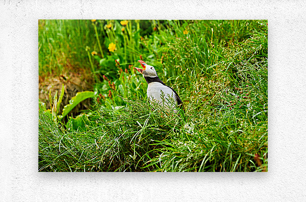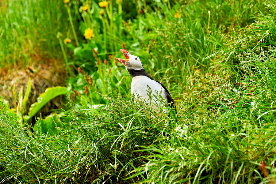 A puffin stands among green grass in Borgarfjordur Eystri Iceland. It makes sounds while looking around and enjoying the summer sun.