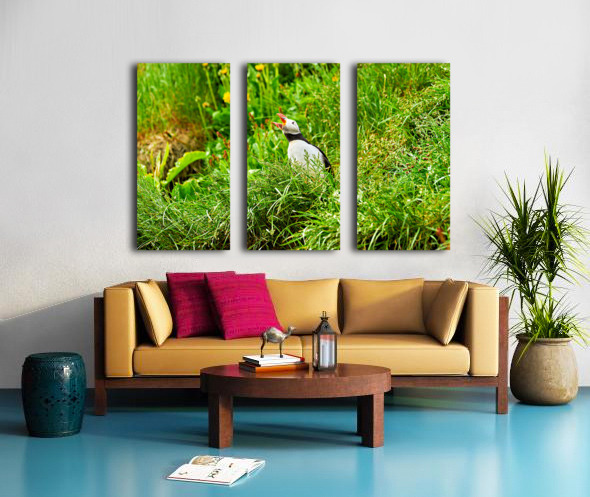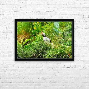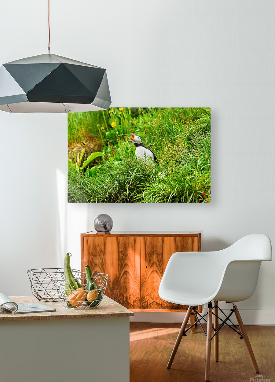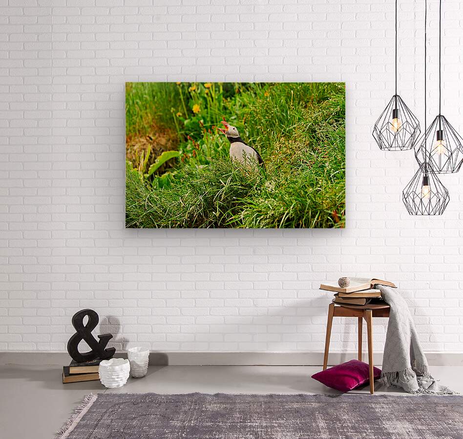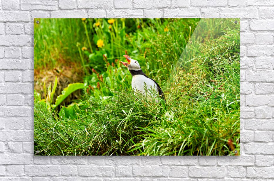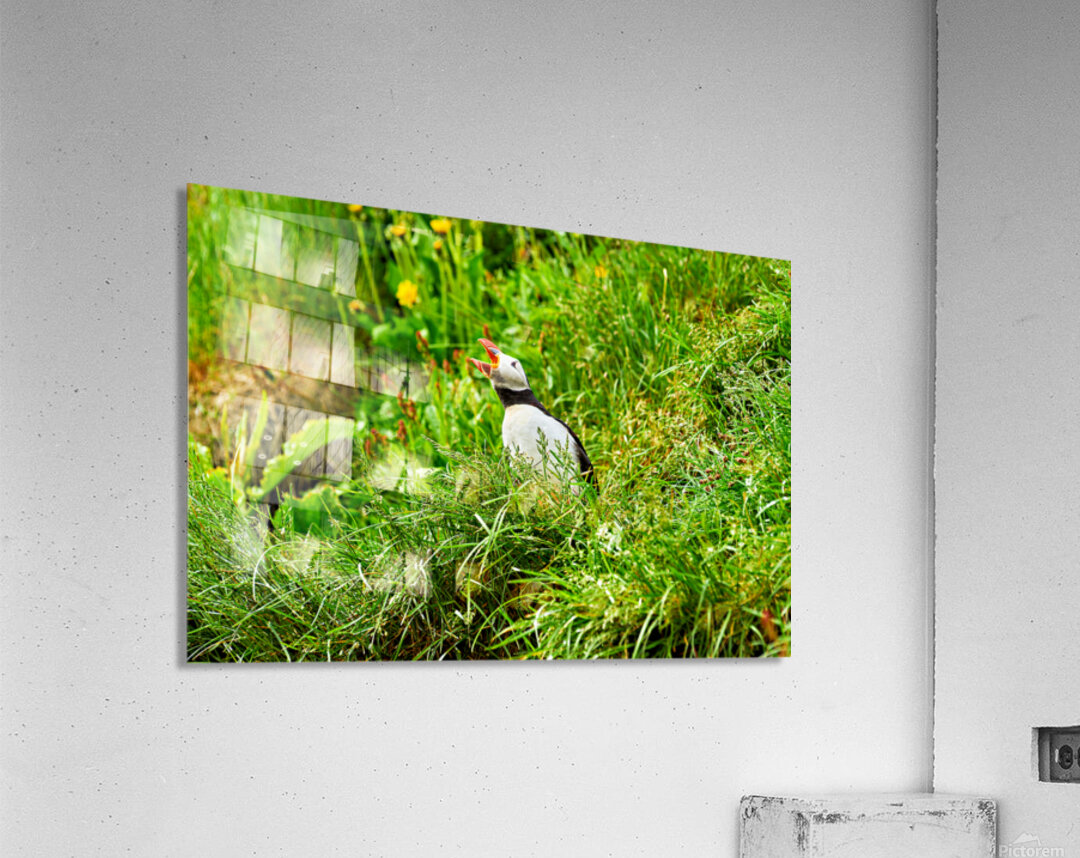 A puffin stands among green grass in Borgarfjordur Eystri Iceland. It makes sounds while looking around and enjoying the summer sun.