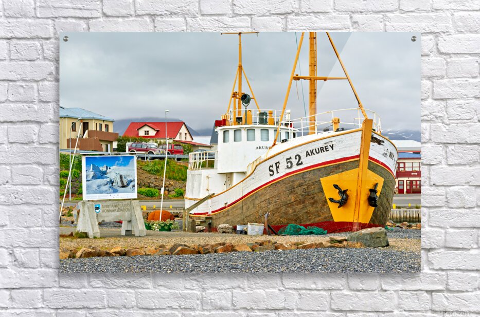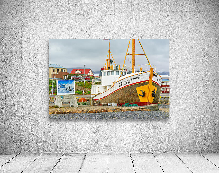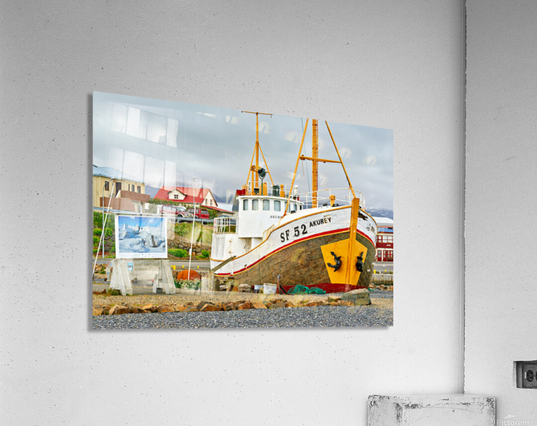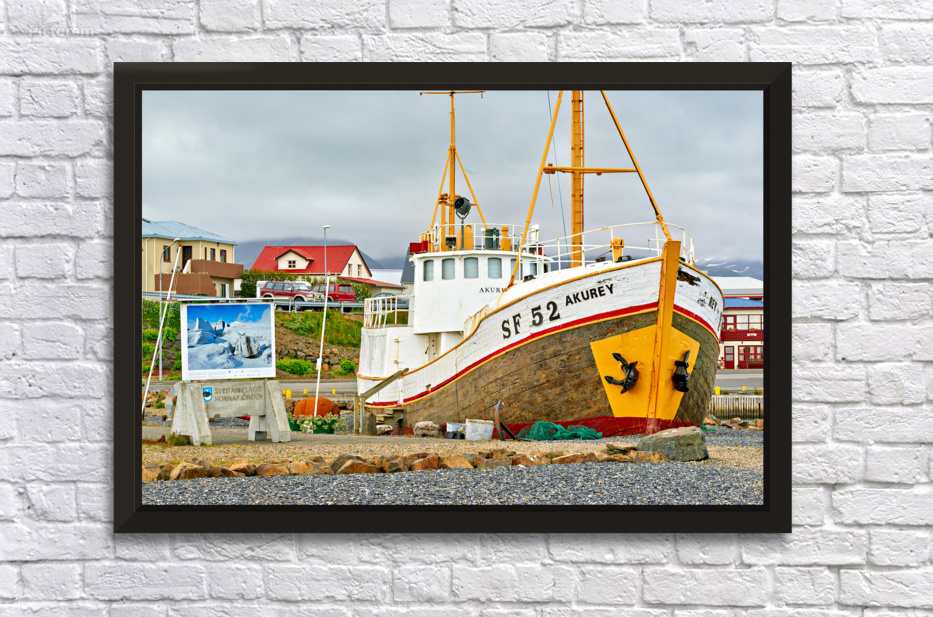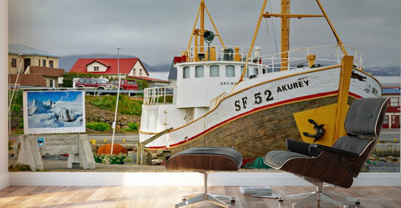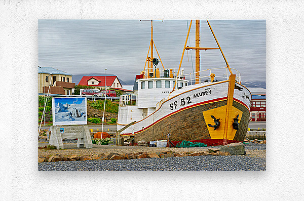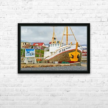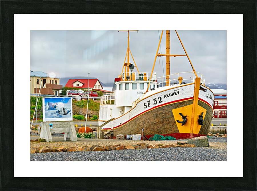A fishing boat is docked at Hofn harbor in Iceland Hornafjordur. A sign nearby shows information about the area. Buildings stand in the background.