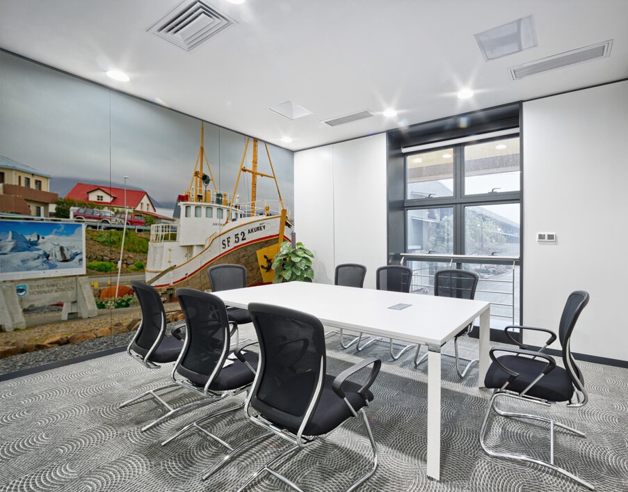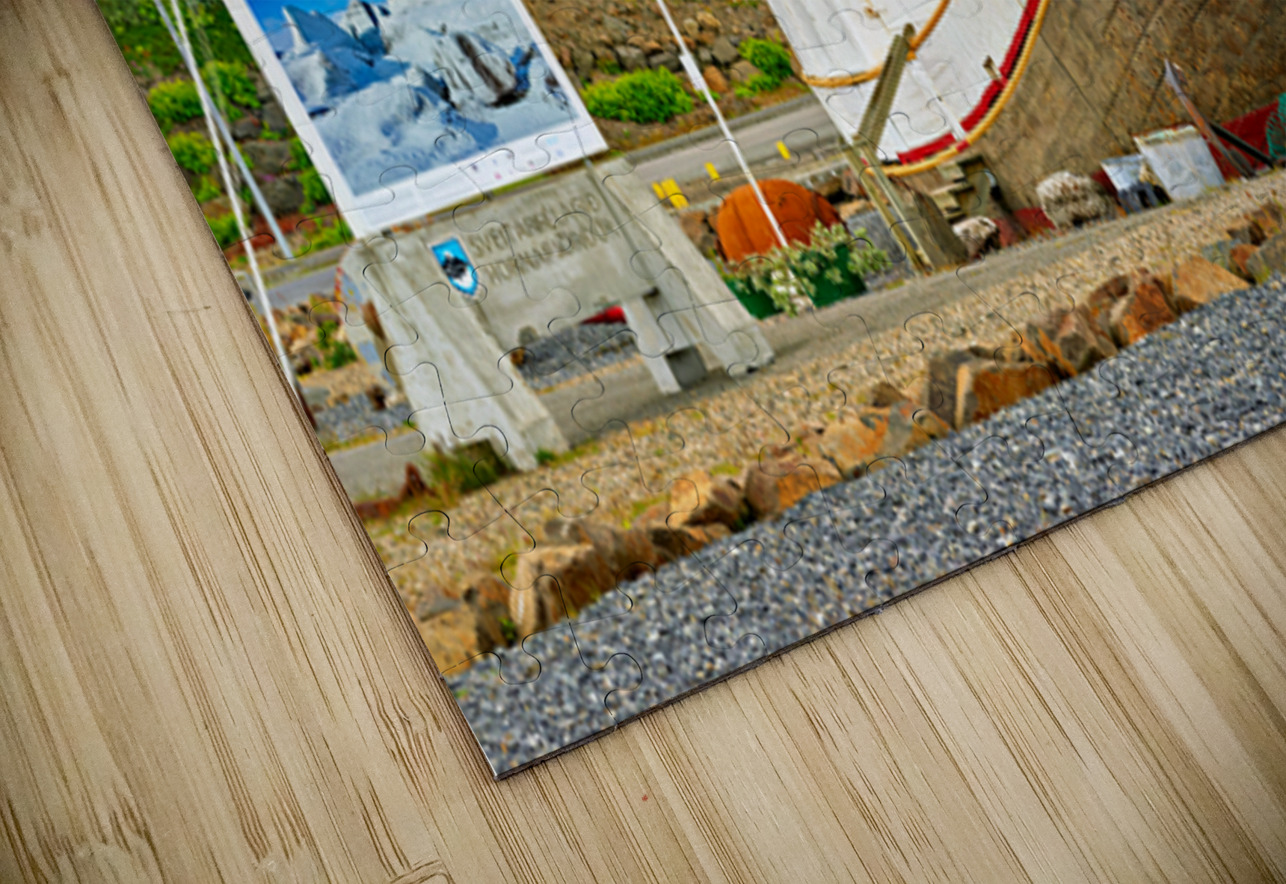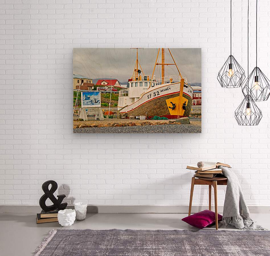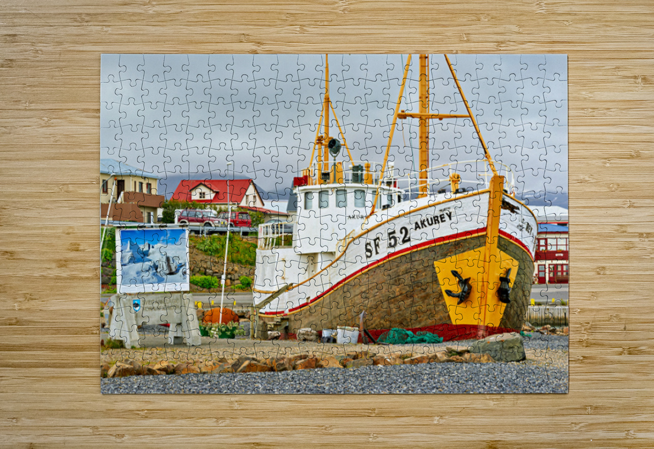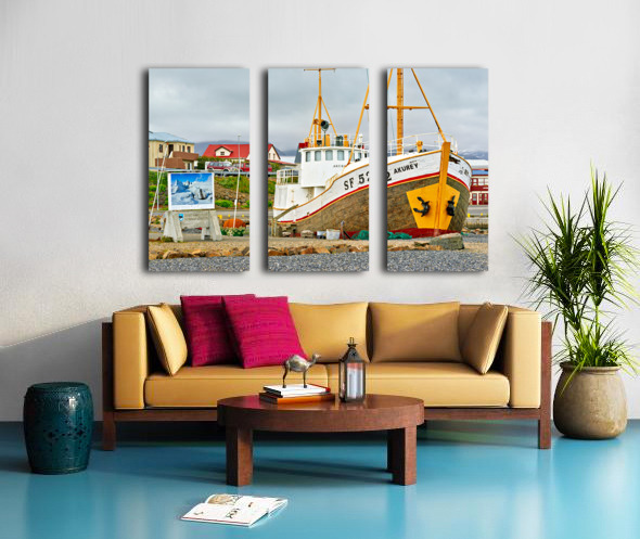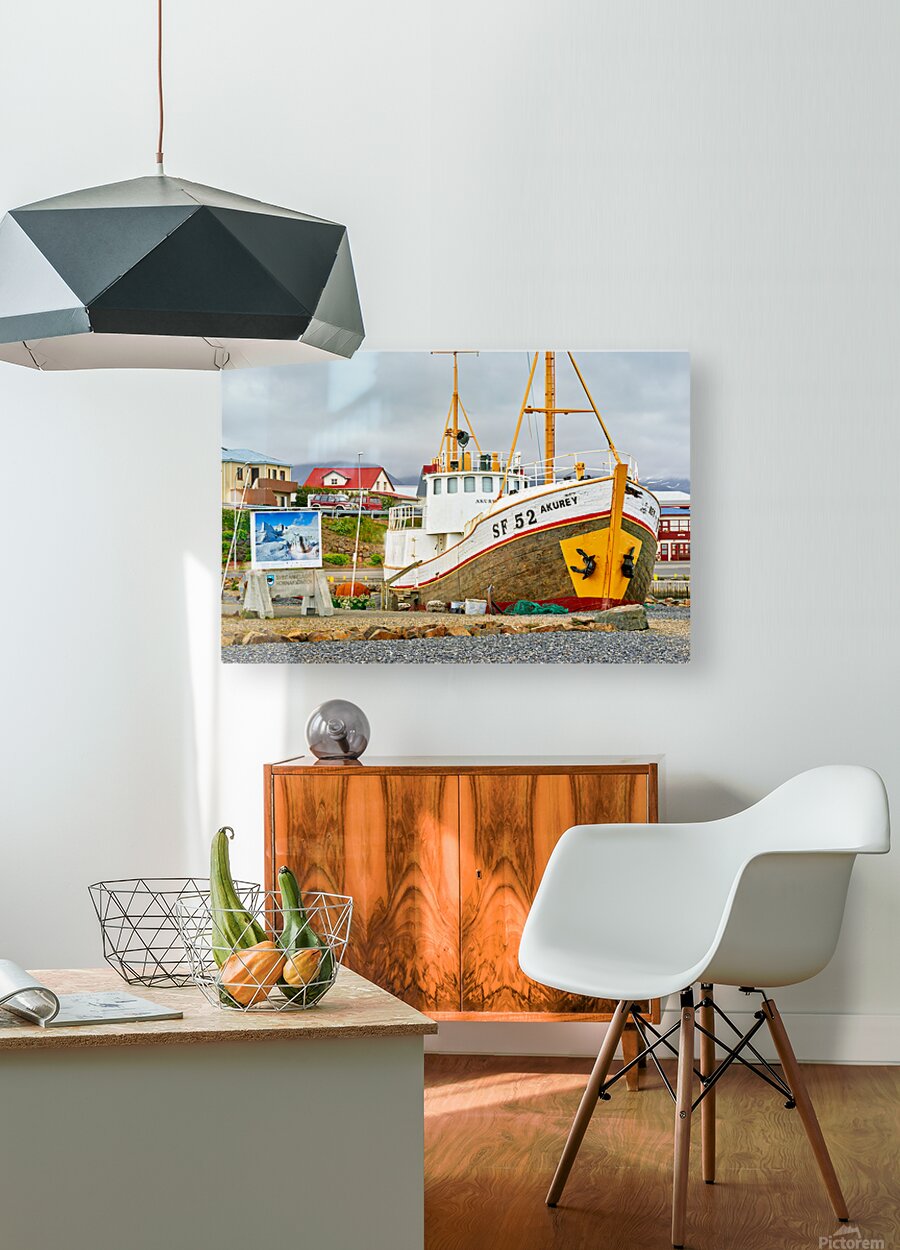 A fishing boat is docked at Hofn harbor in Iceland Hornafjordur. A sign nearby shows information about the area. Buildings stand in the background.