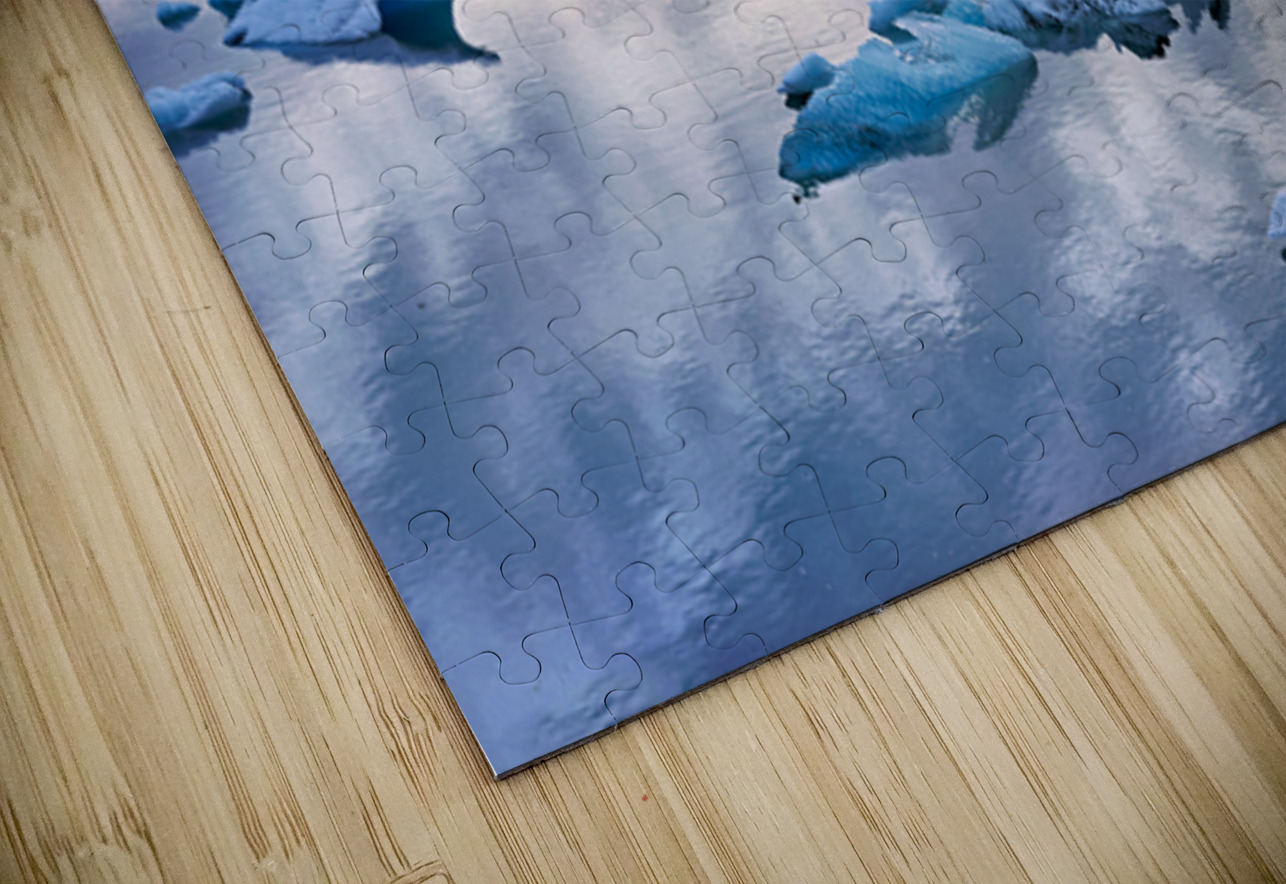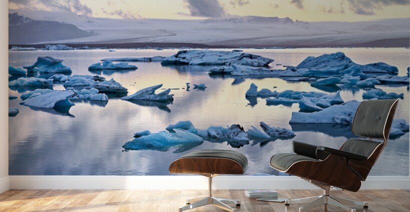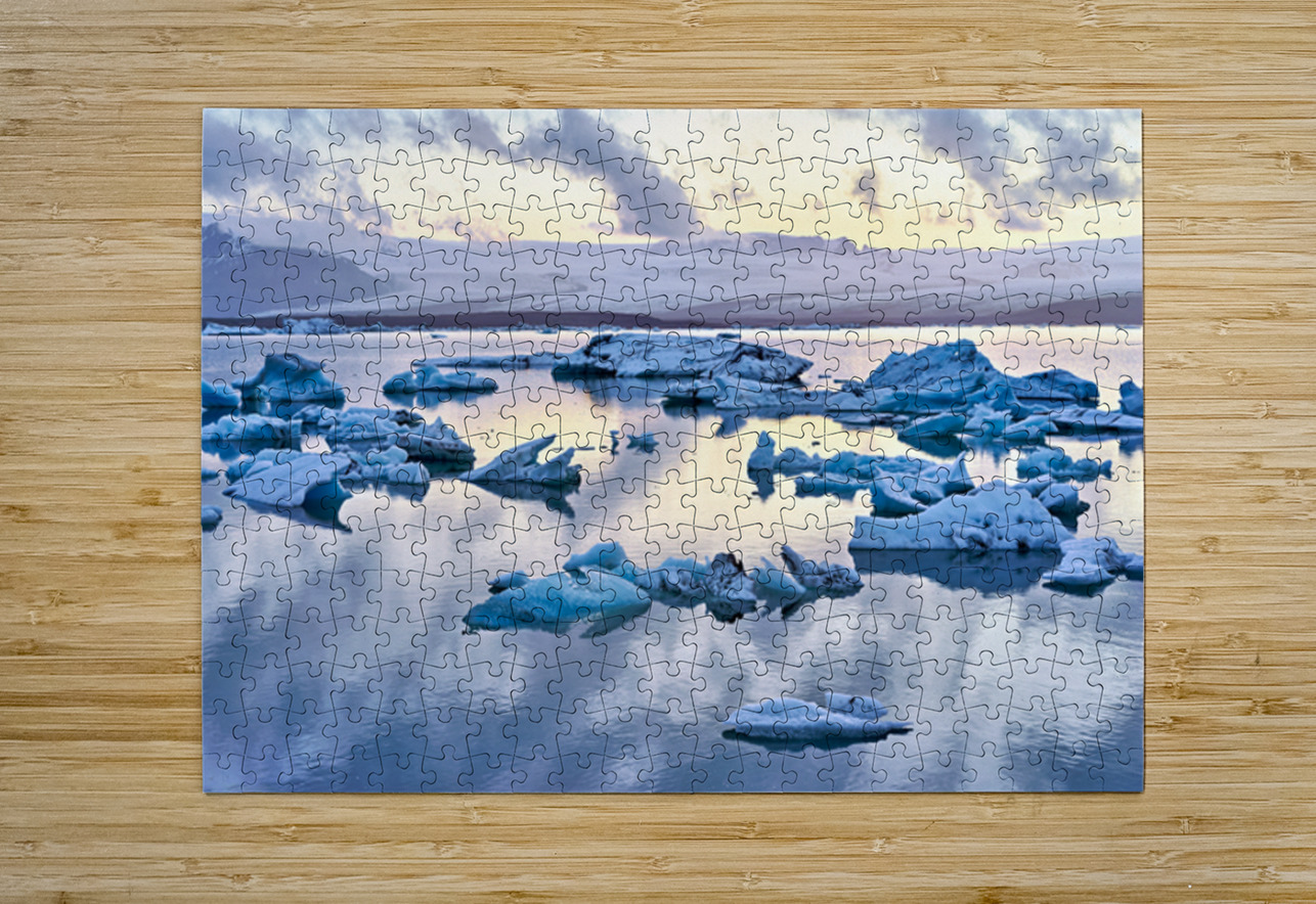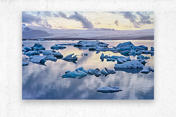 Icebergs float in Jokulsarlon glacier lagoon at midnight. The water reflects the light from the sky. Clouds cover the horizon.