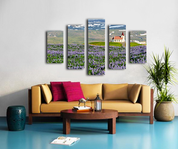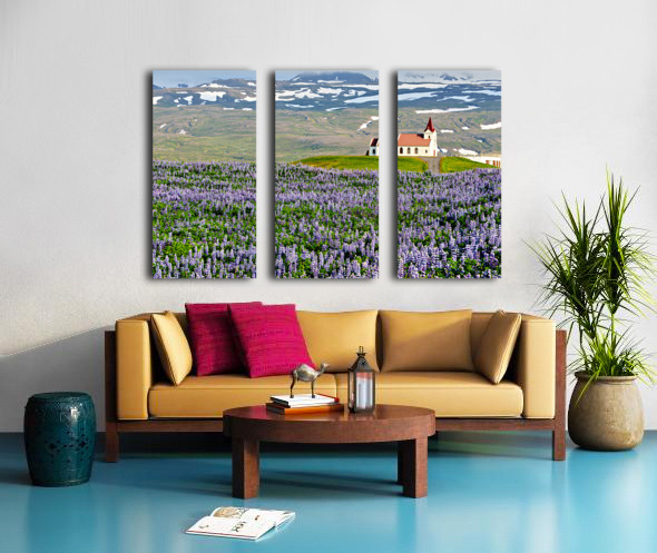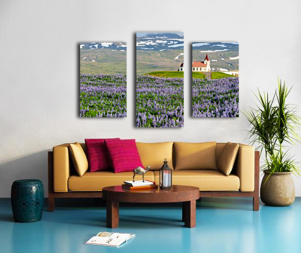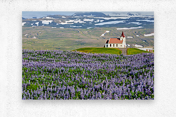 Get this artwork "Ingjaldsoll church stands in a field of flowers in Iceland" in a framed print.