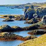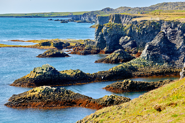 Visitors walk along the rugged cliffs of Arnarstapi in Iceland overlooking the ocean and unique rock formations in bright daylight.