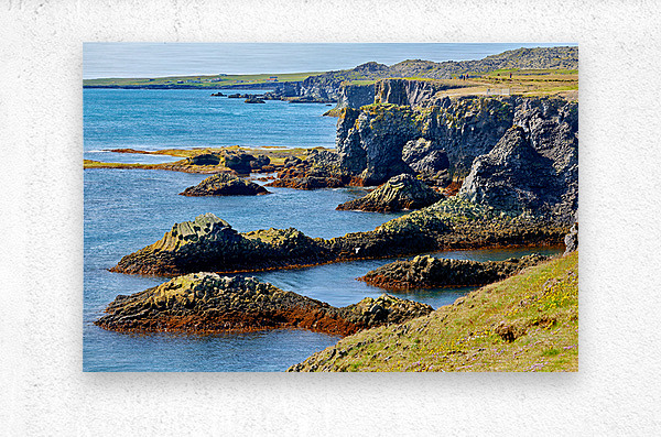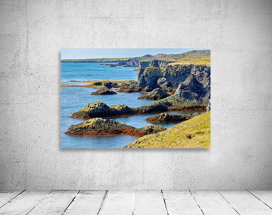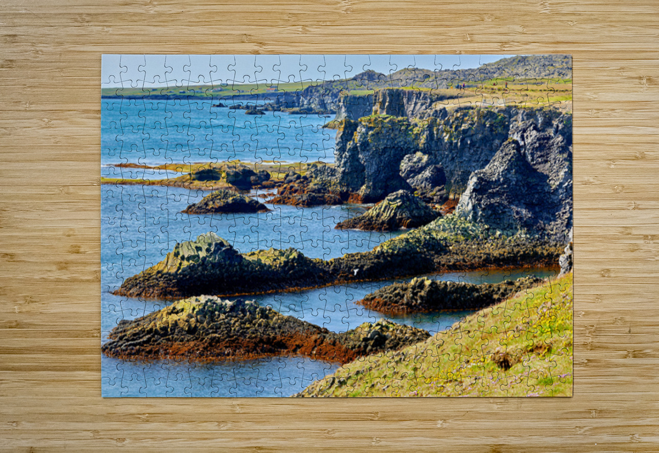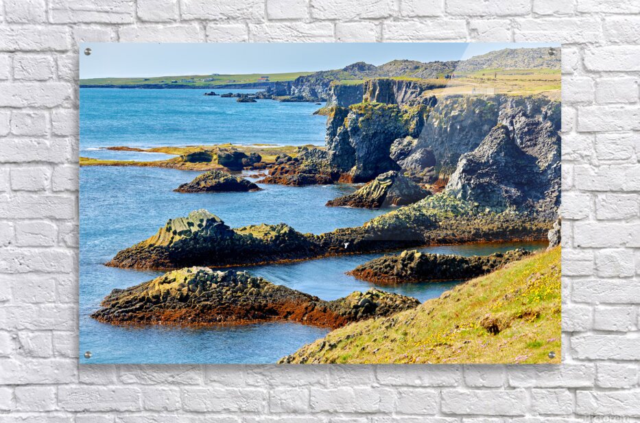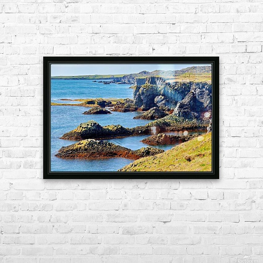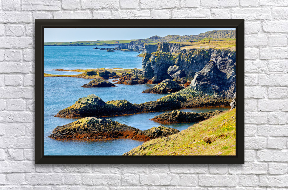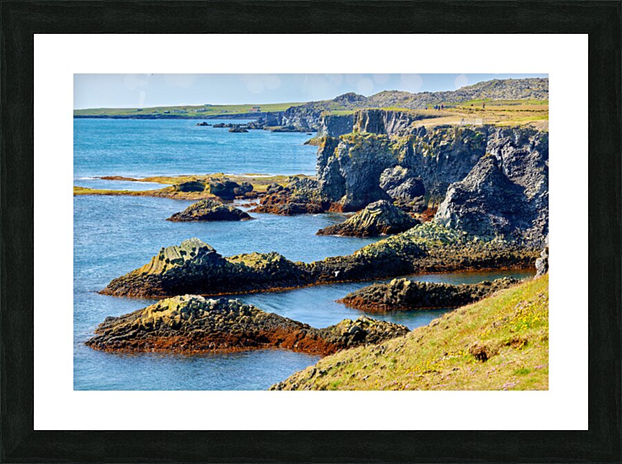 "Exploring Arnarstapi cliffs in Iceland by the ocean" in a framed print.