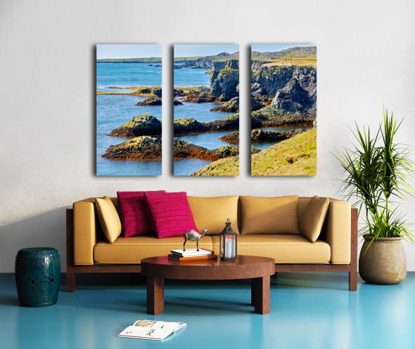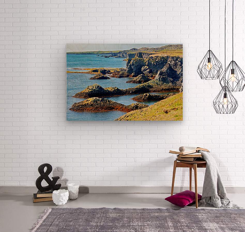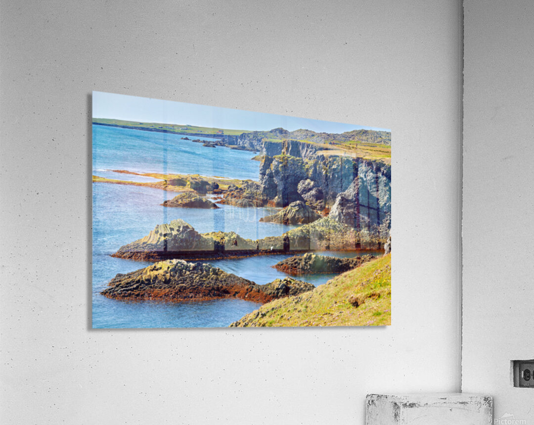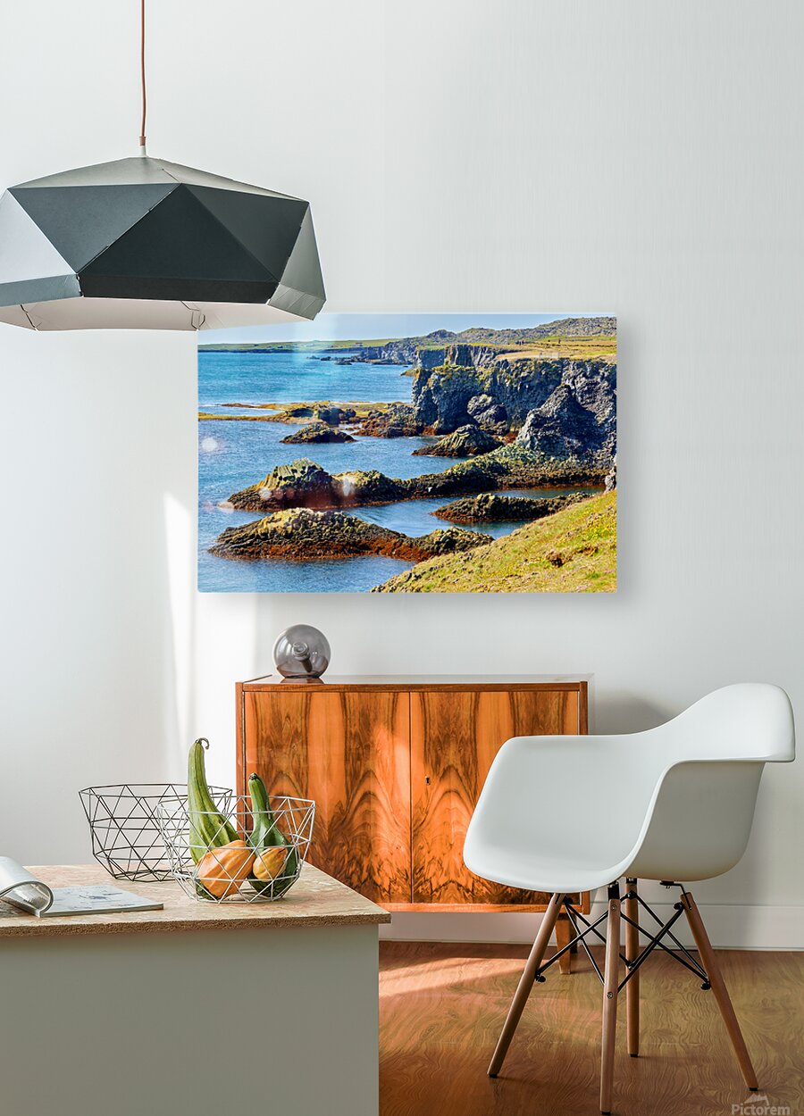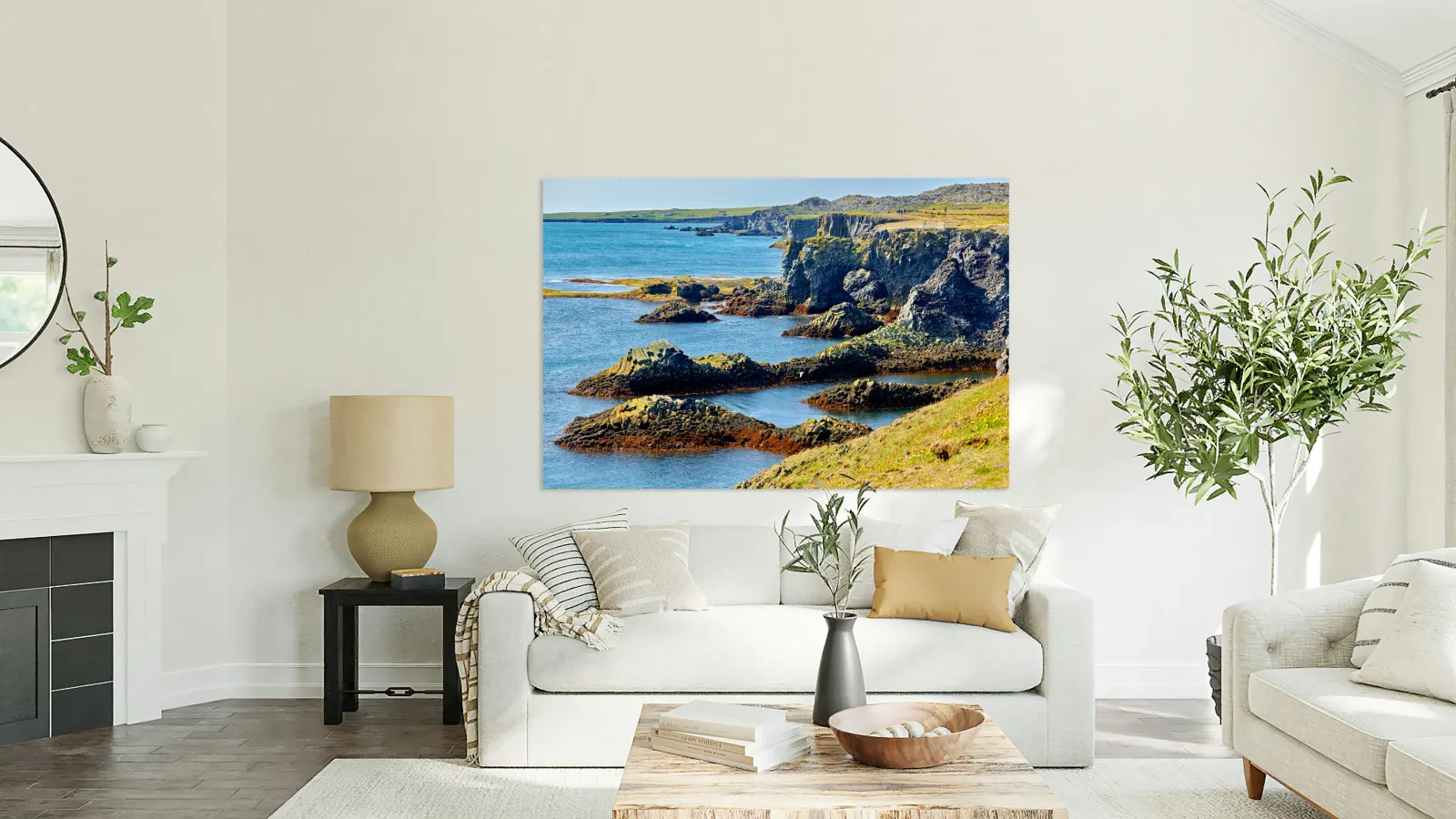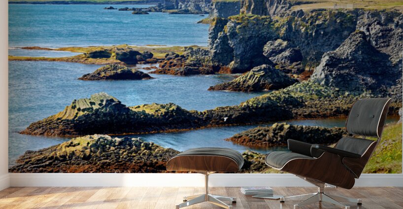 "Exploring Arnarstapi cliffs in Iceland by the ocean" in a framed print.