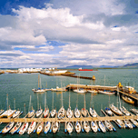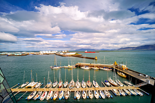 The harbor in Reykjavik shows several sailing boats docked and distant ships on the water under cloudy skies.